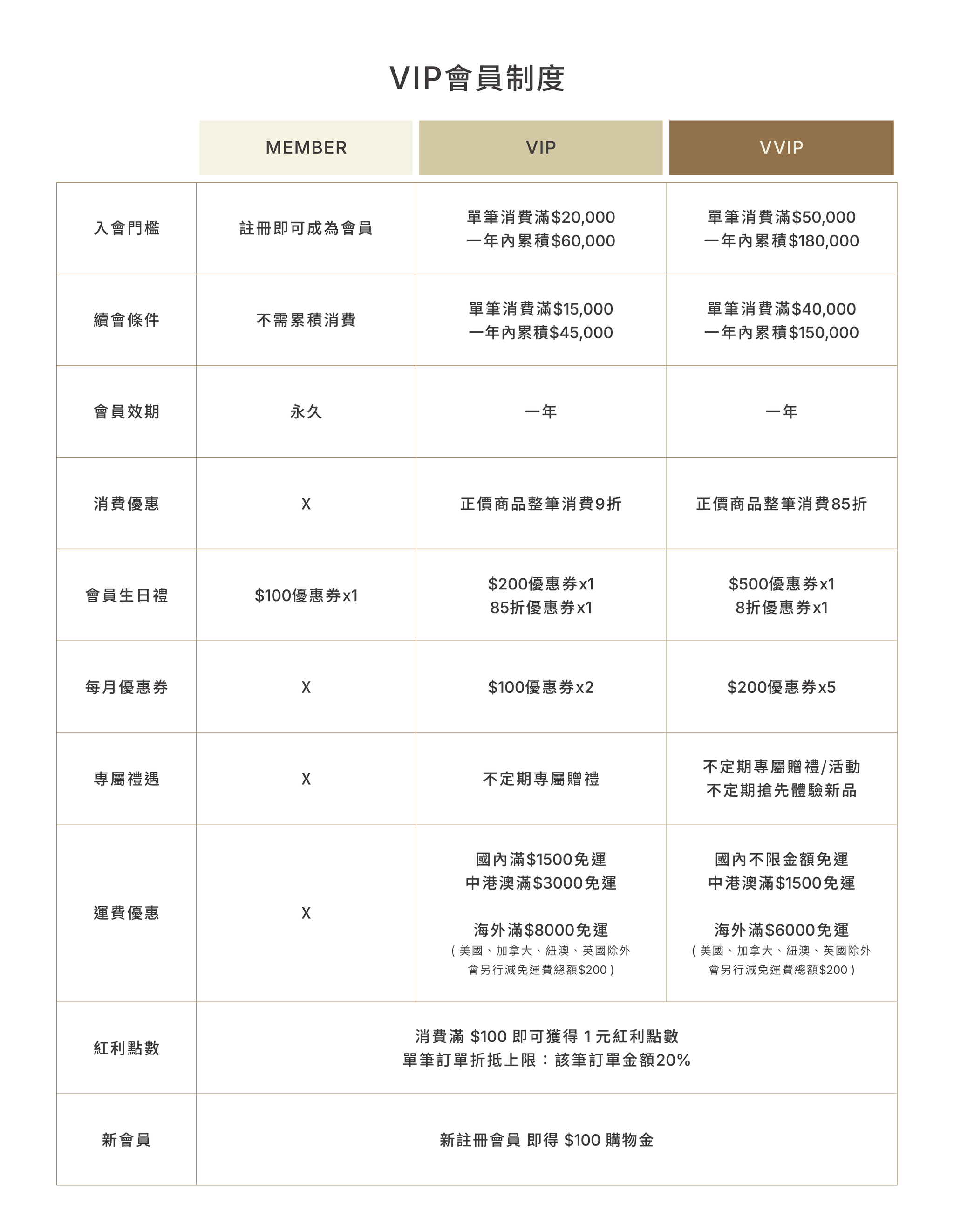 VIP資格 : 單筆消費滿 $20,000 或 一年內消費累積滿 $60,000