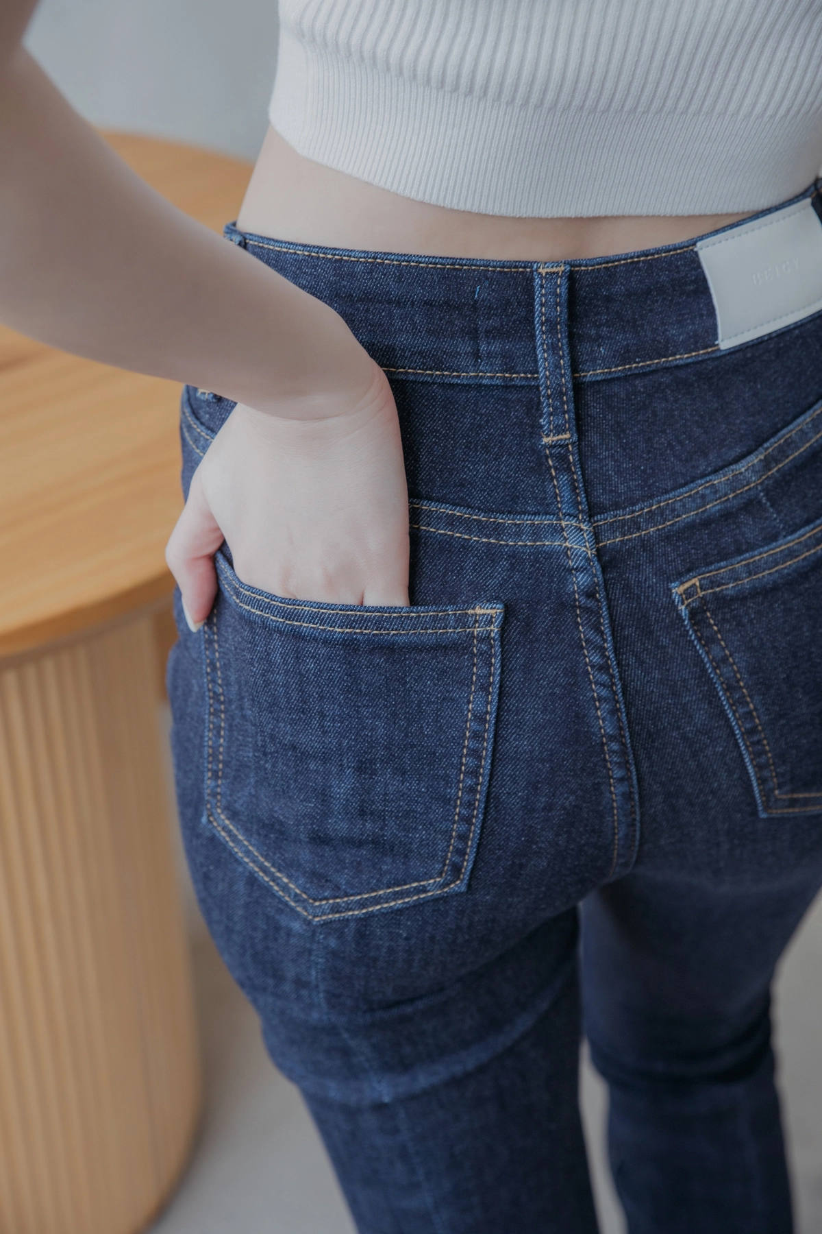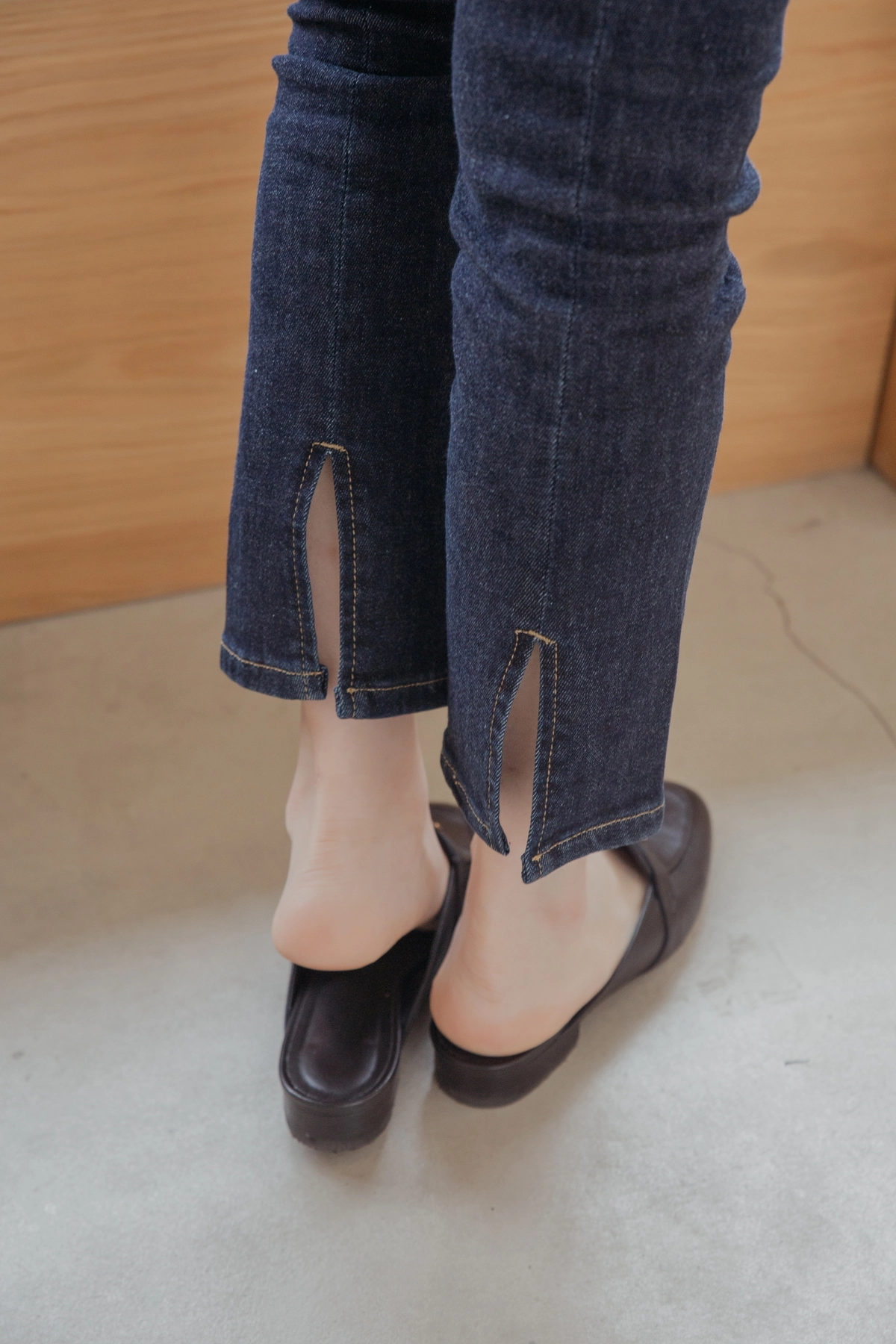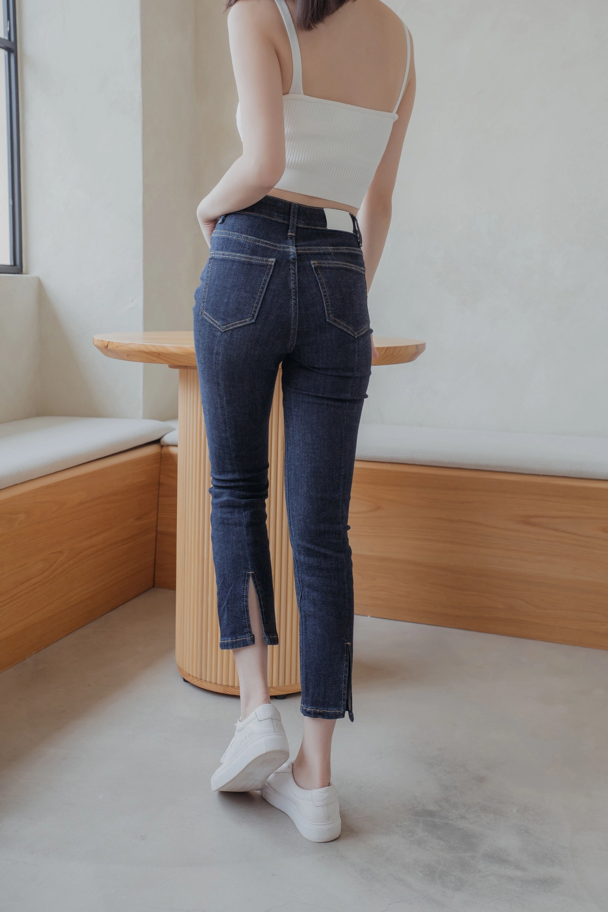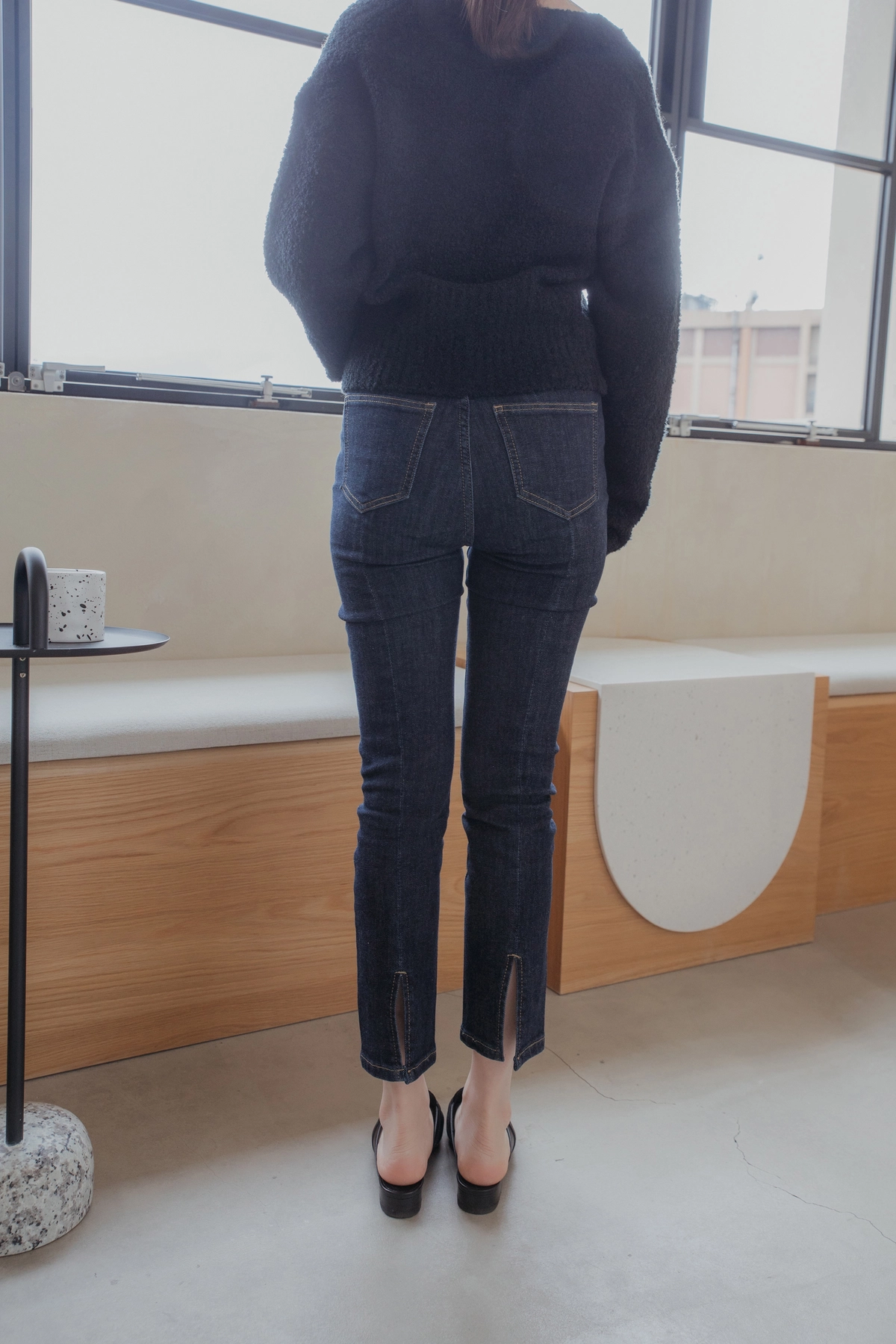 Beigy自訂款-設計感後開衩九分牛仔褲-深藍
