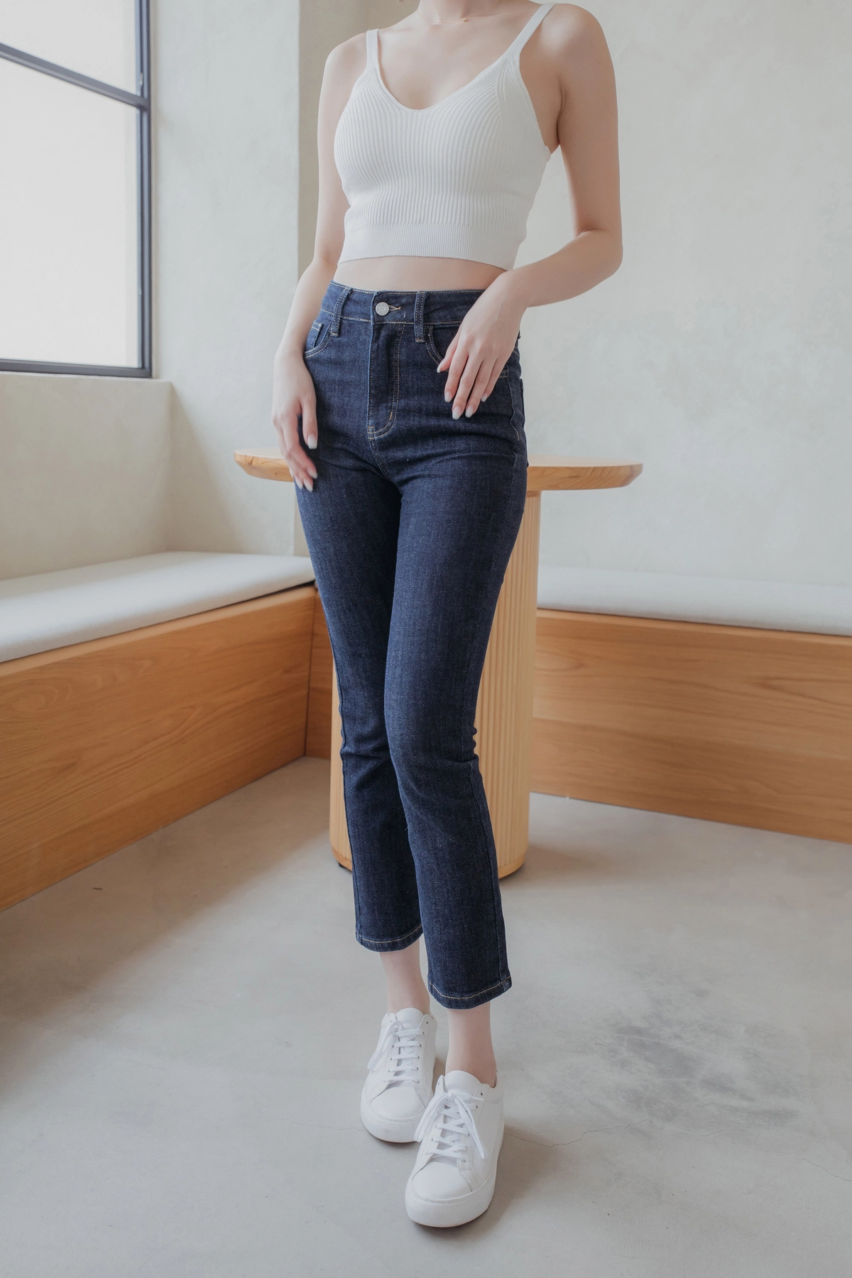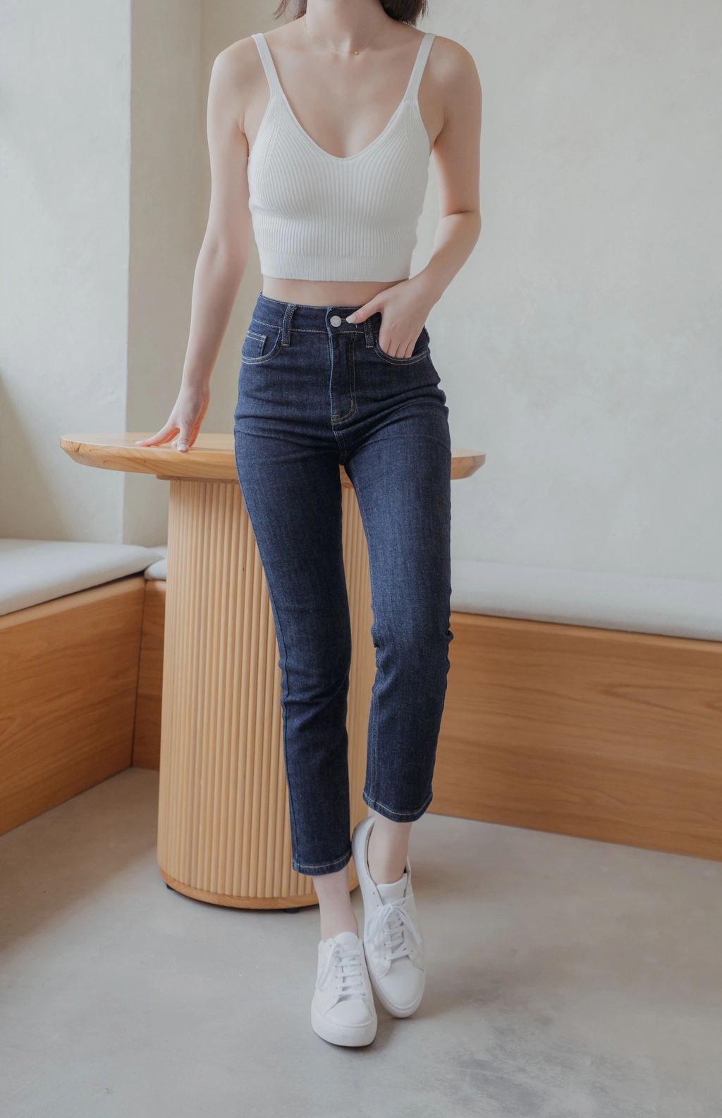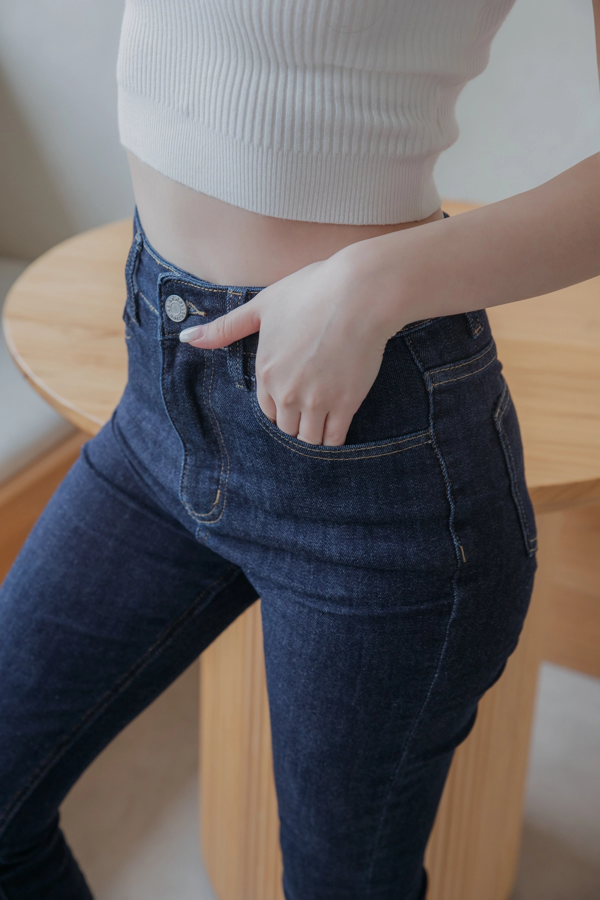 Beigy自訂款-設計感後開衩九分牛仔褲-深藍