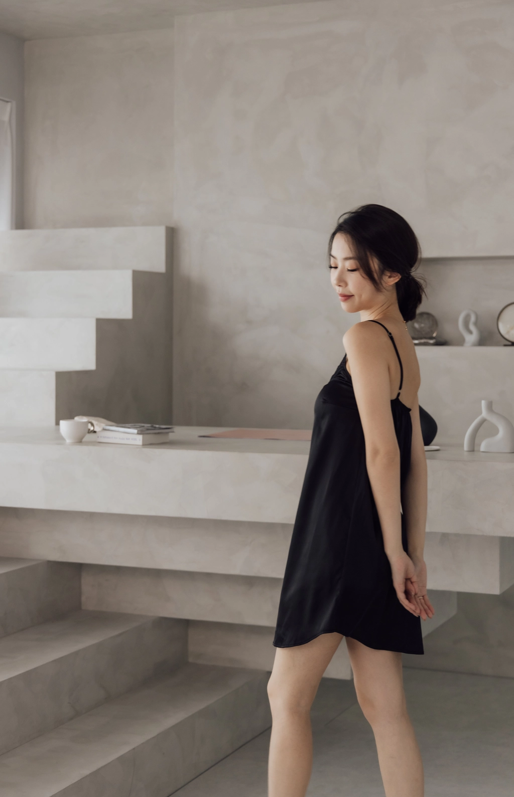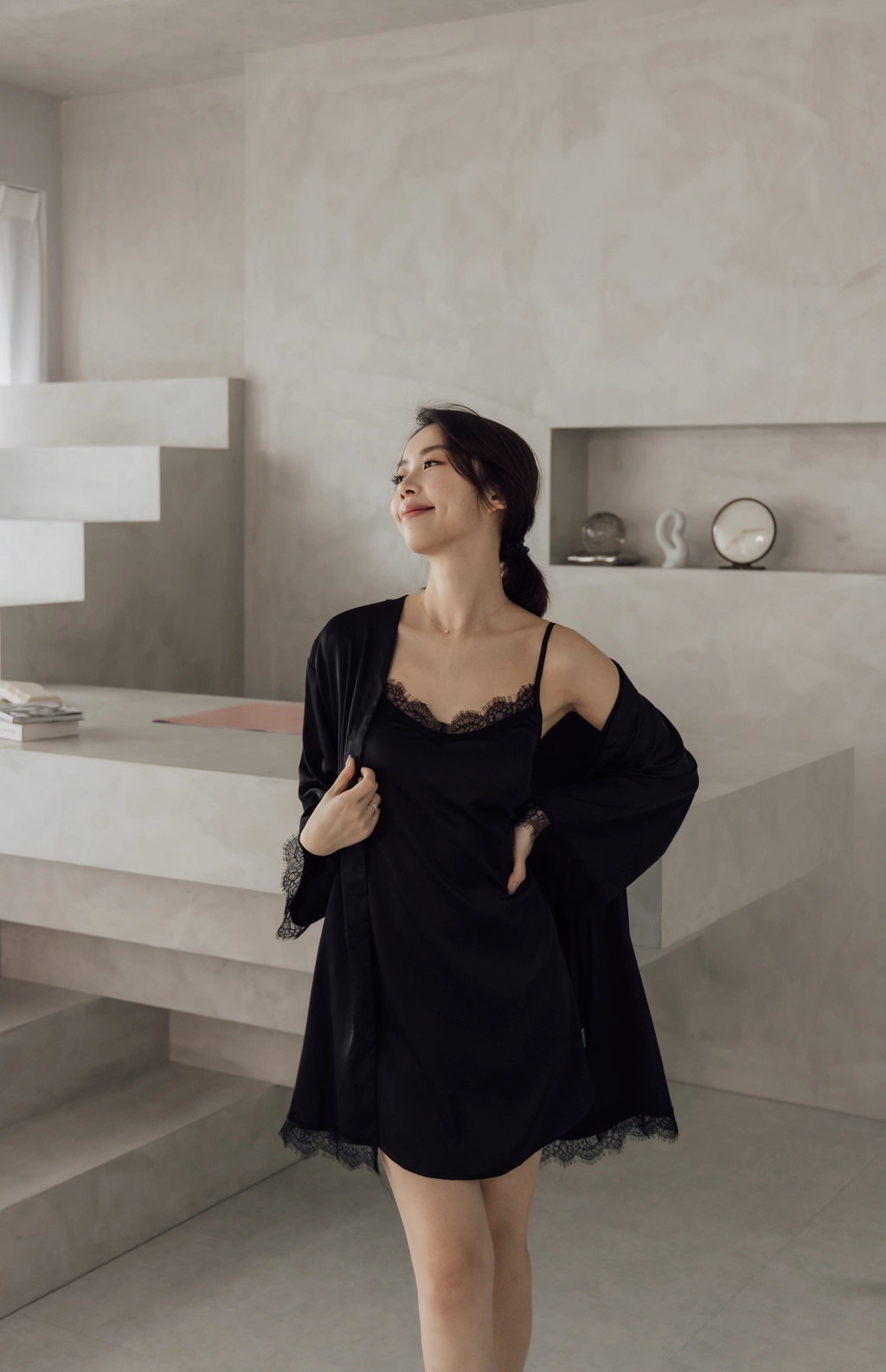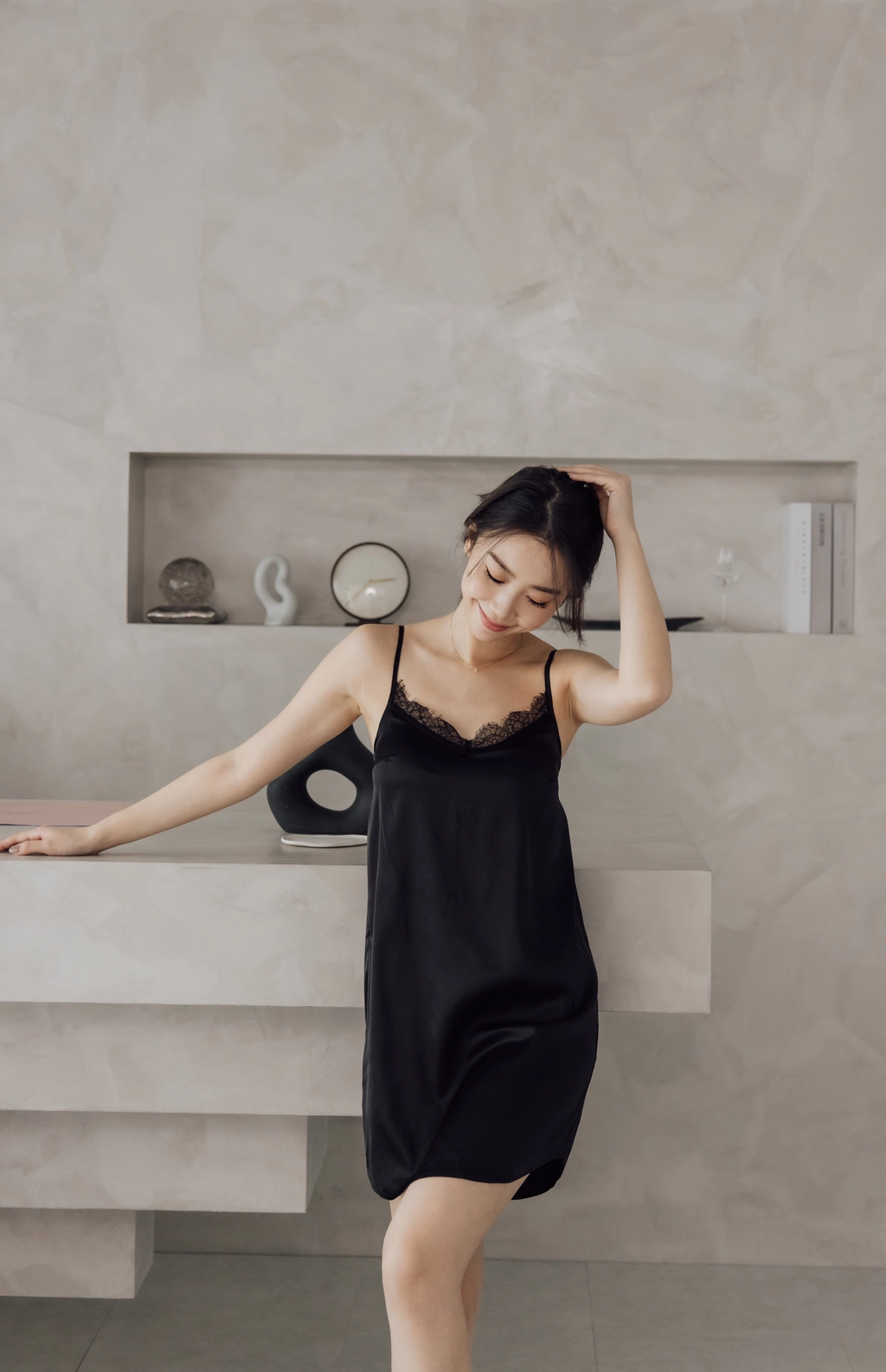 WOMAN緞面蕾絲Bra Top睡裙-經典黑