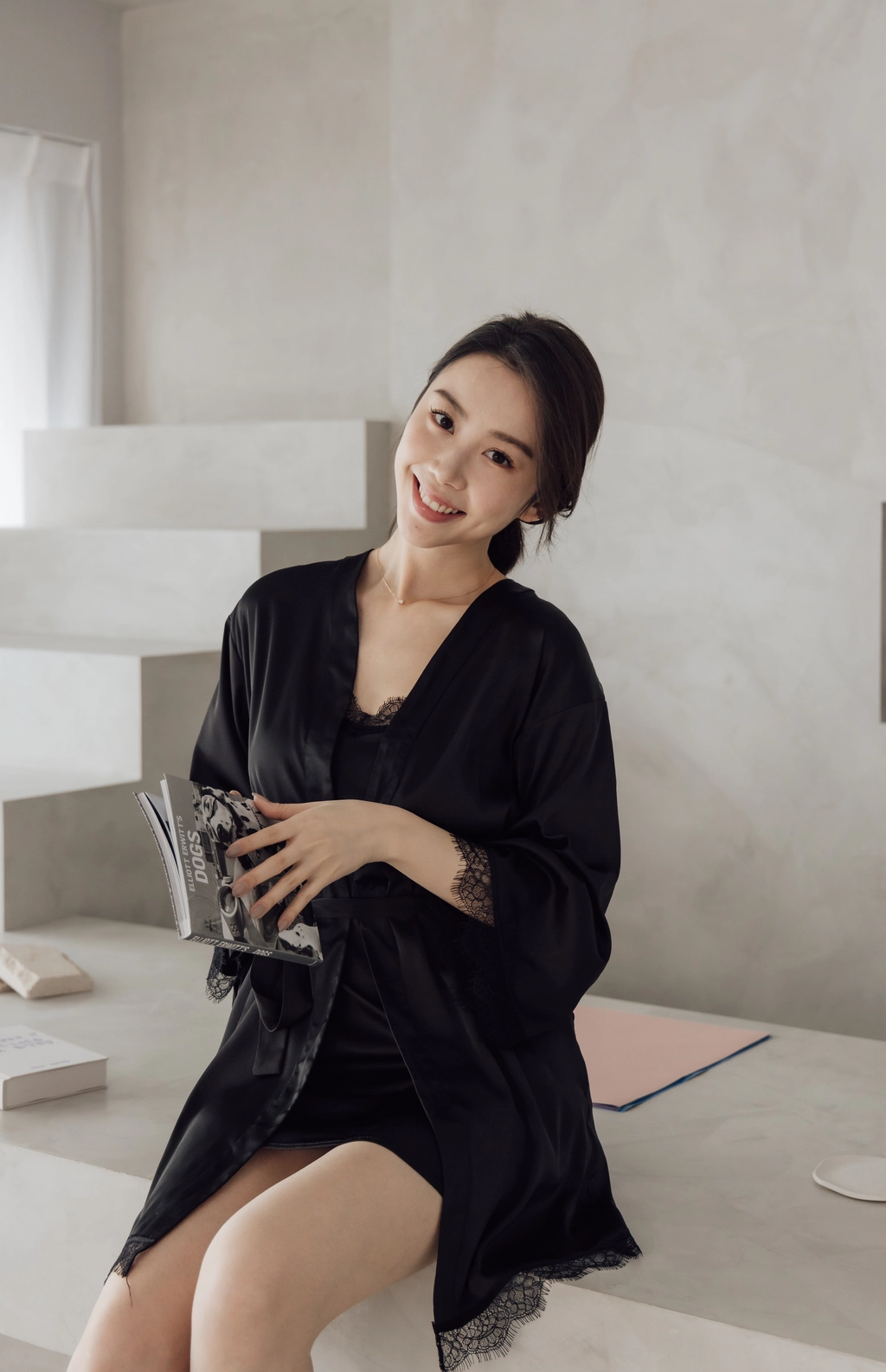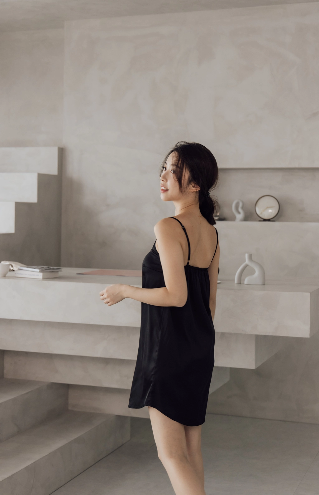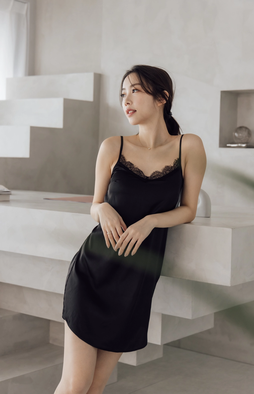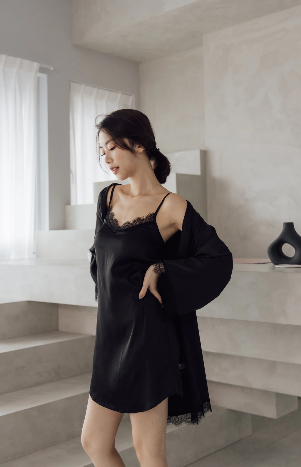 WOMAN緞面蕾絲Bra Top睡裙-經典黑