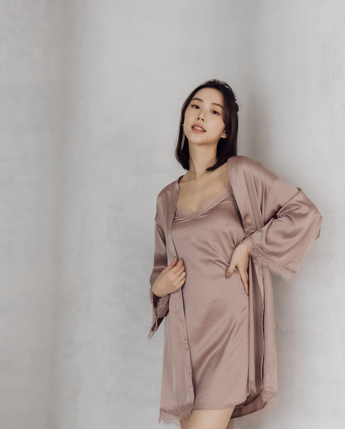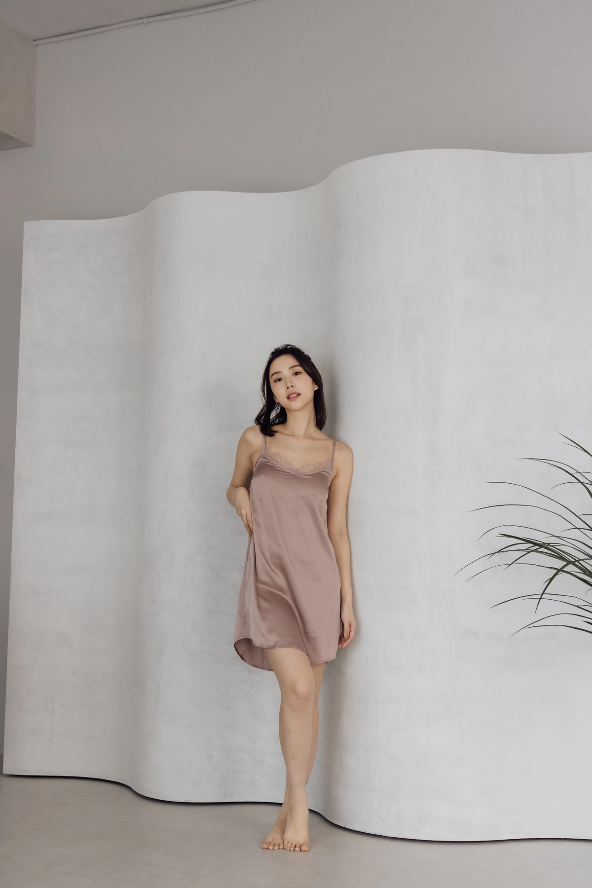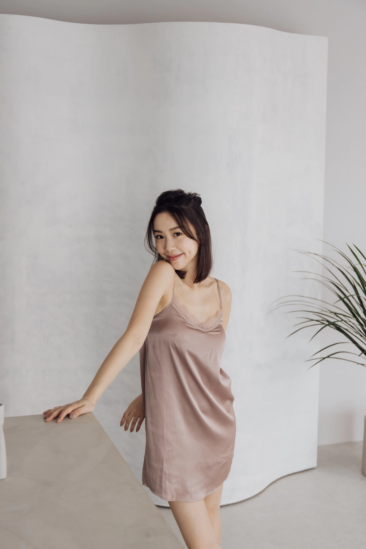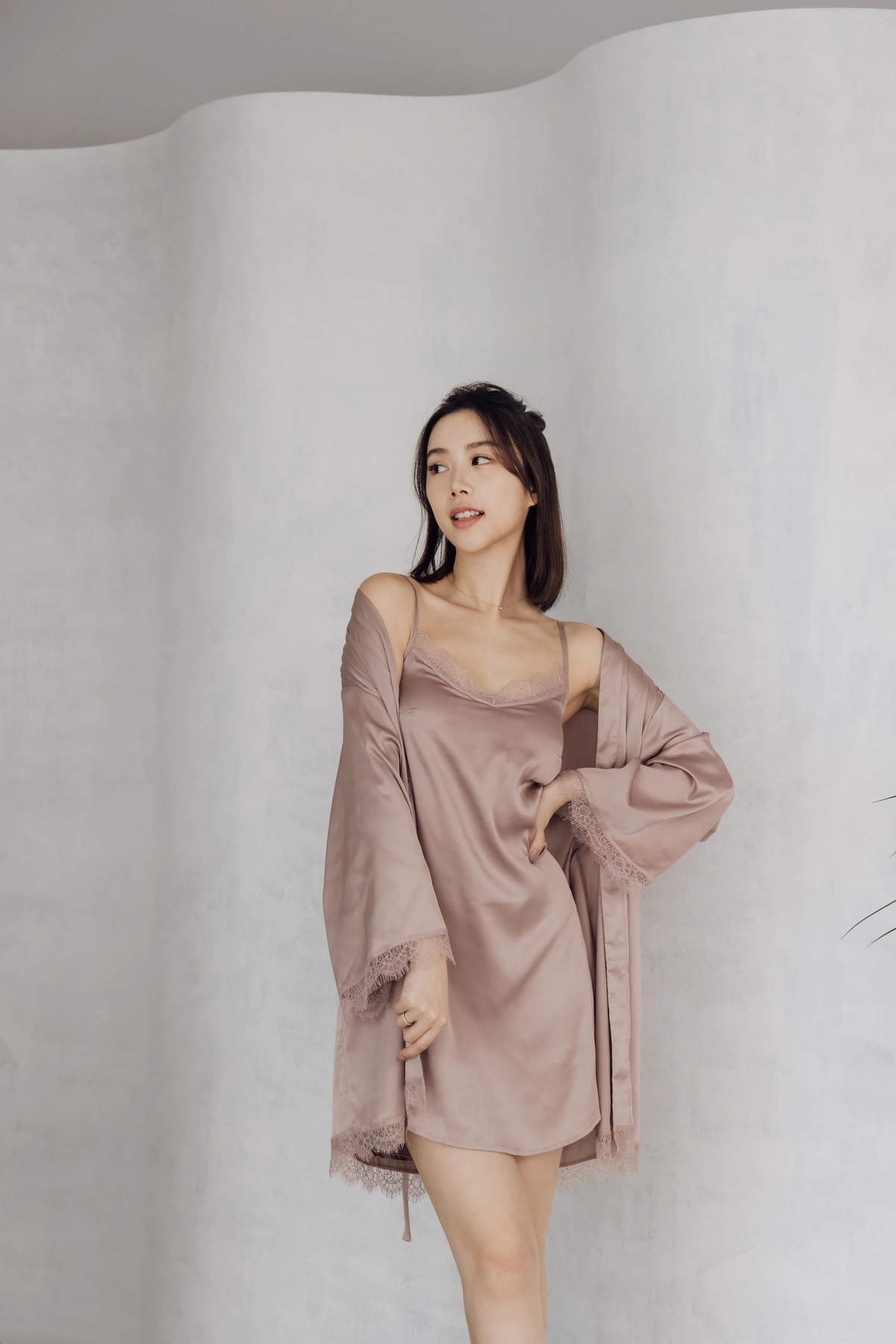 WOMAN緞面蕾絲Bra Top睡裙-煙灰粉