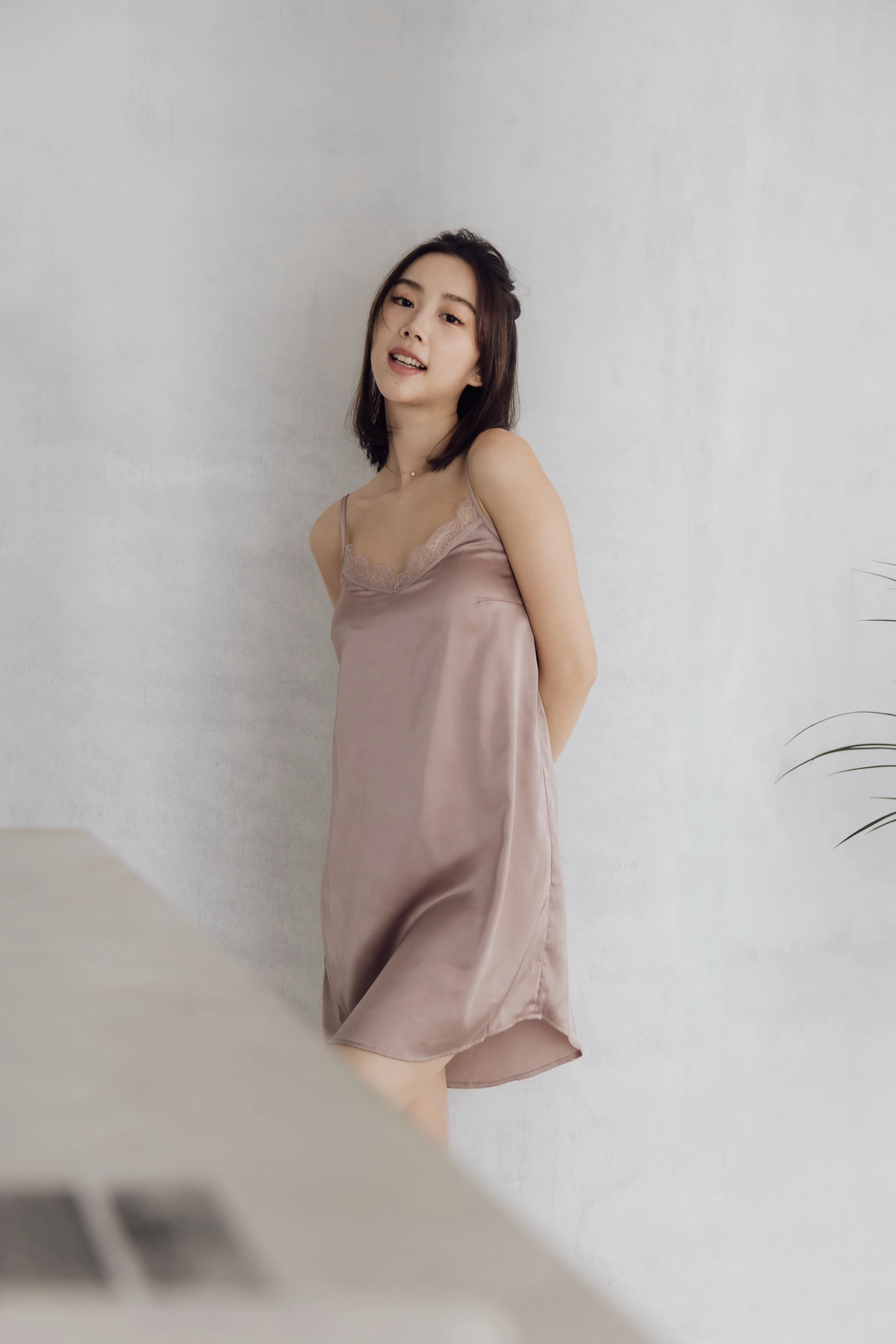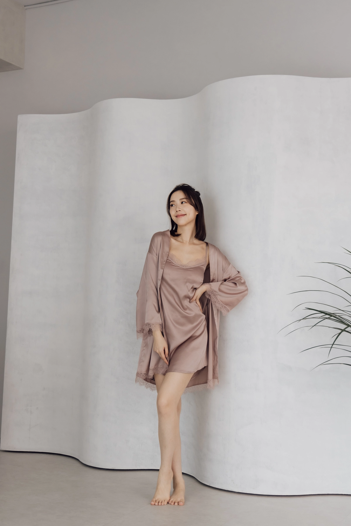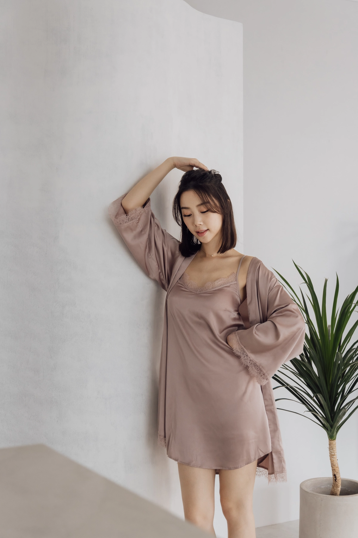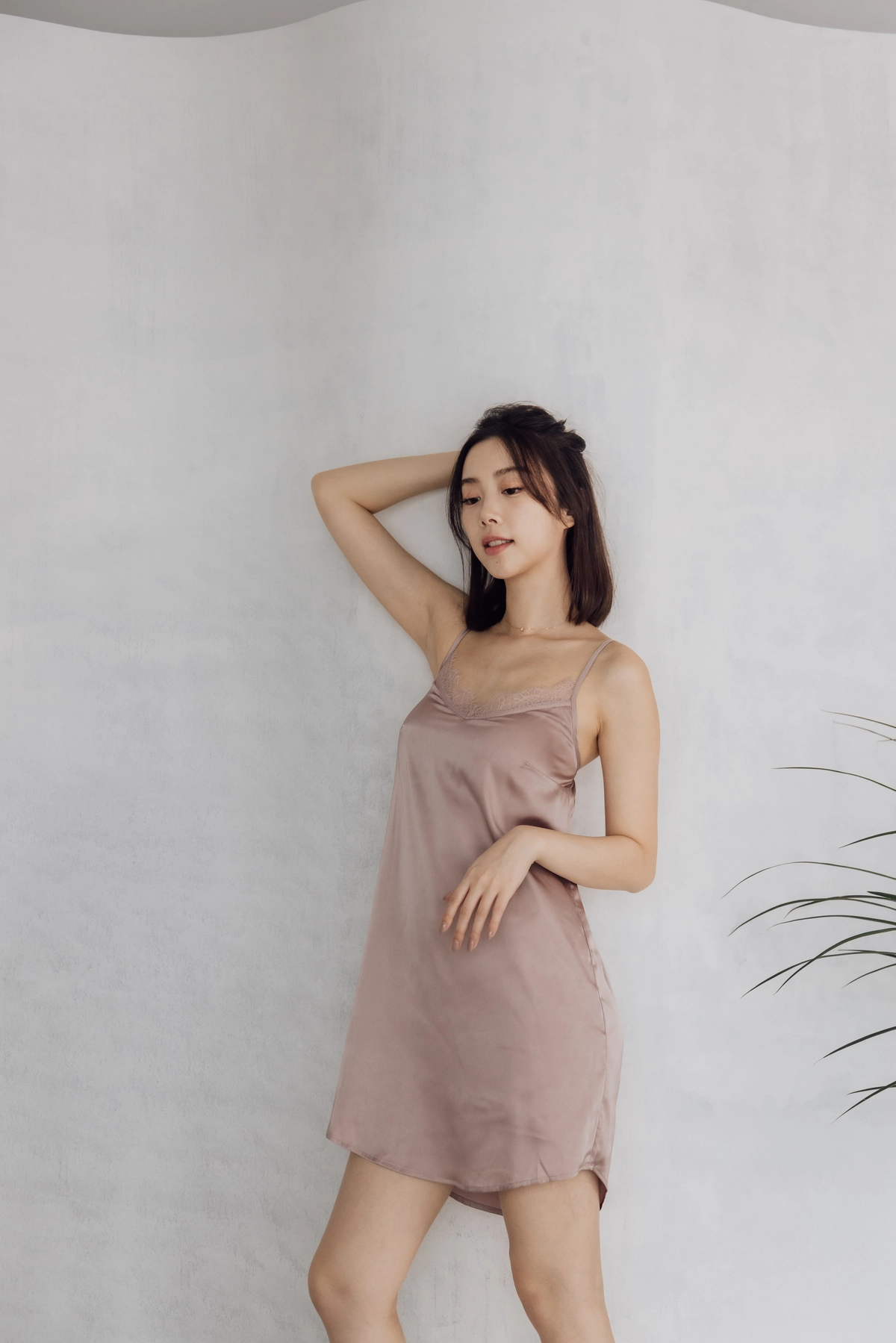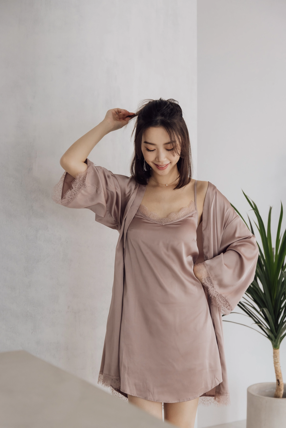 WOMAN緞面蕾絲Bra Top睡裙-煙灰粉