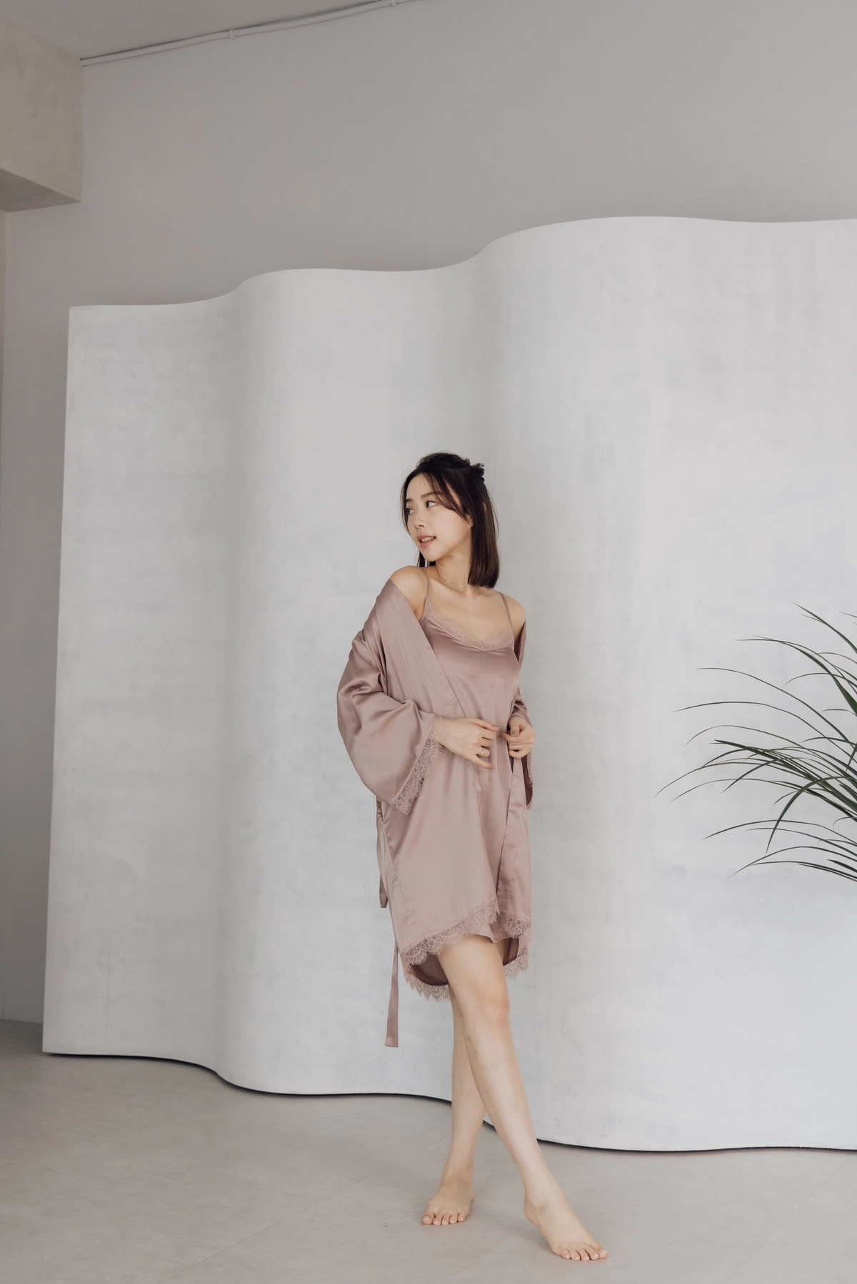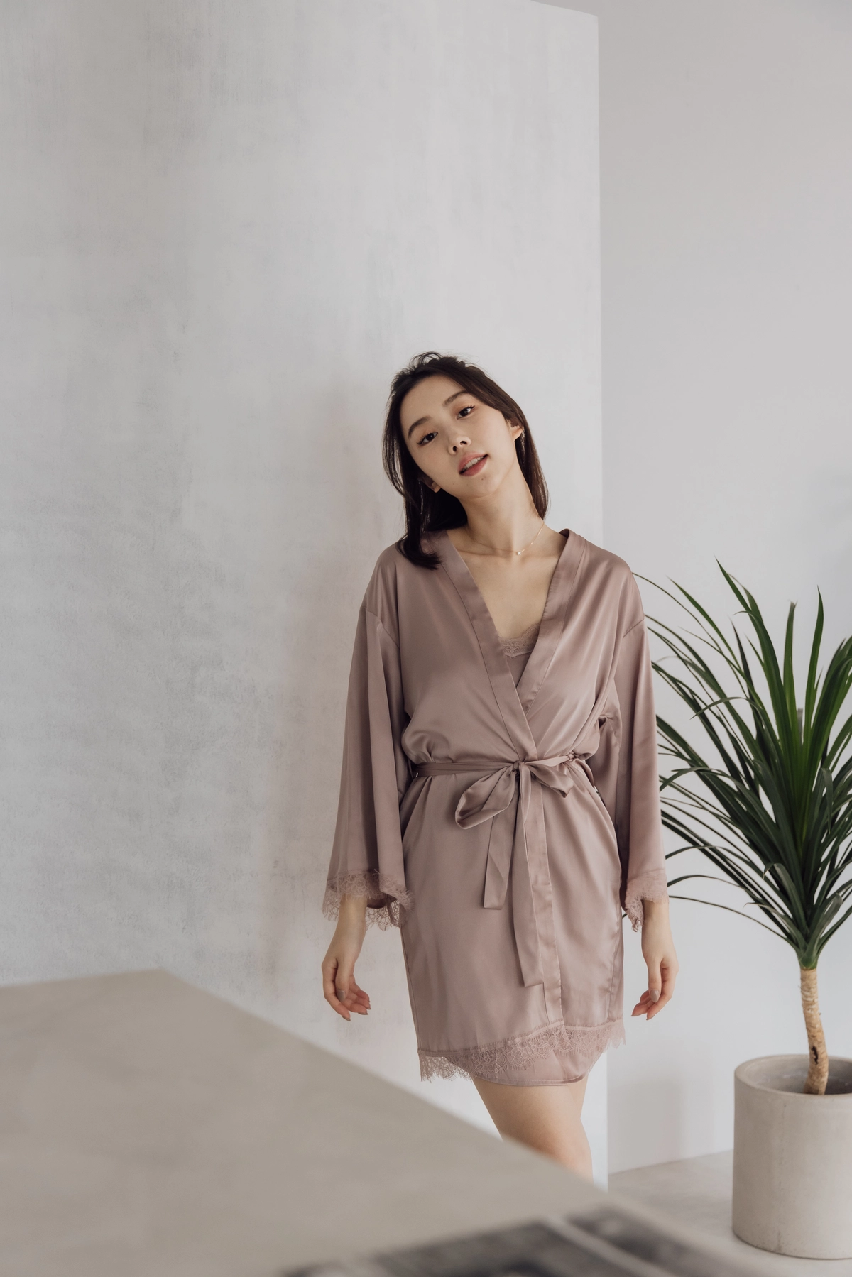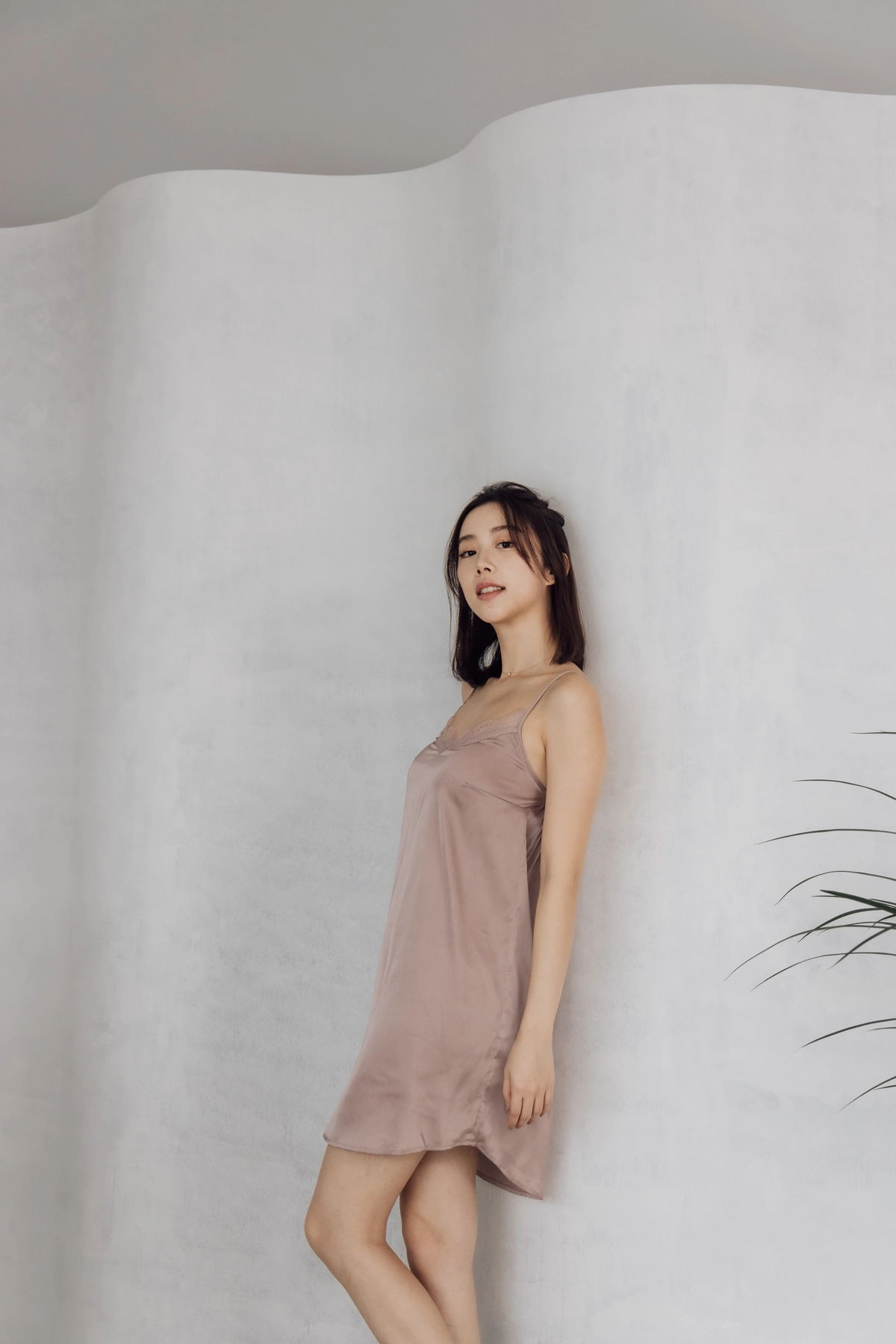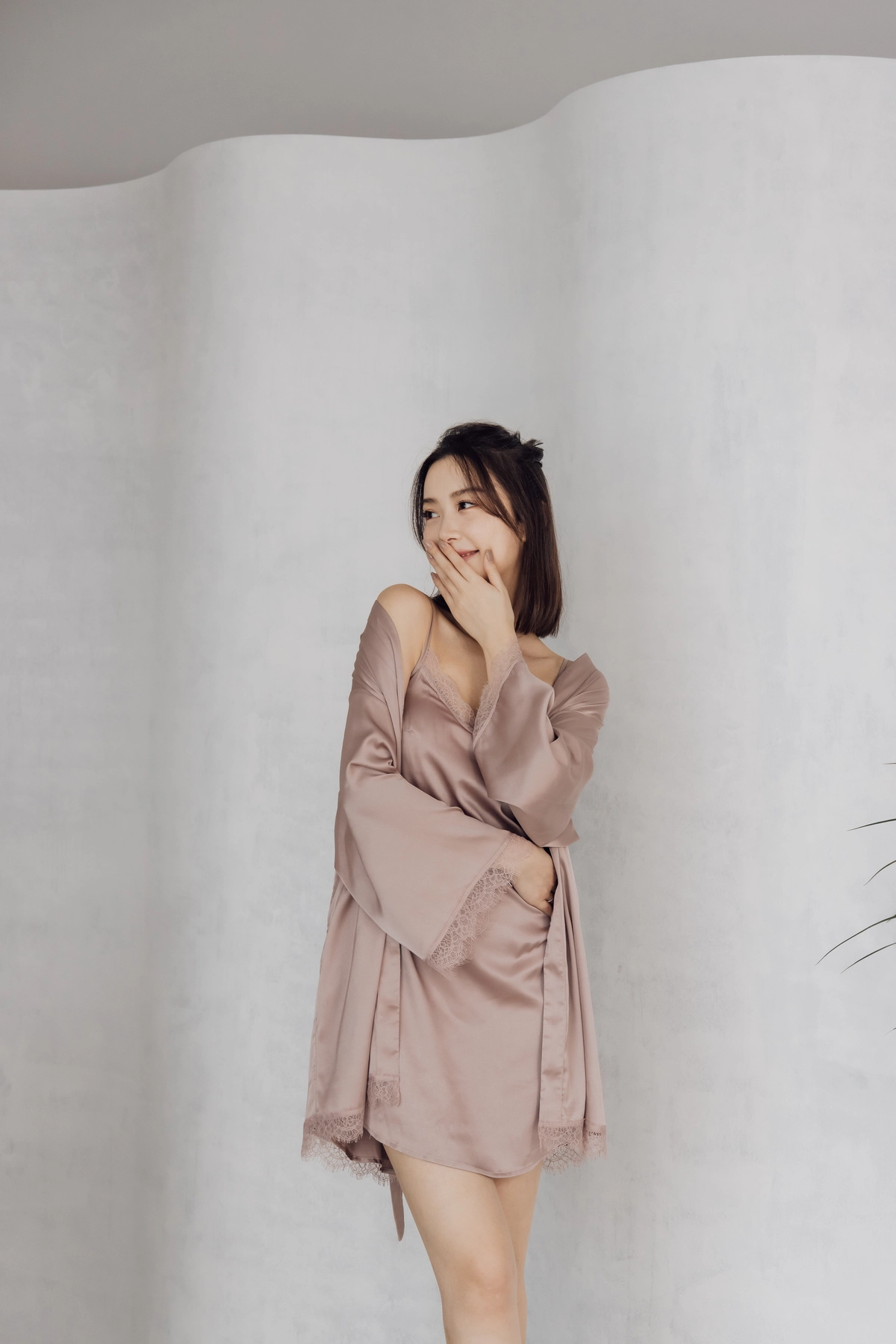 WOMAN緞面蕾絲Bra Top睡裙-煙灰粉