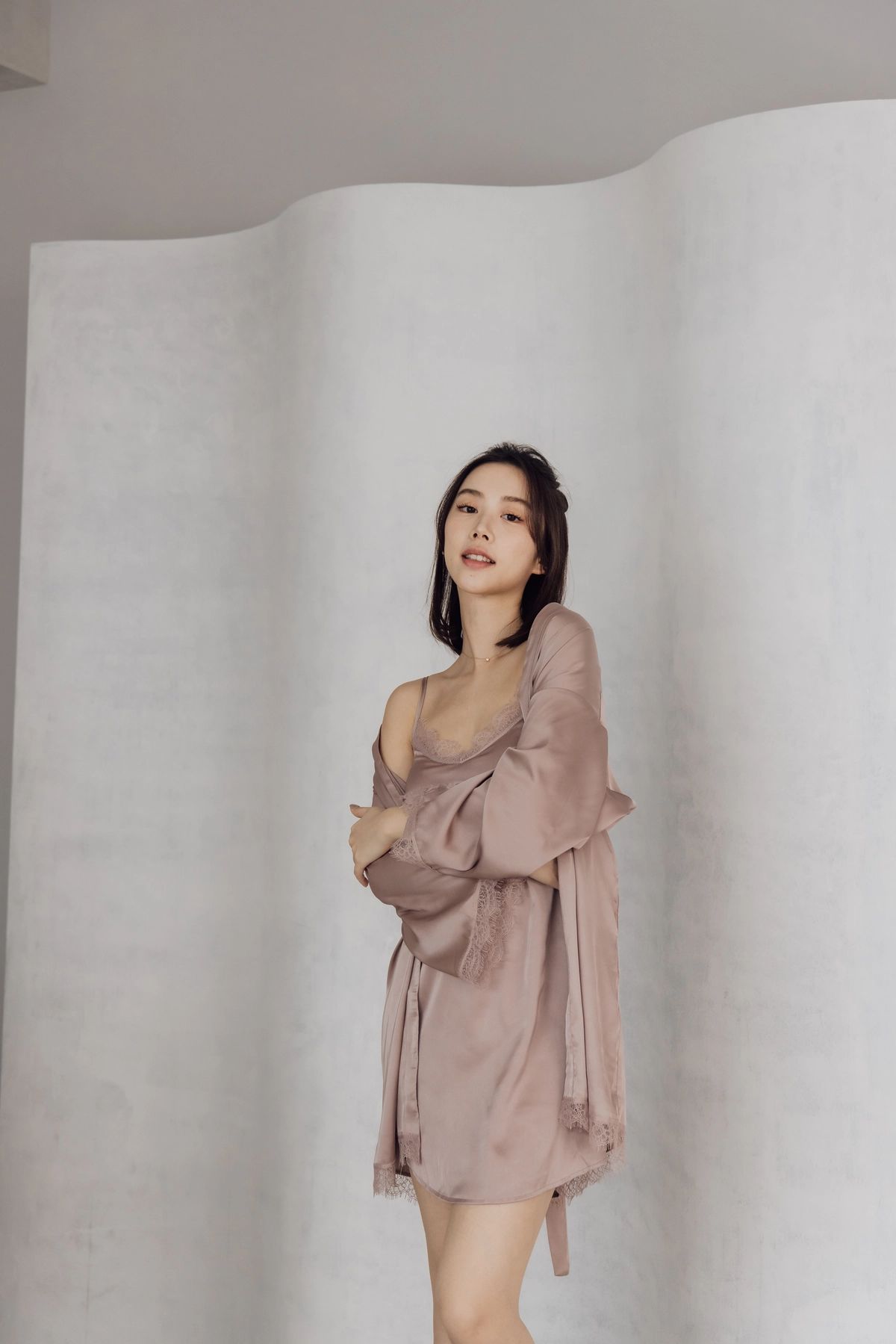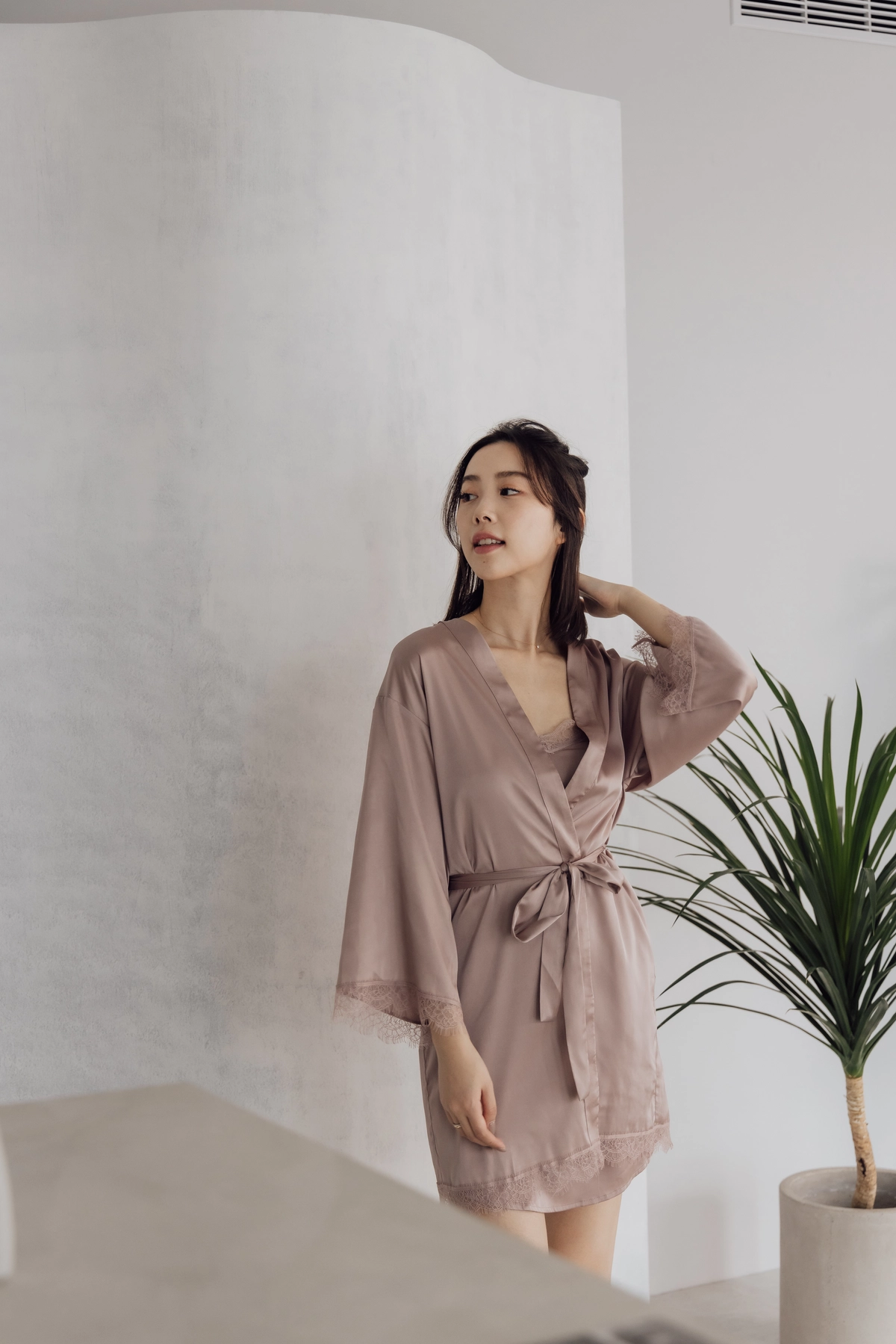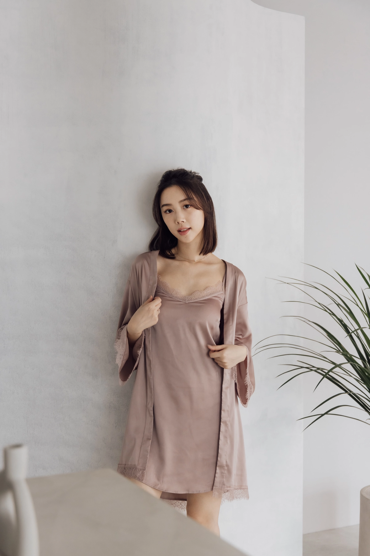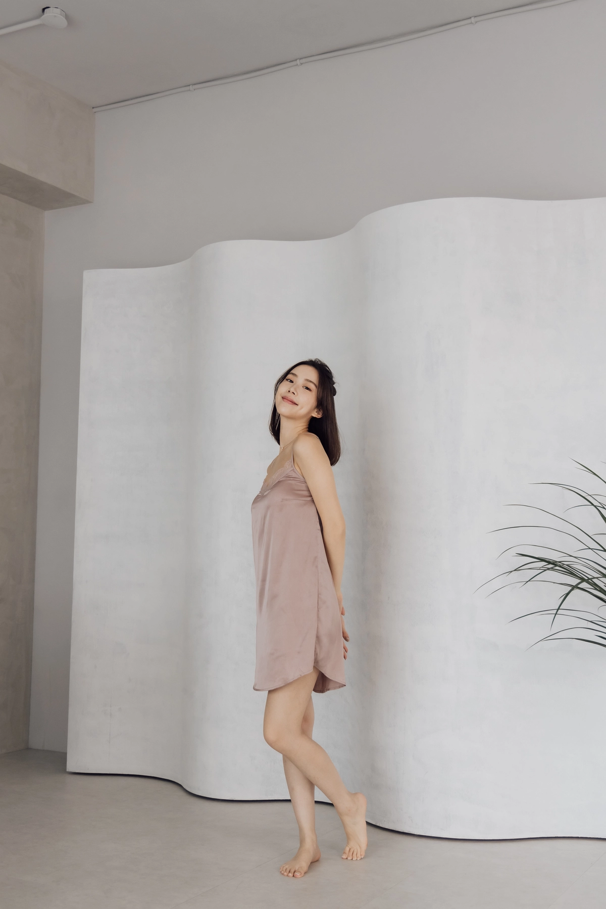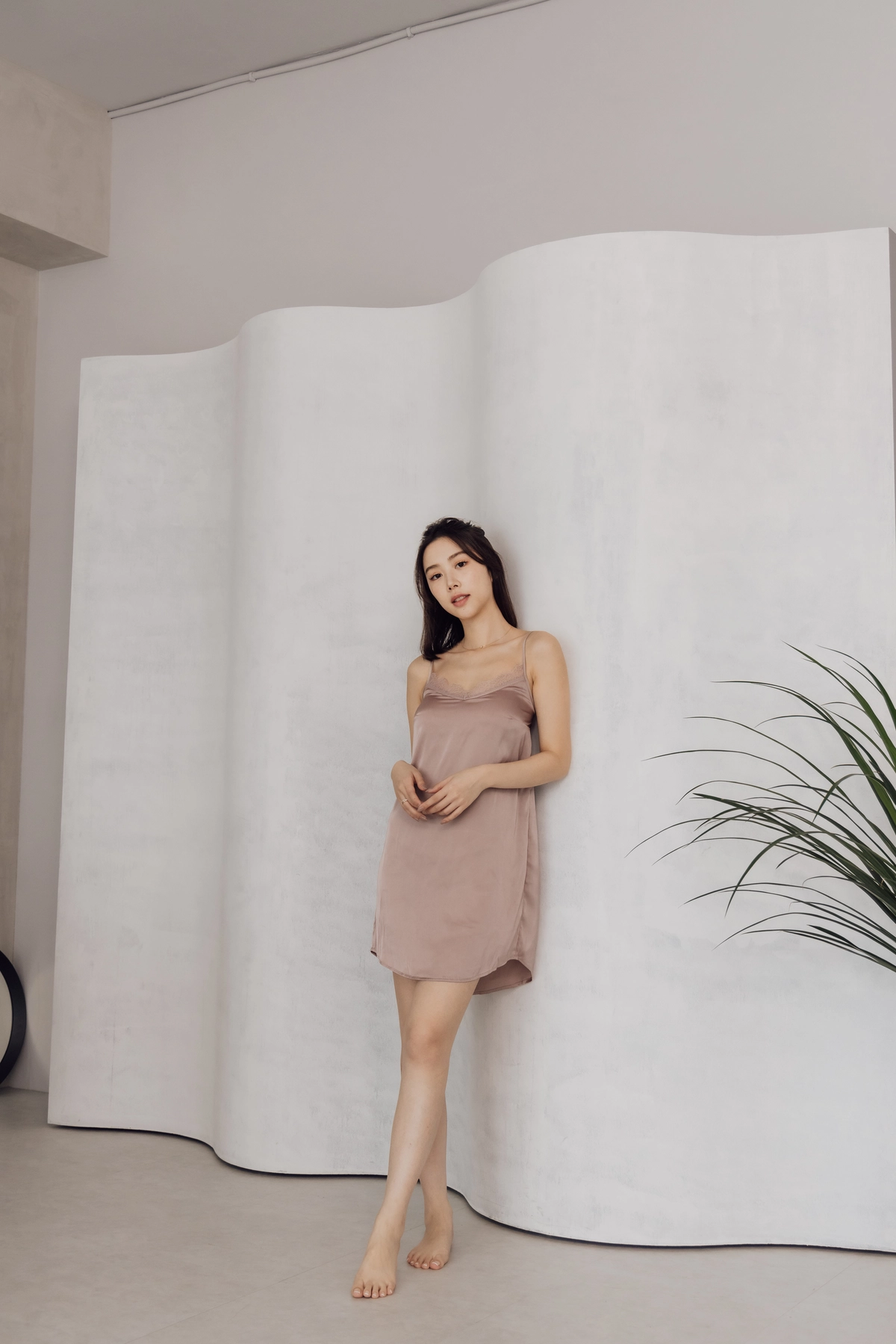 WOMAN緞面蕾絲Bra Top睡裙-煙灰粉