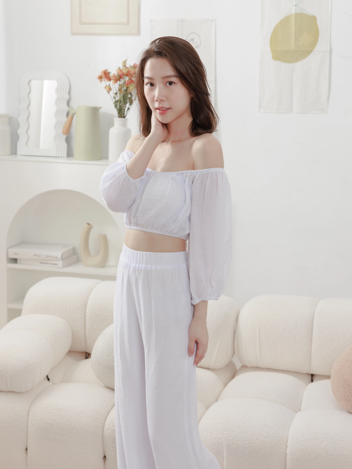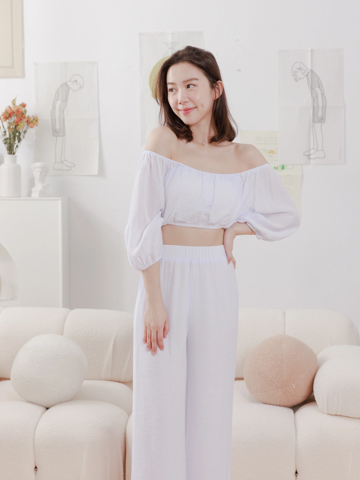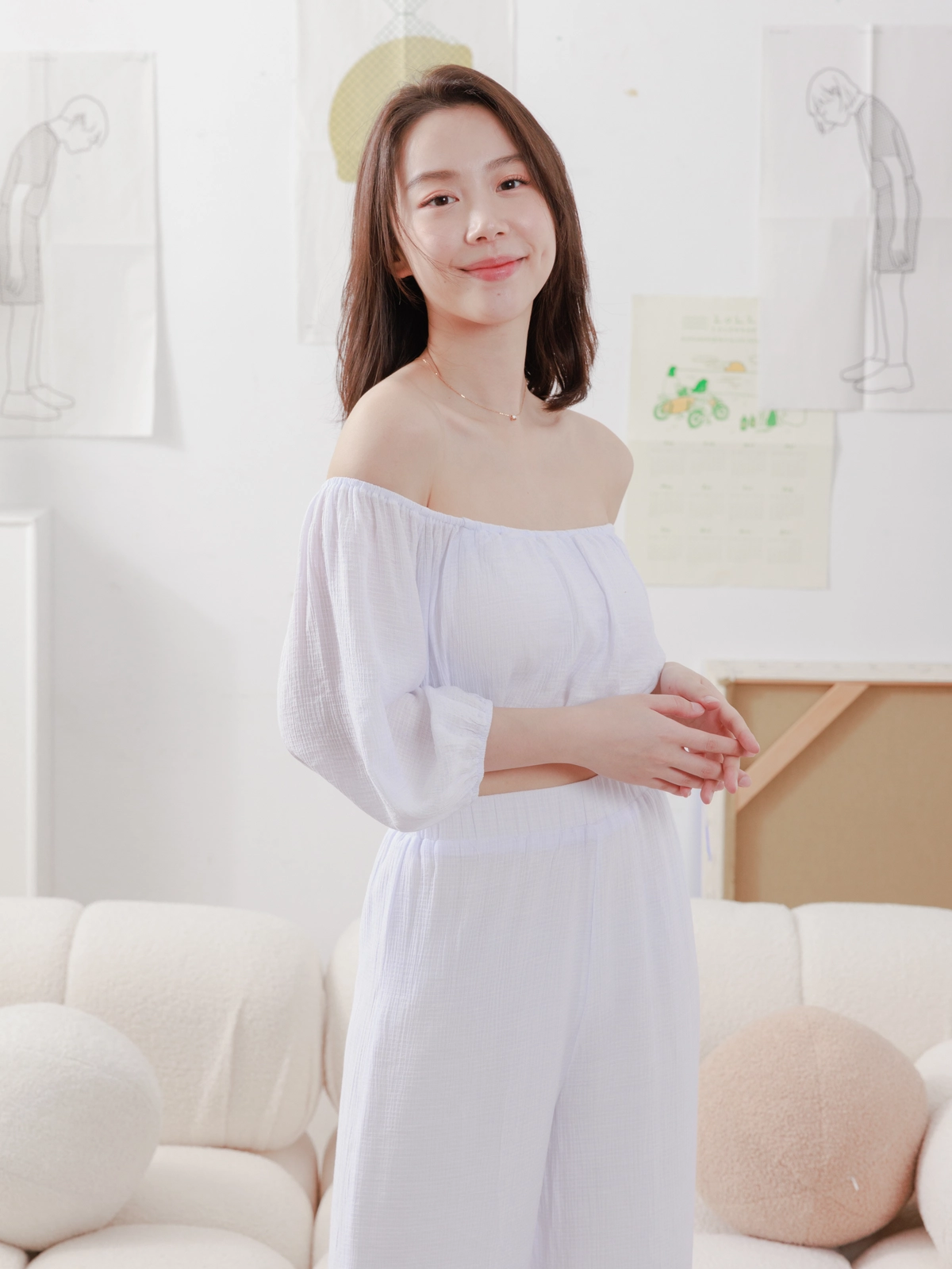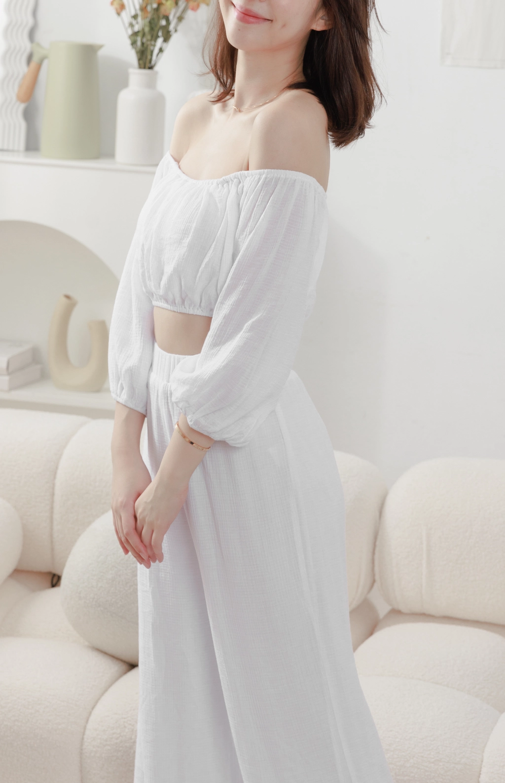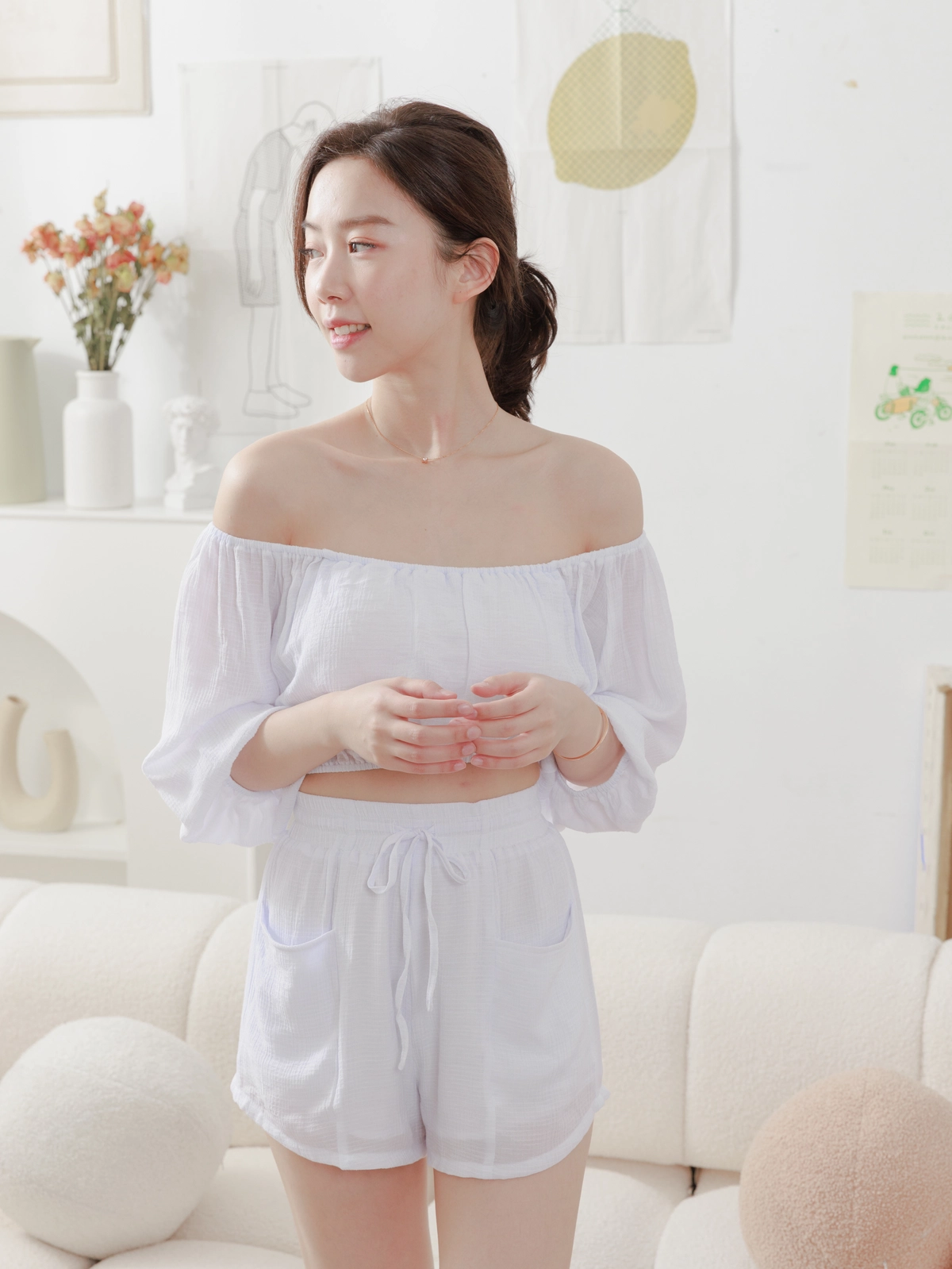 夏日女神 棉麻一字領Bra Top Set-白