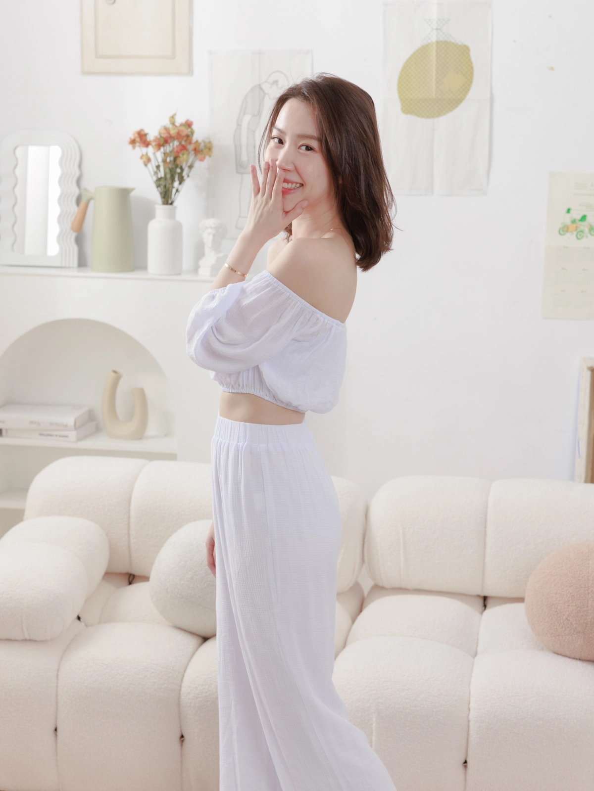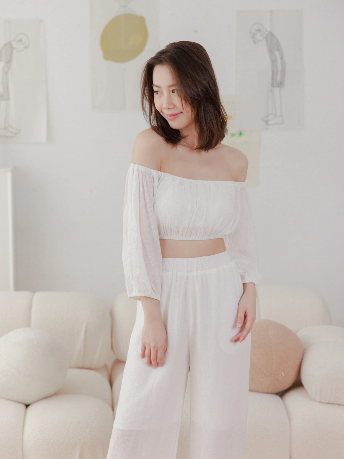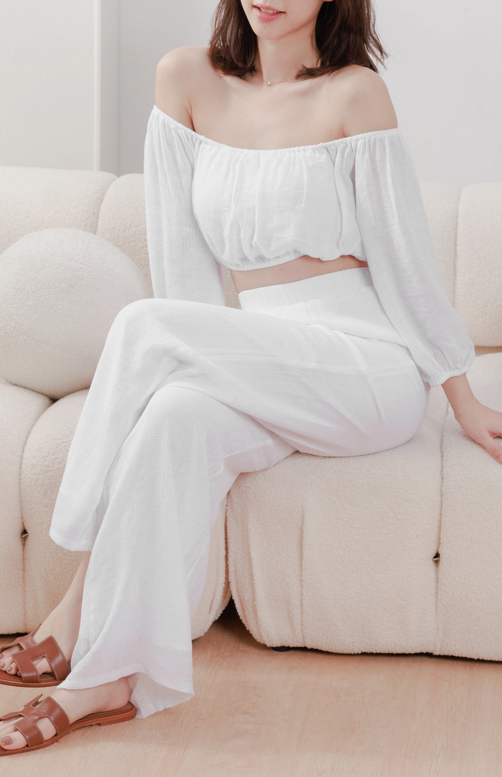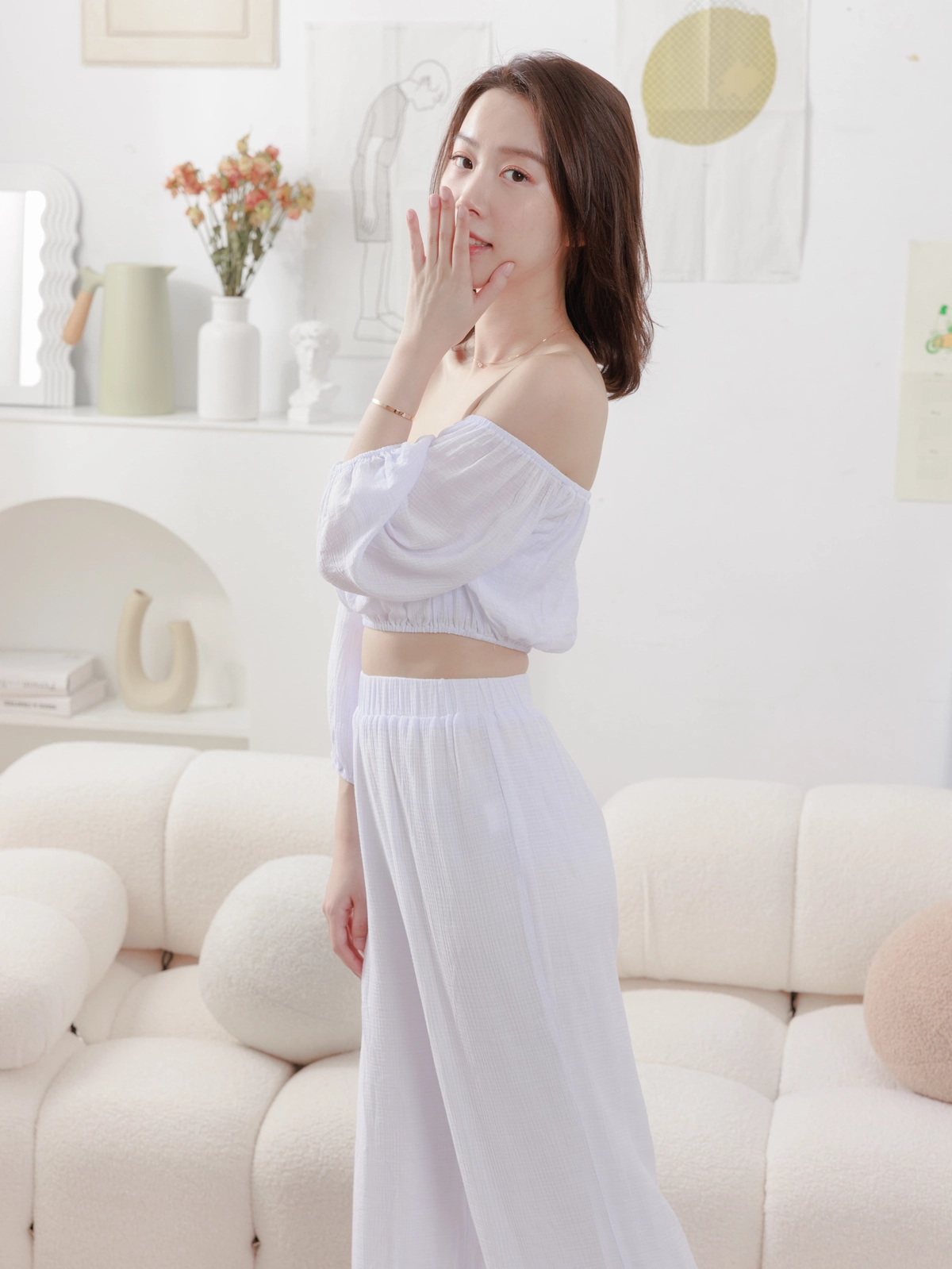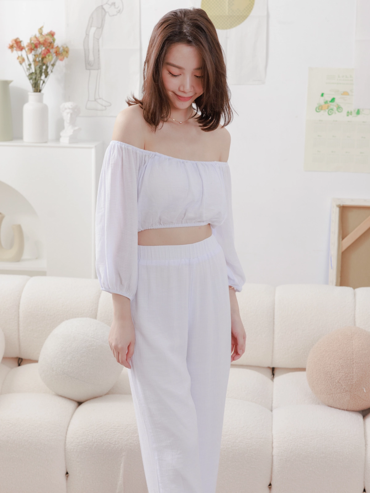 夏日女神 棉麻一字領Bra Top Set-白