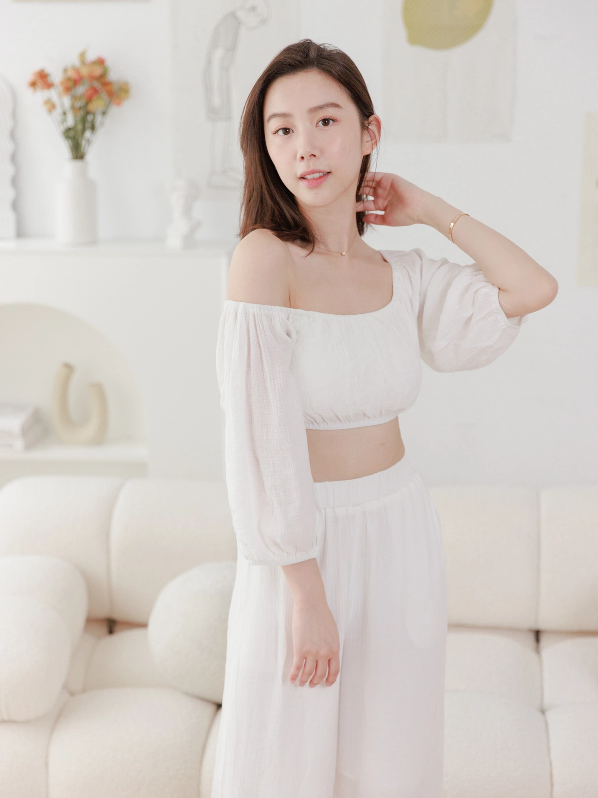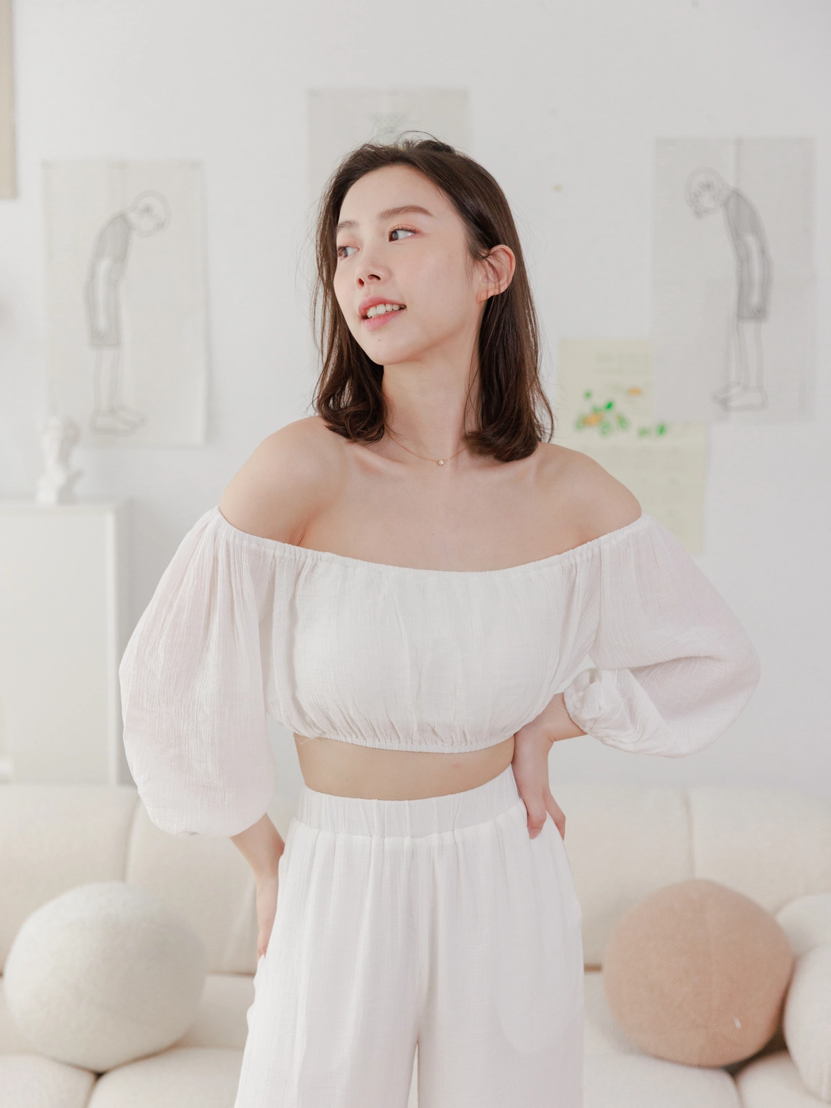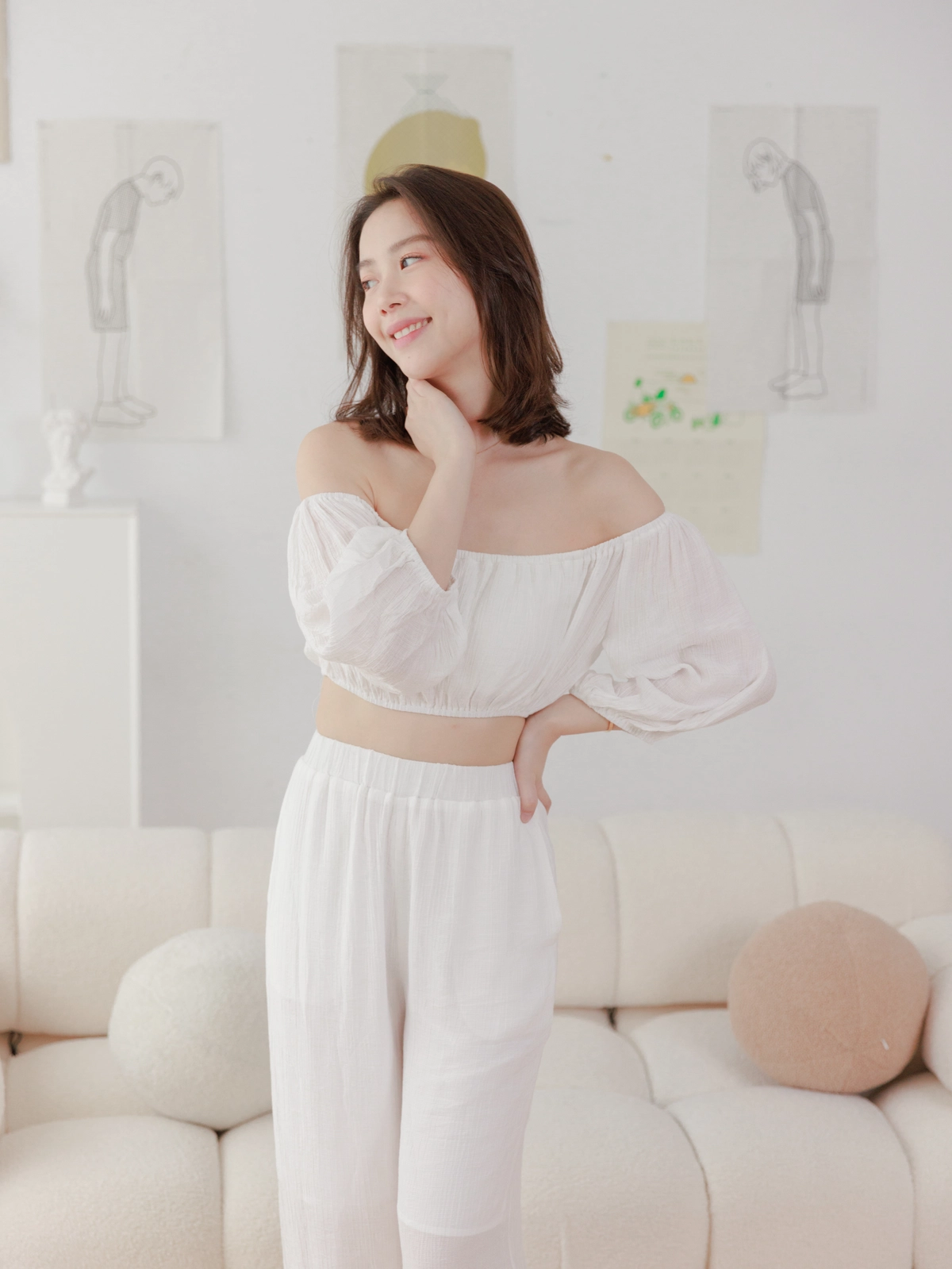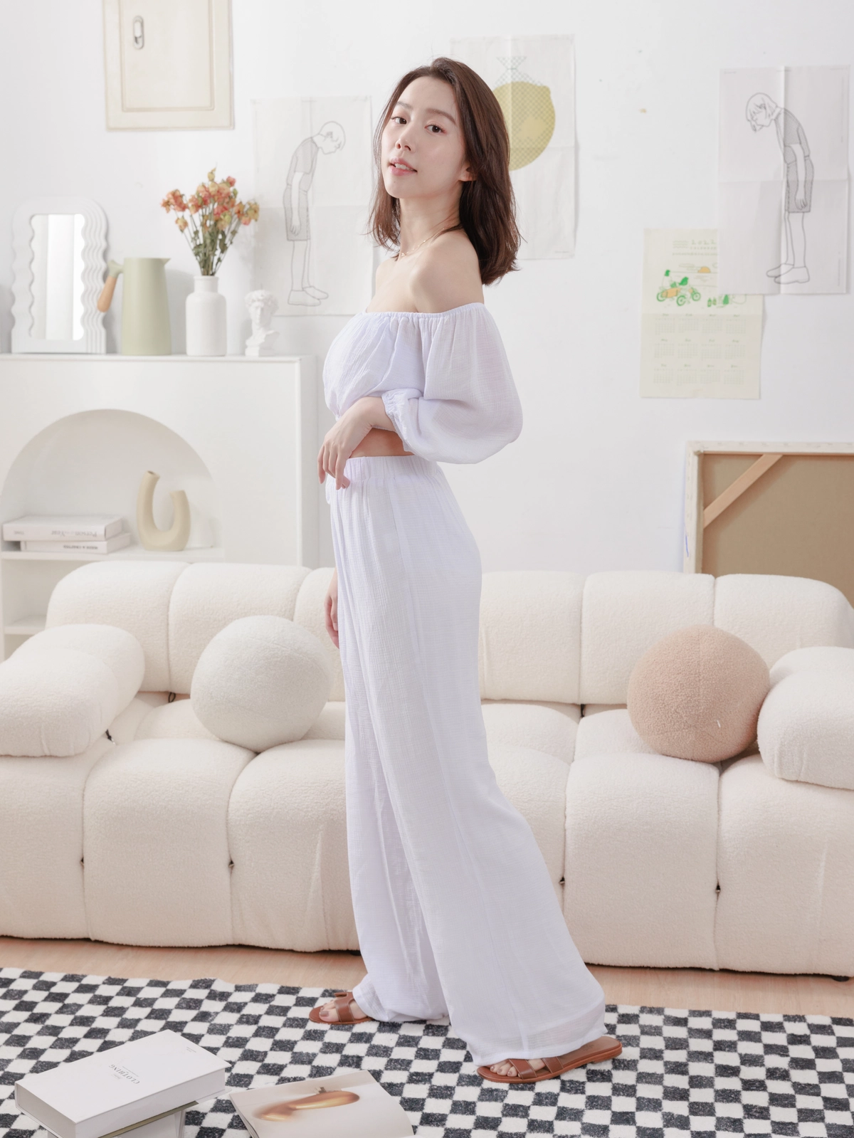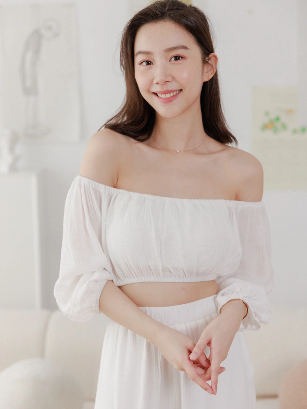 夏日女神 棉麻一字領Bra Top Set-白