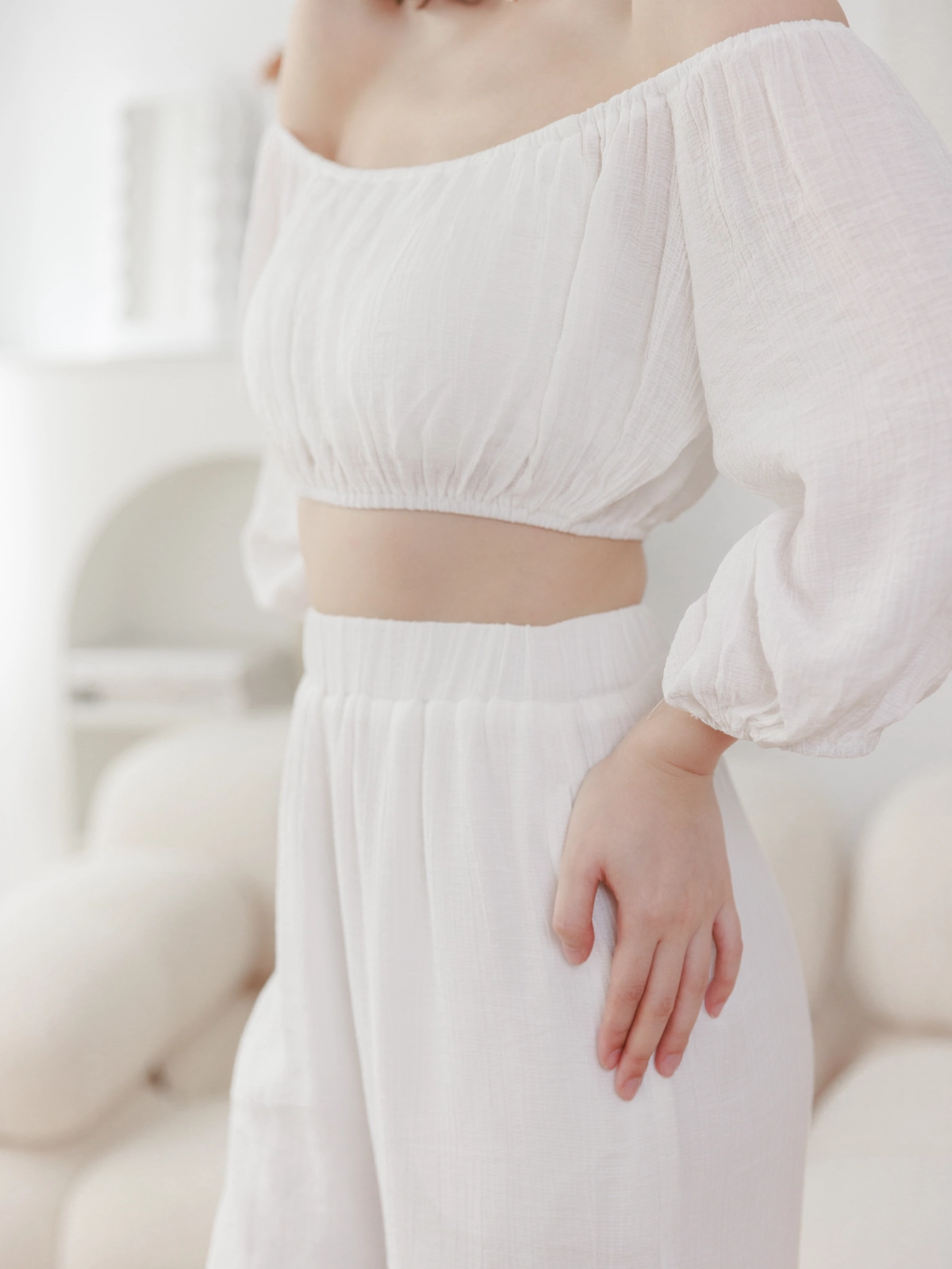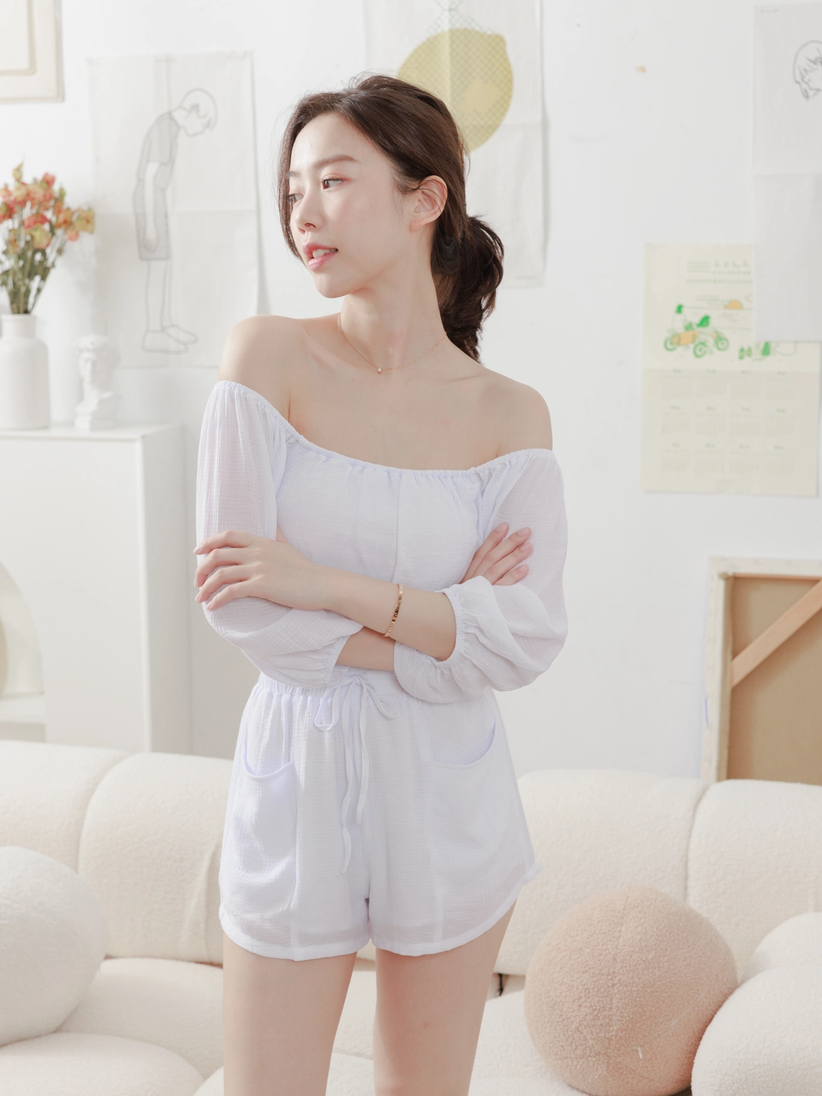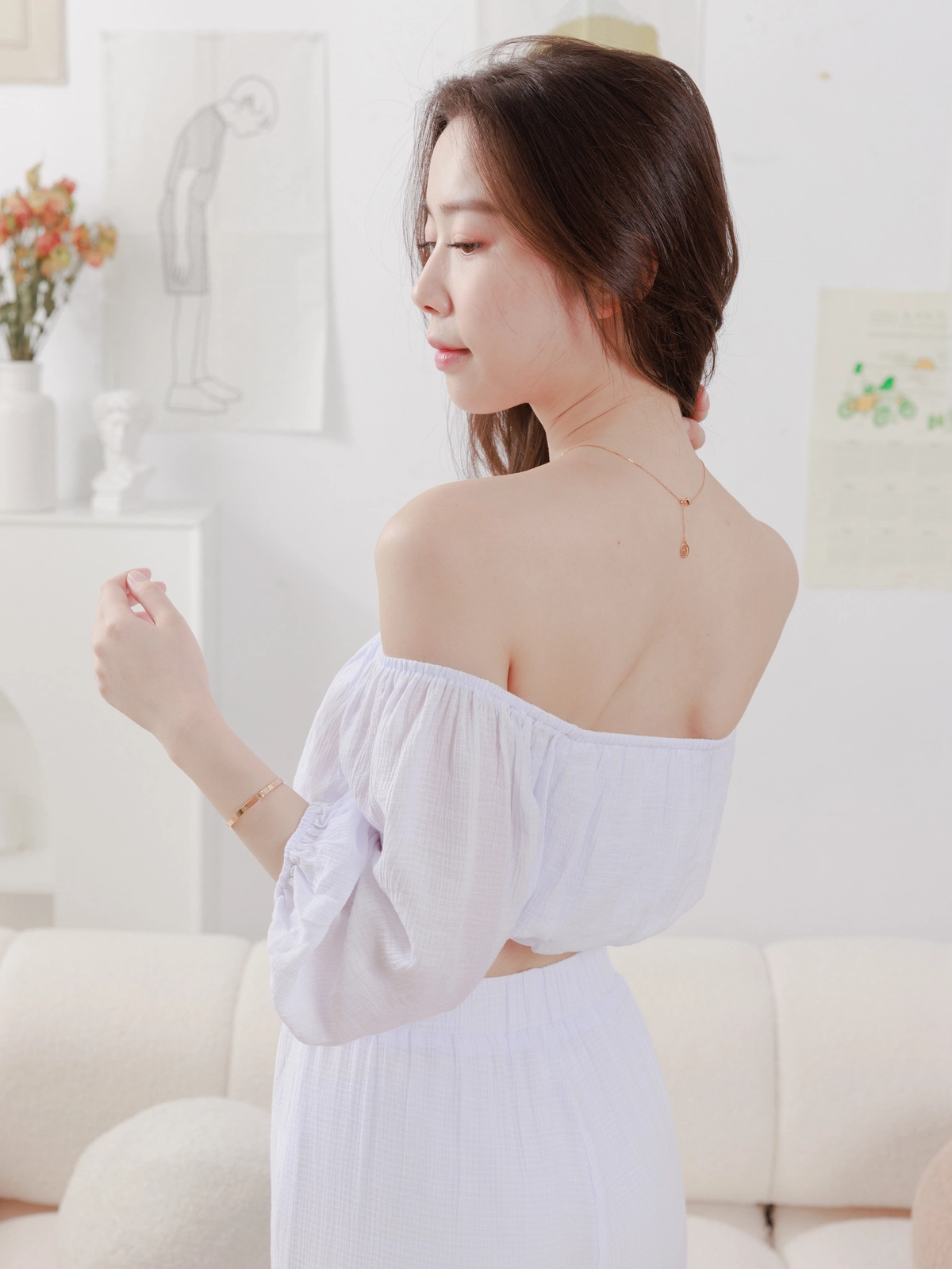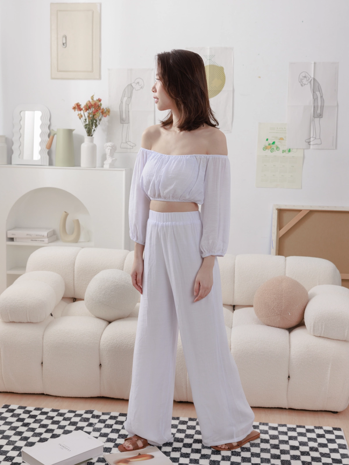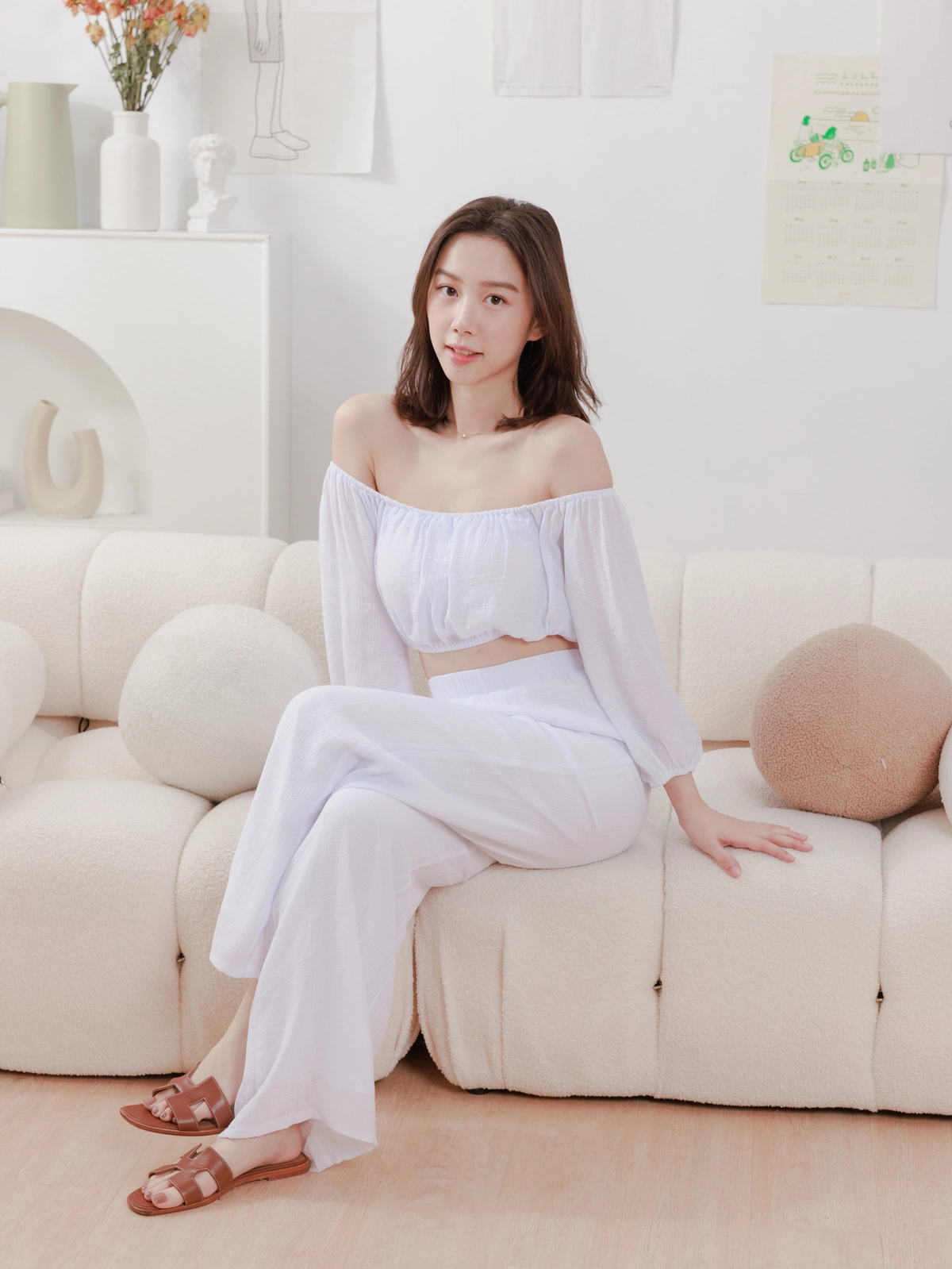 夏日女神 棉麻一字領Bra Top Set-白