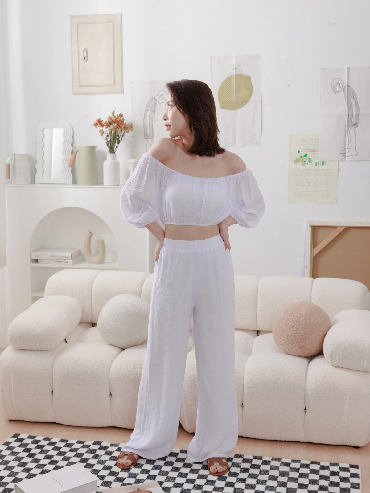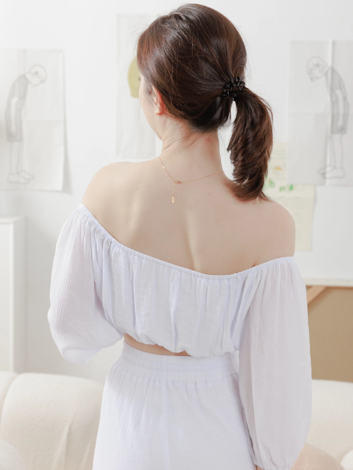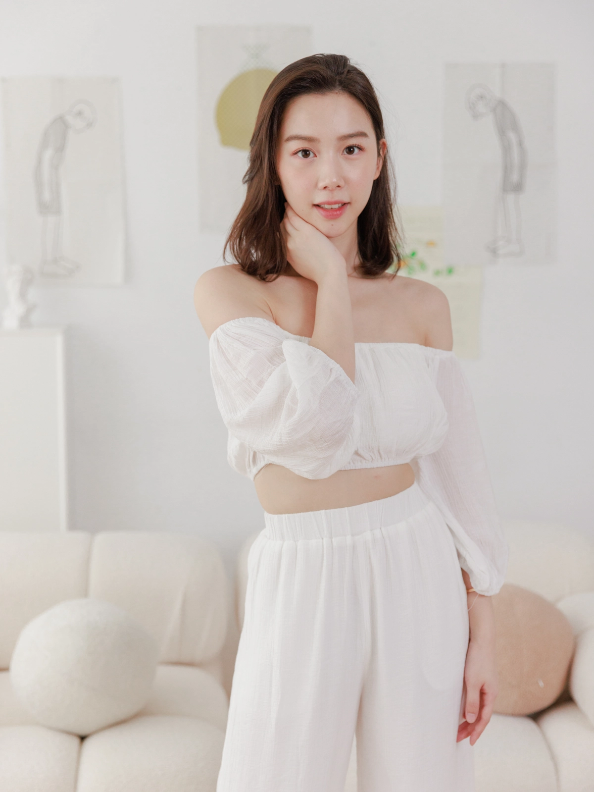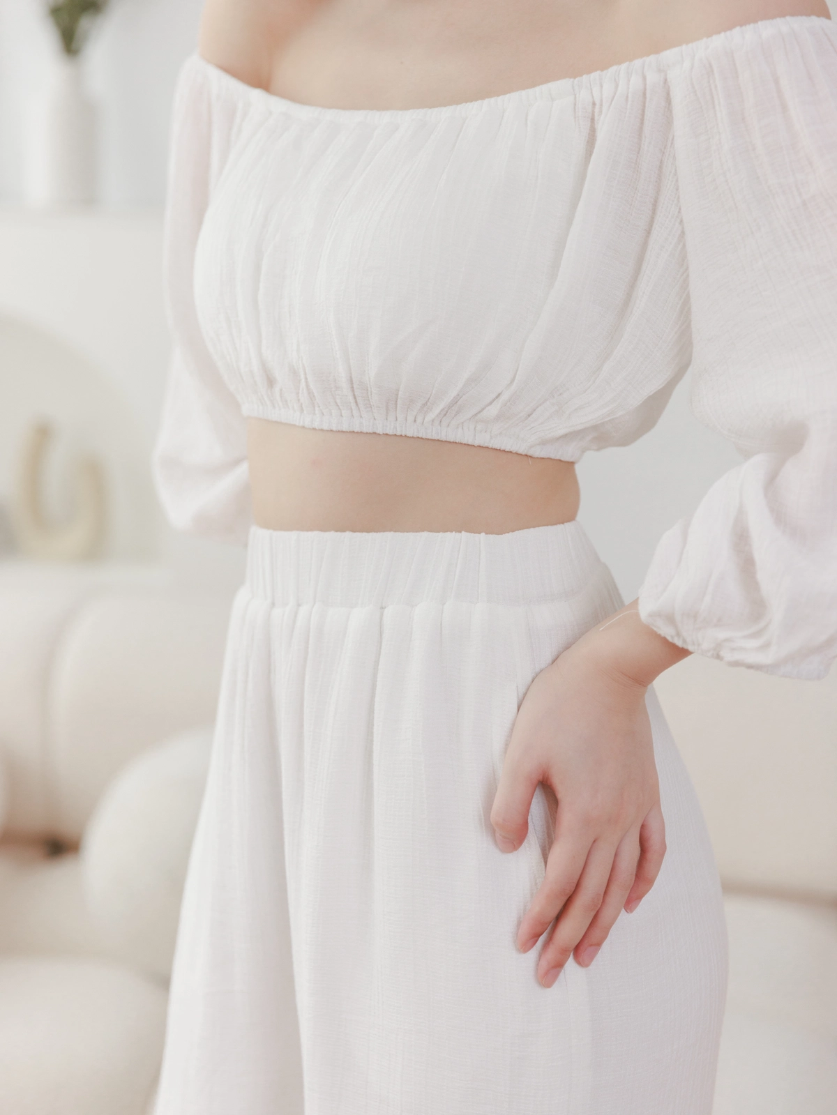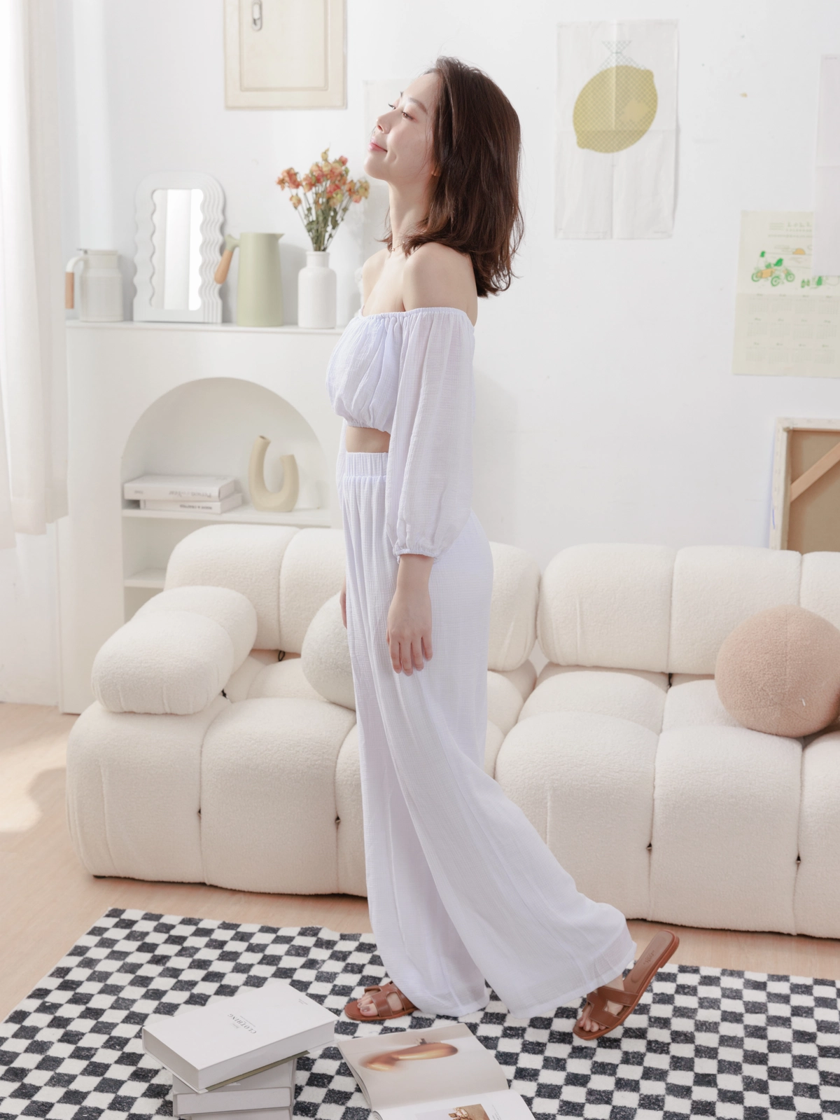 夏日女神 棉麻一字領Bra Top Set-白
