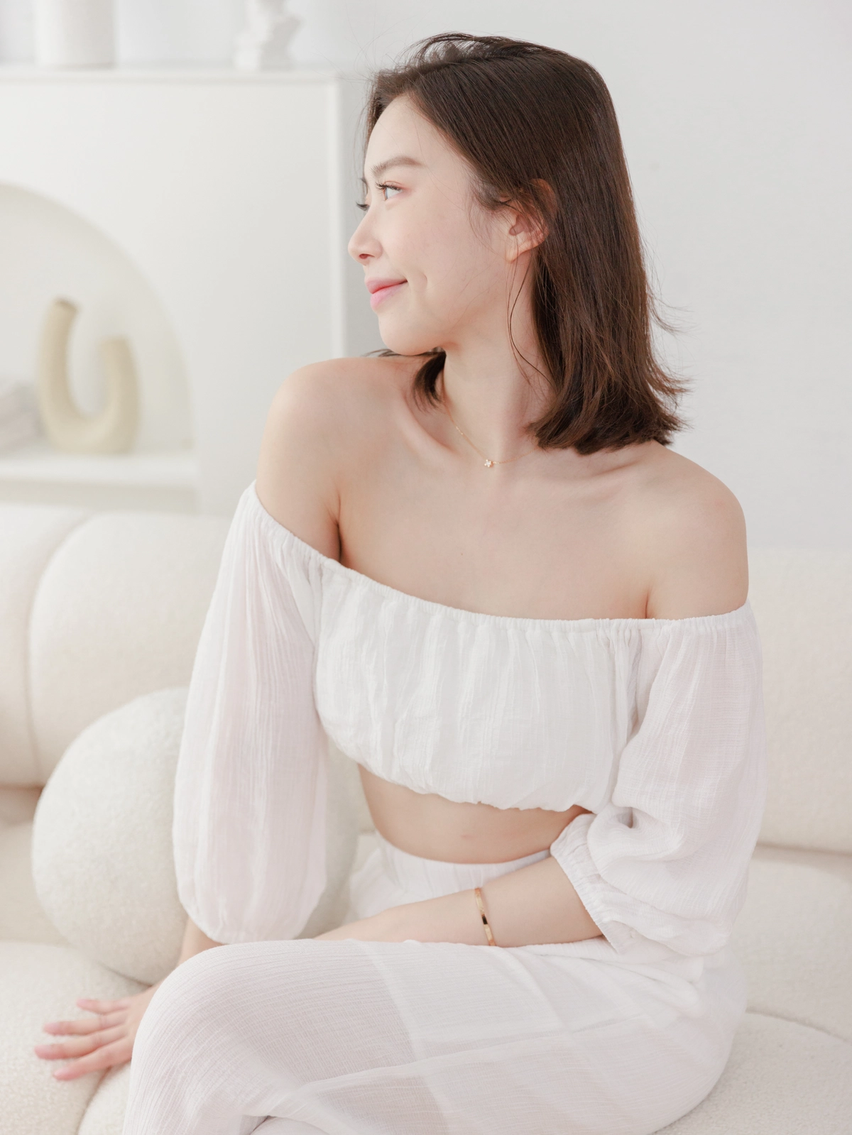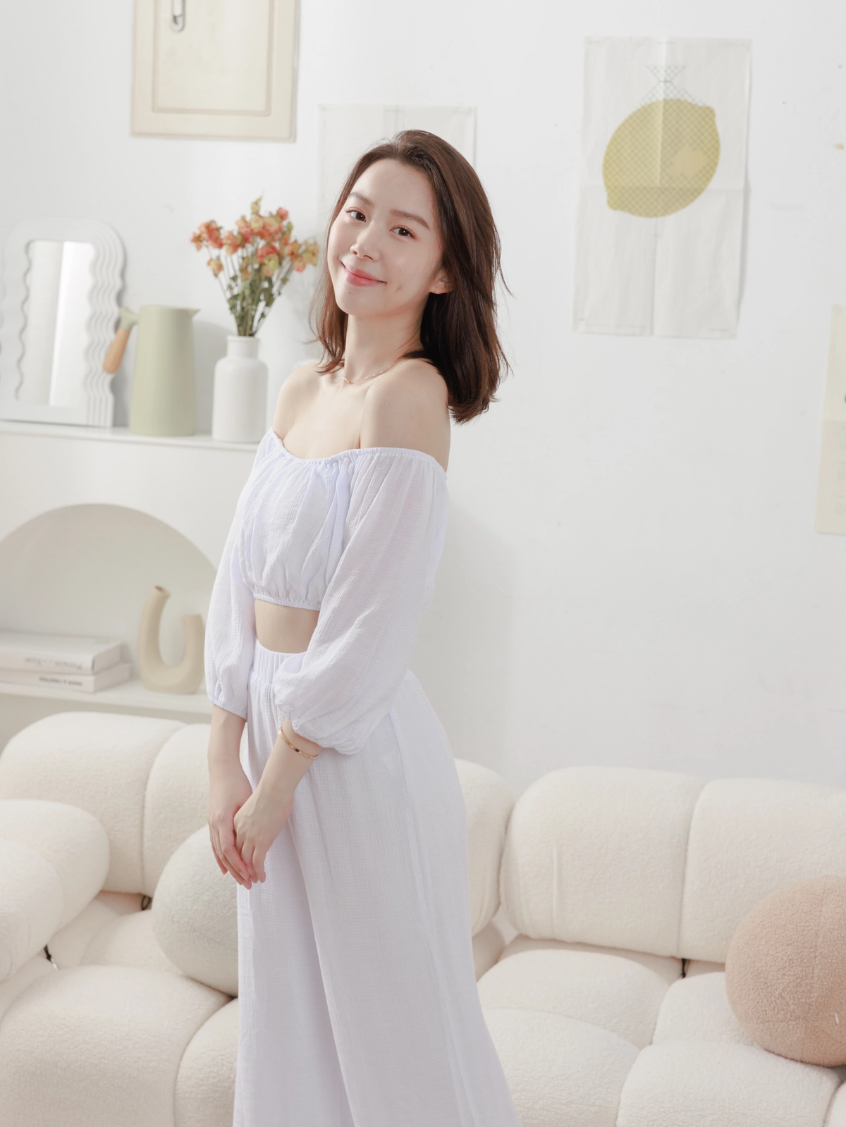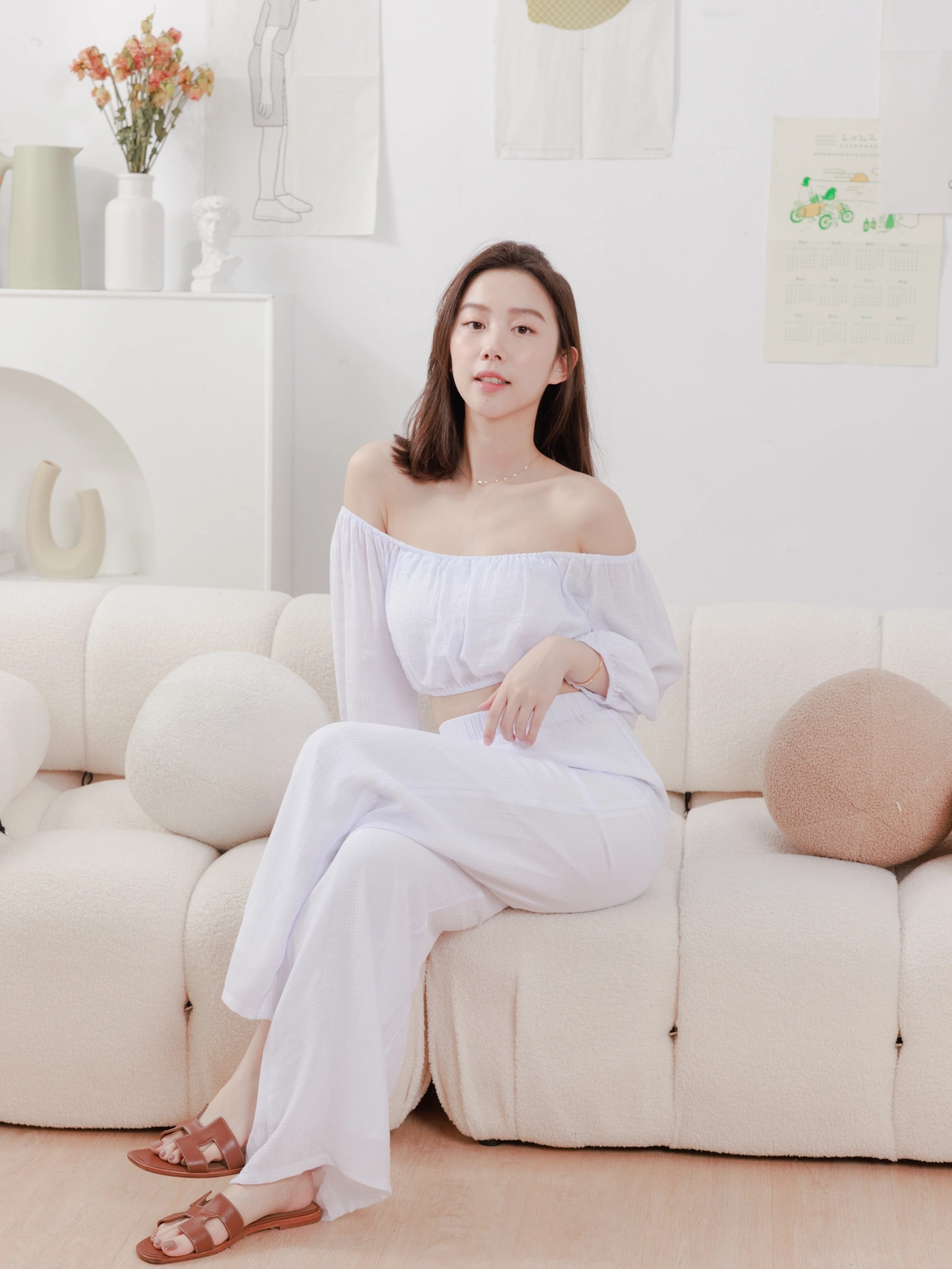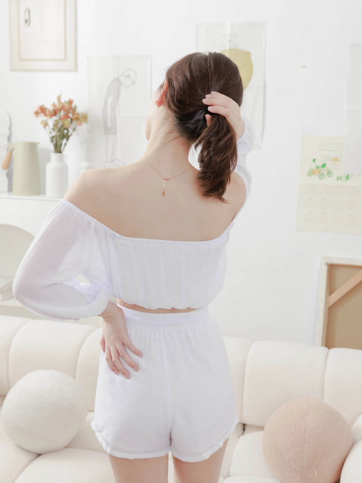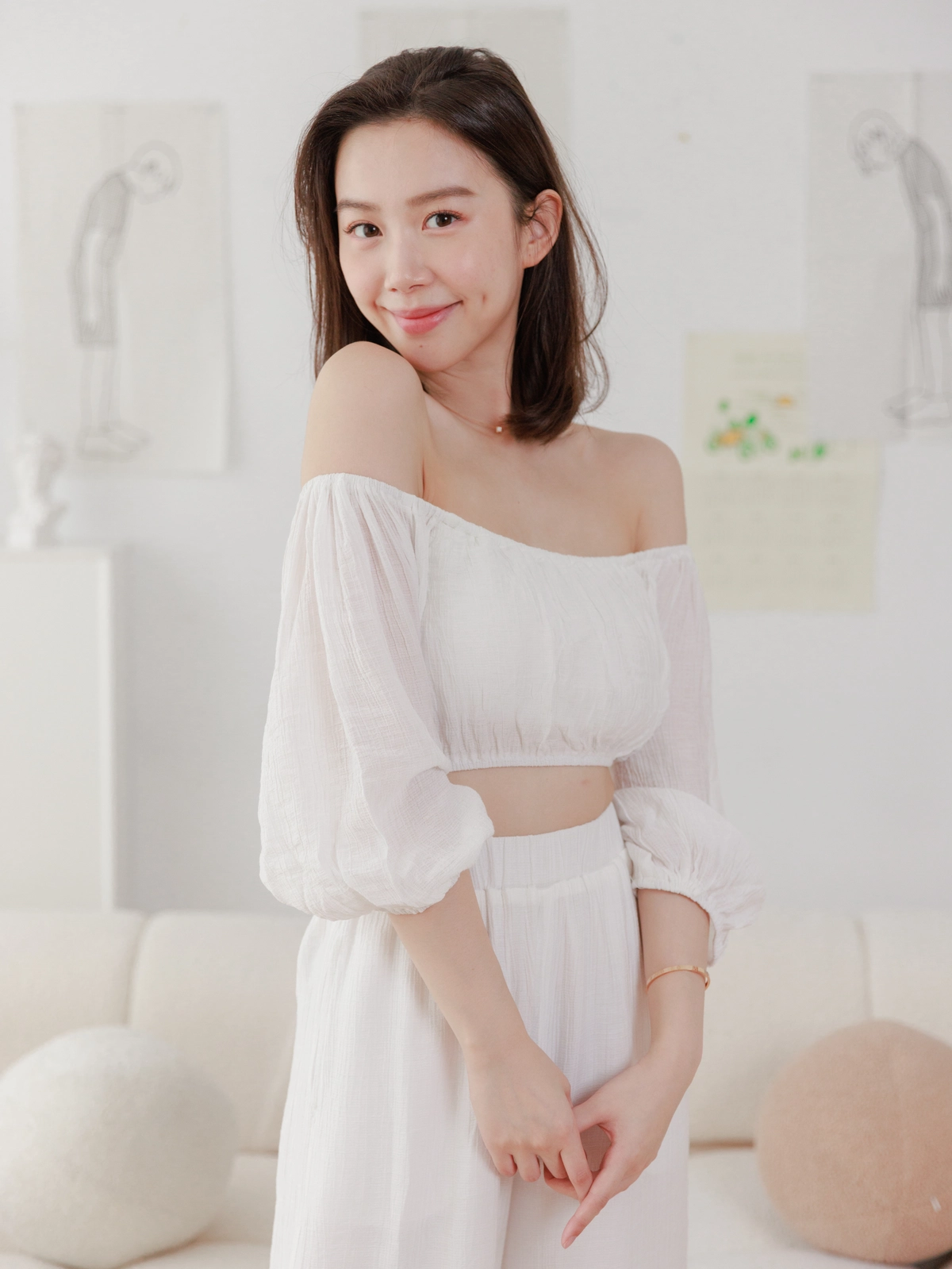 夏日女神 棉麻一字領Bra Top Set-白