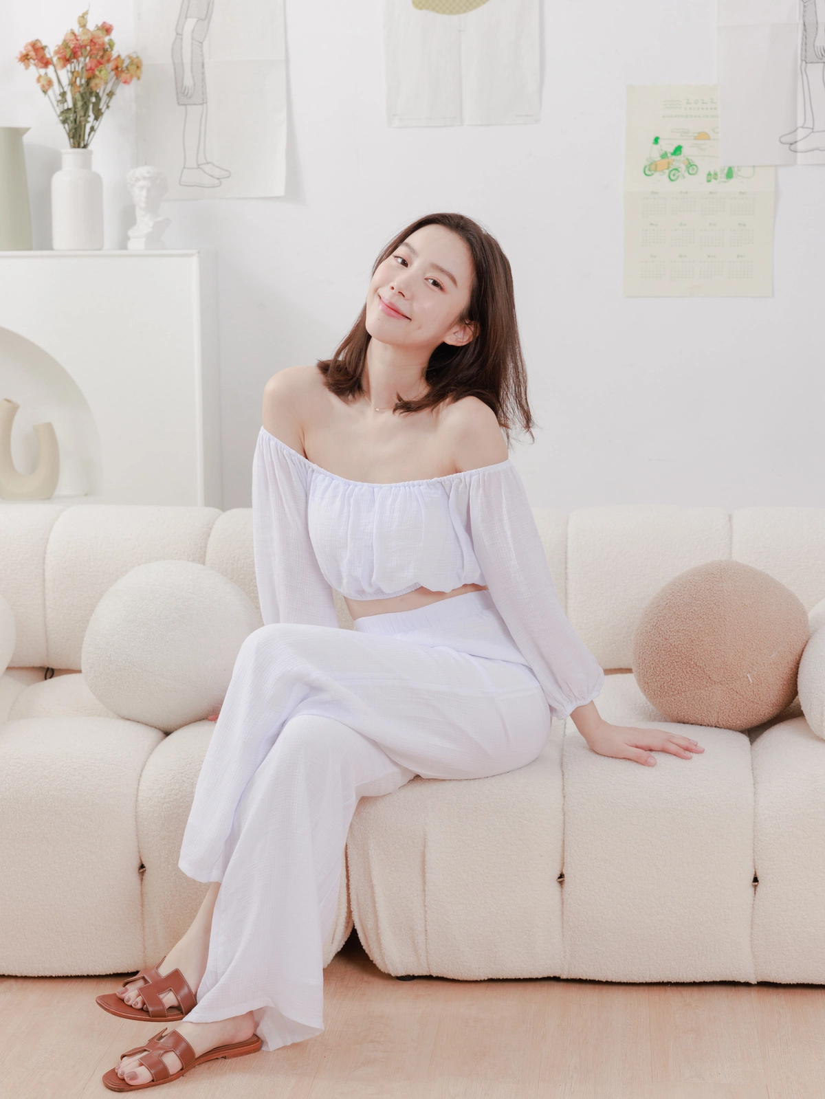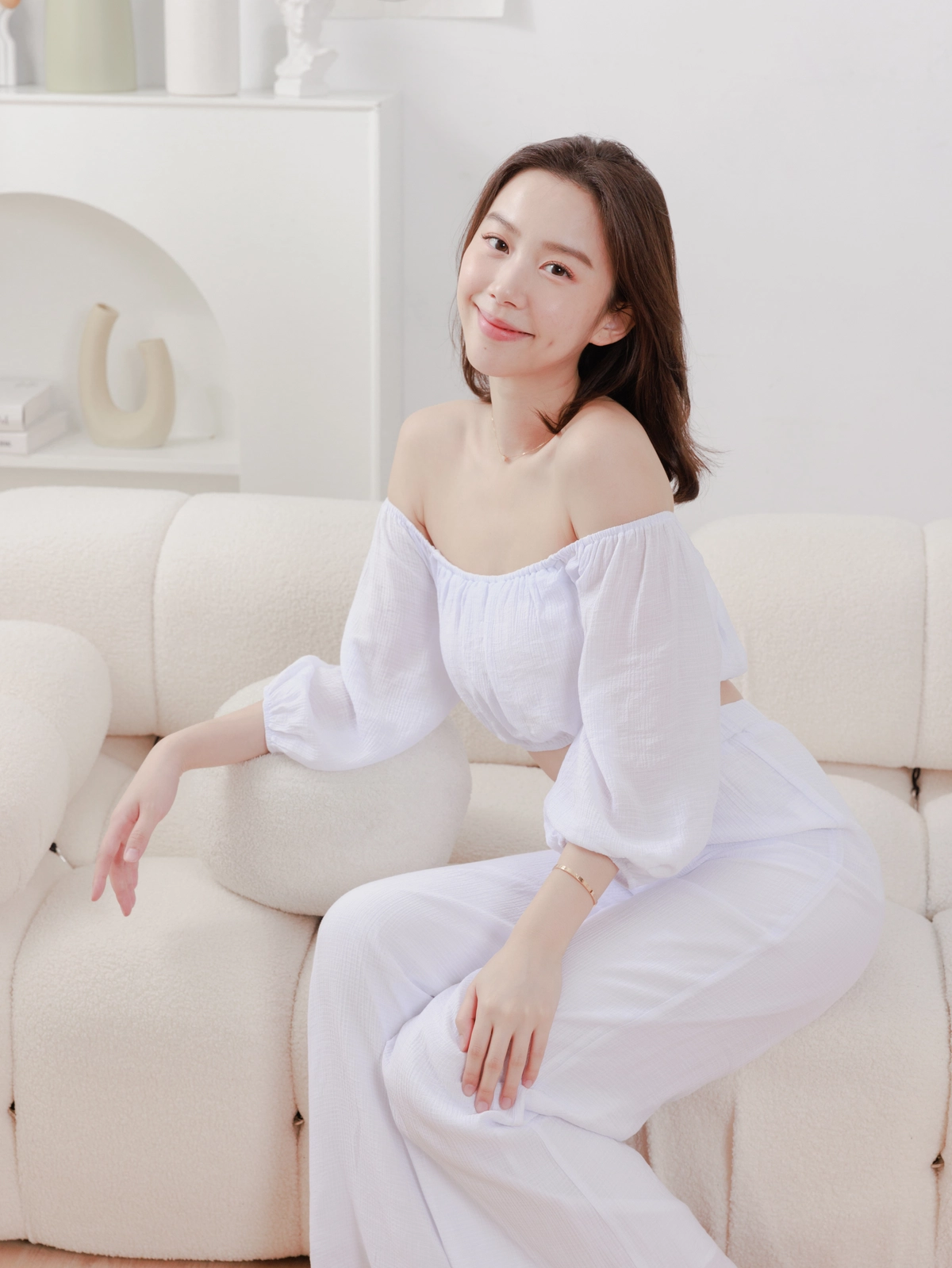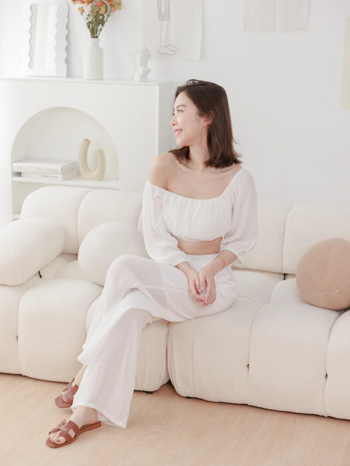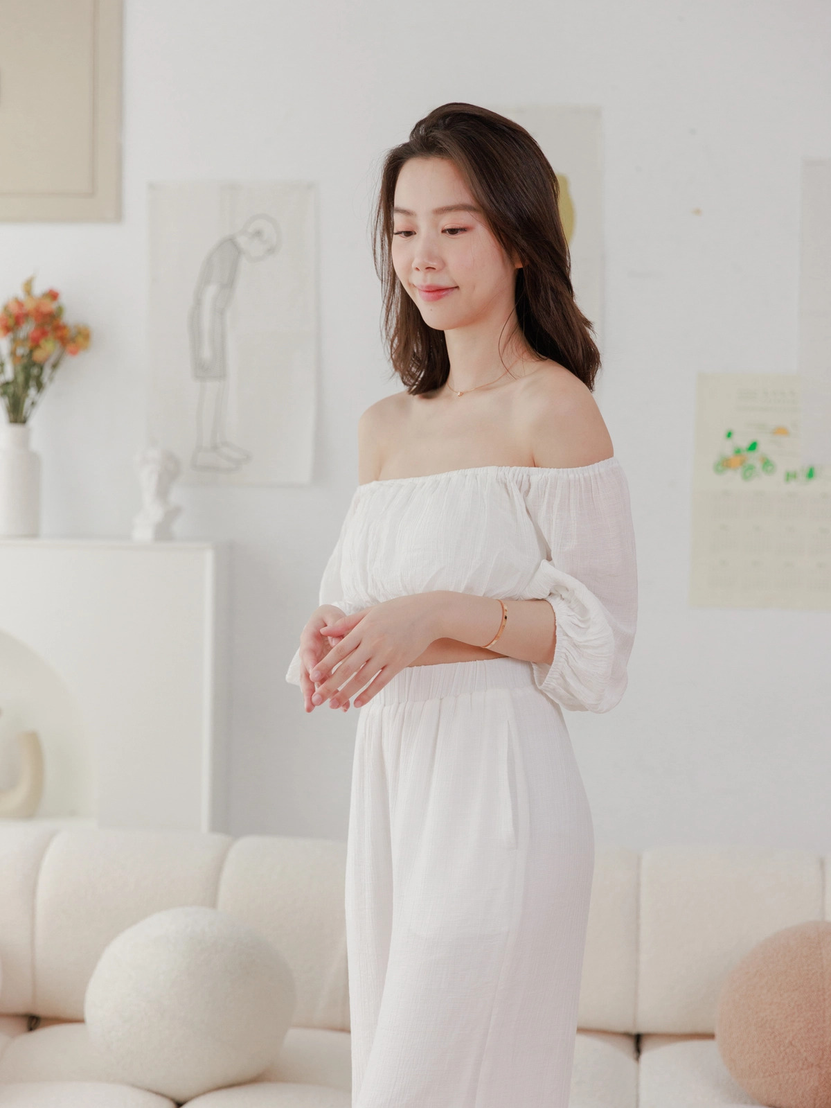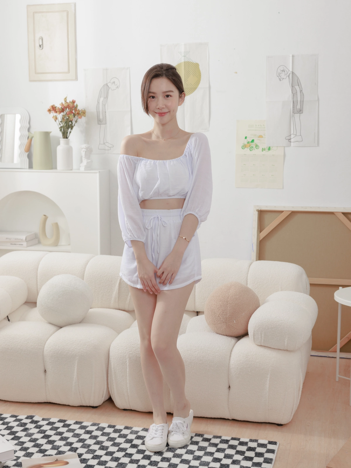 夏日女神 棉麻一字領Bra Top Set-白