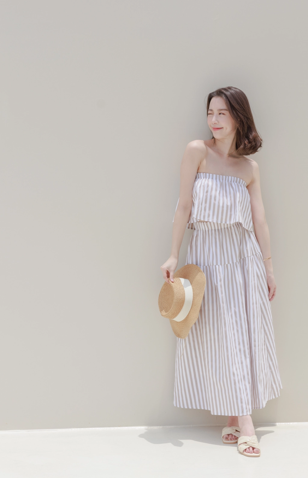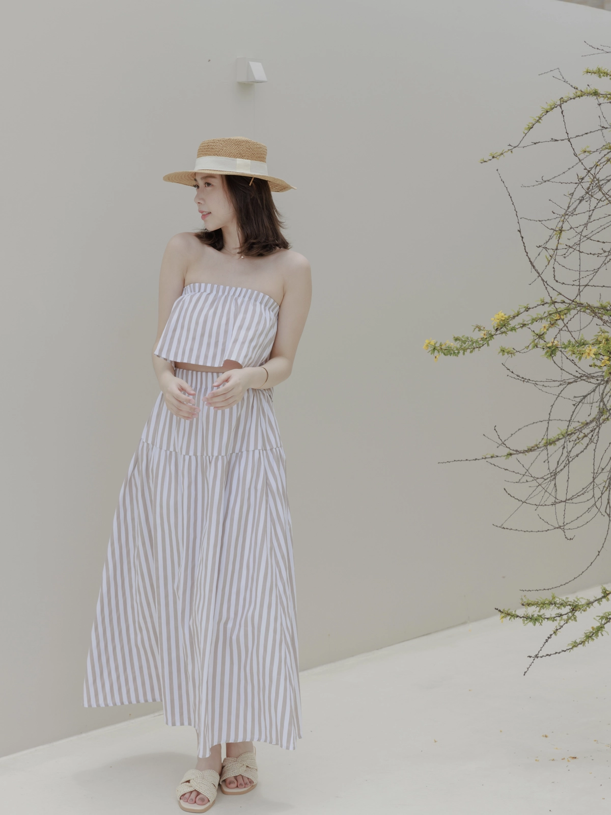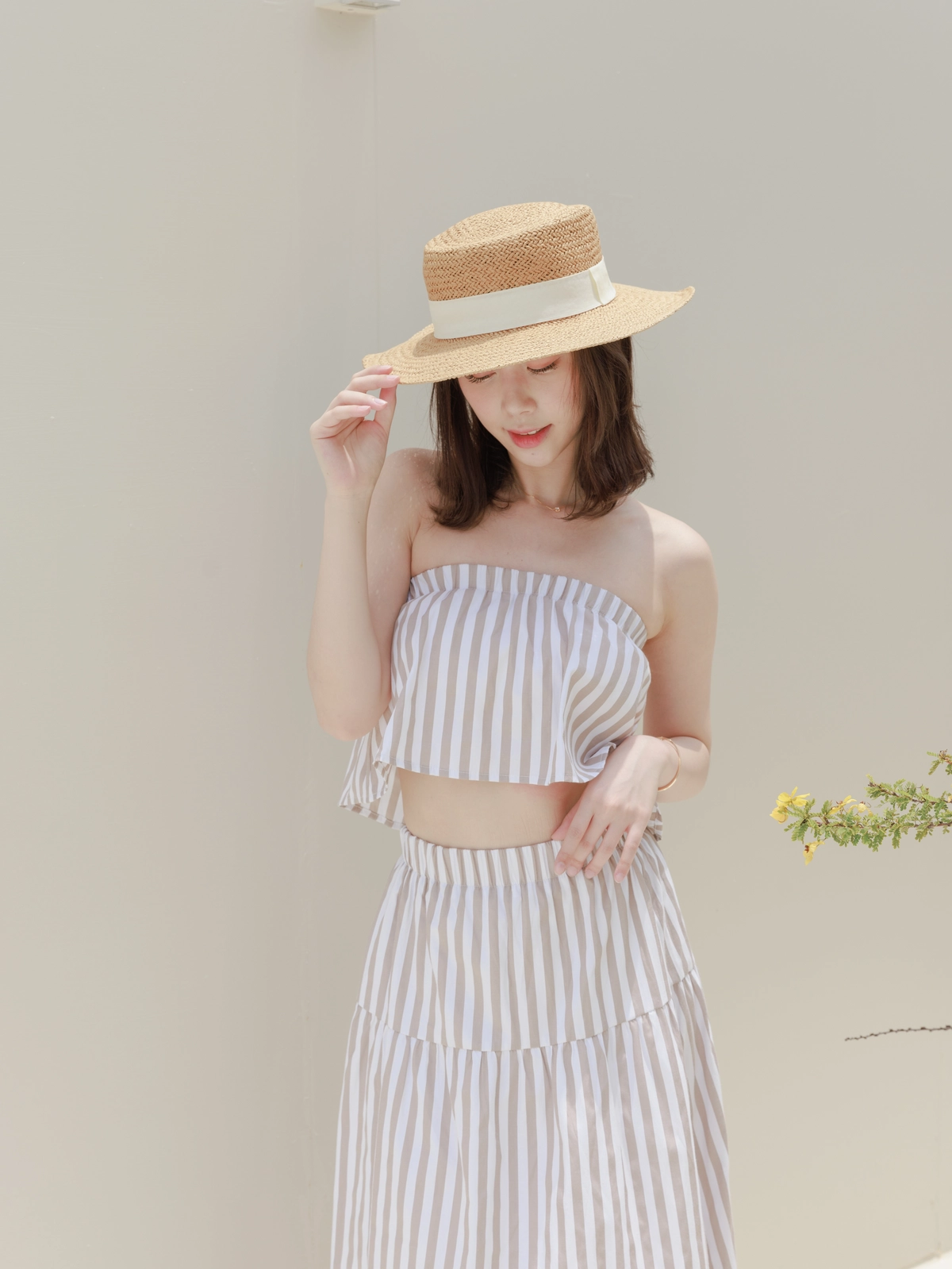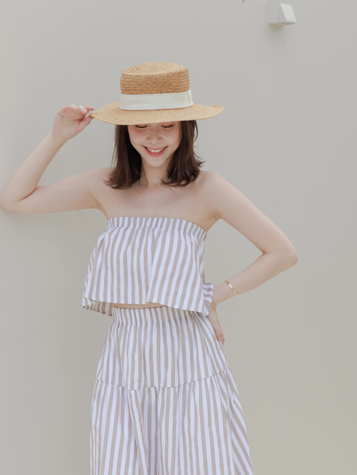 渡假必備 條紋Bra Top Set-咖