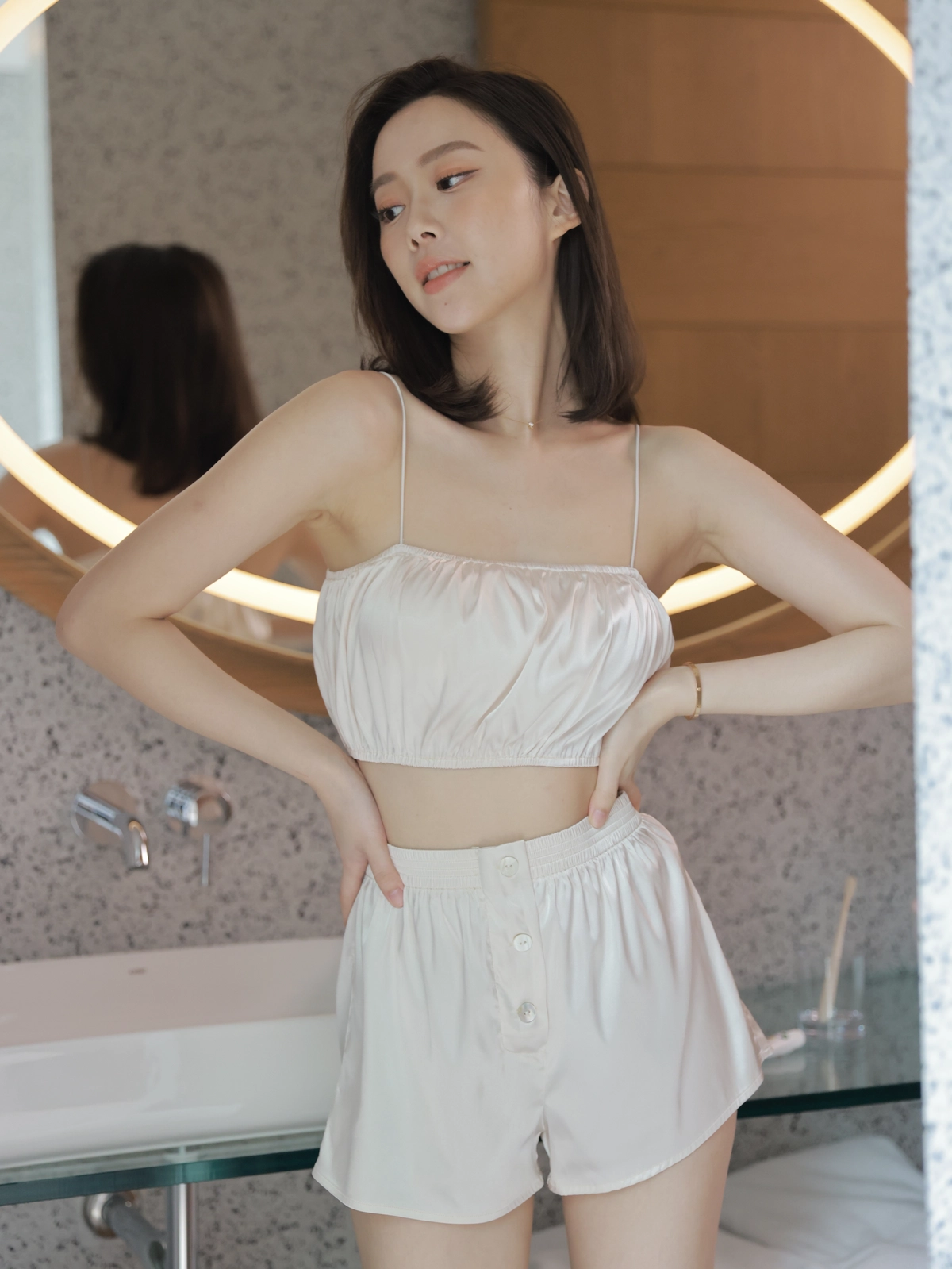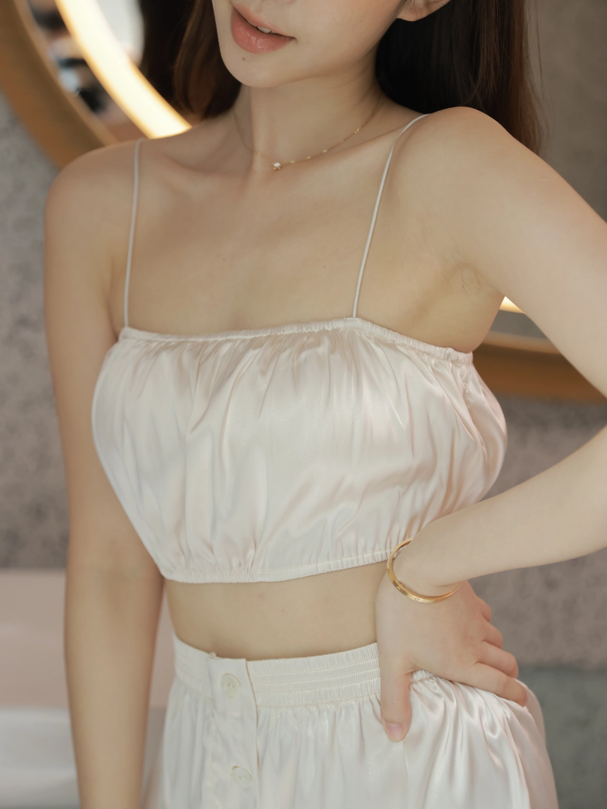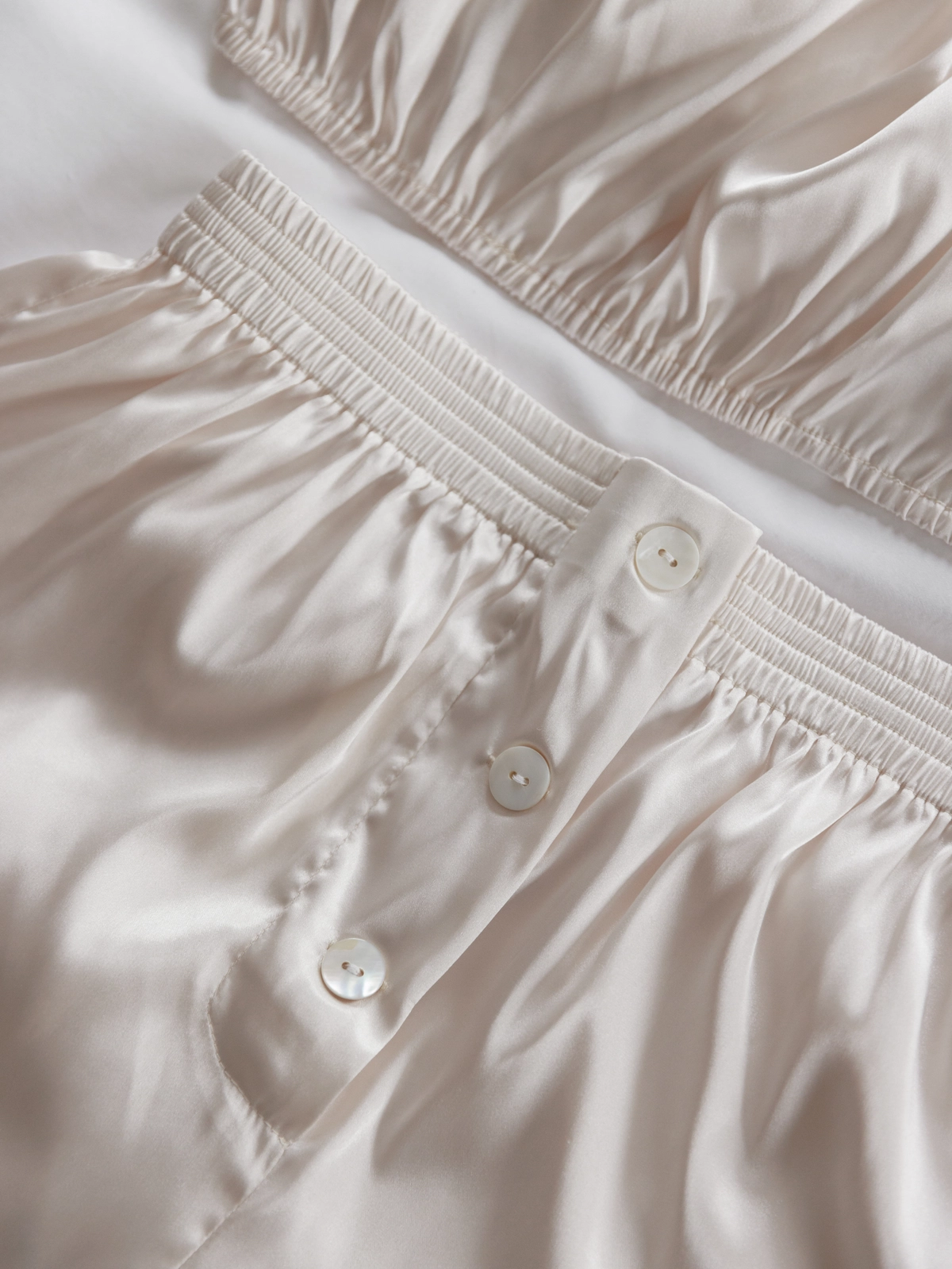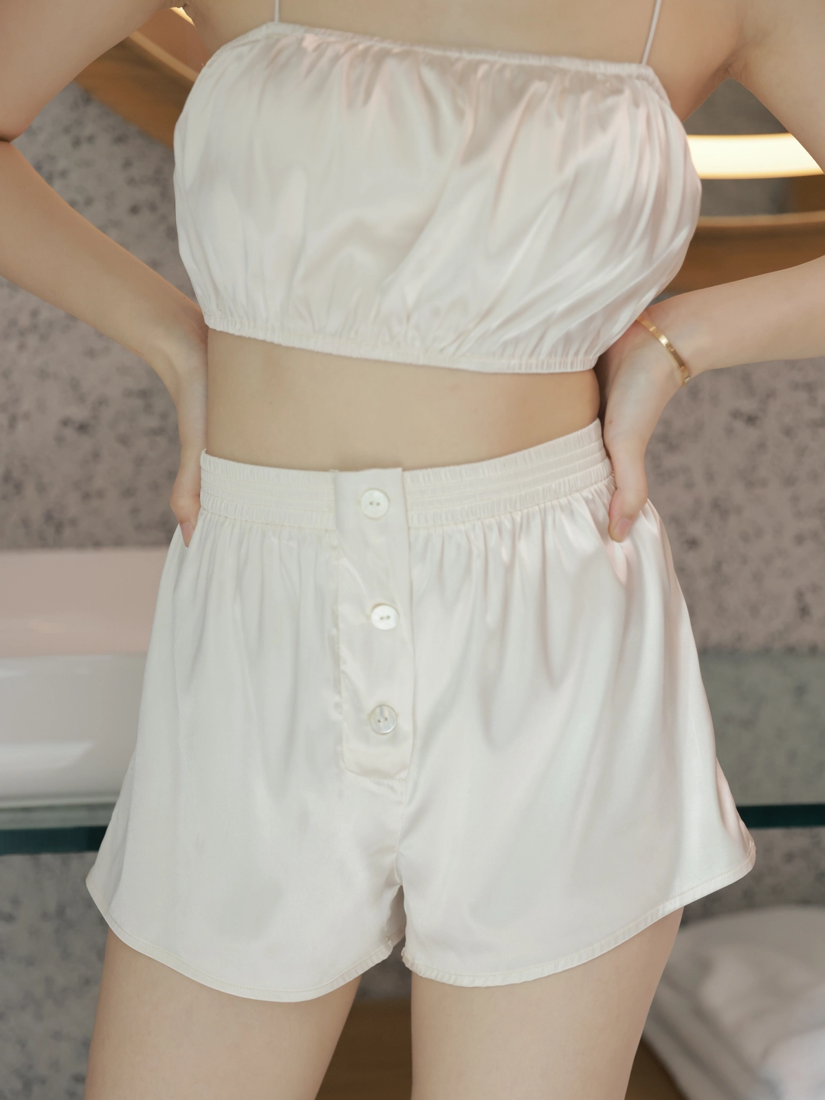 法式優雅平口抓皺Bra Top睡衣組-奶油白