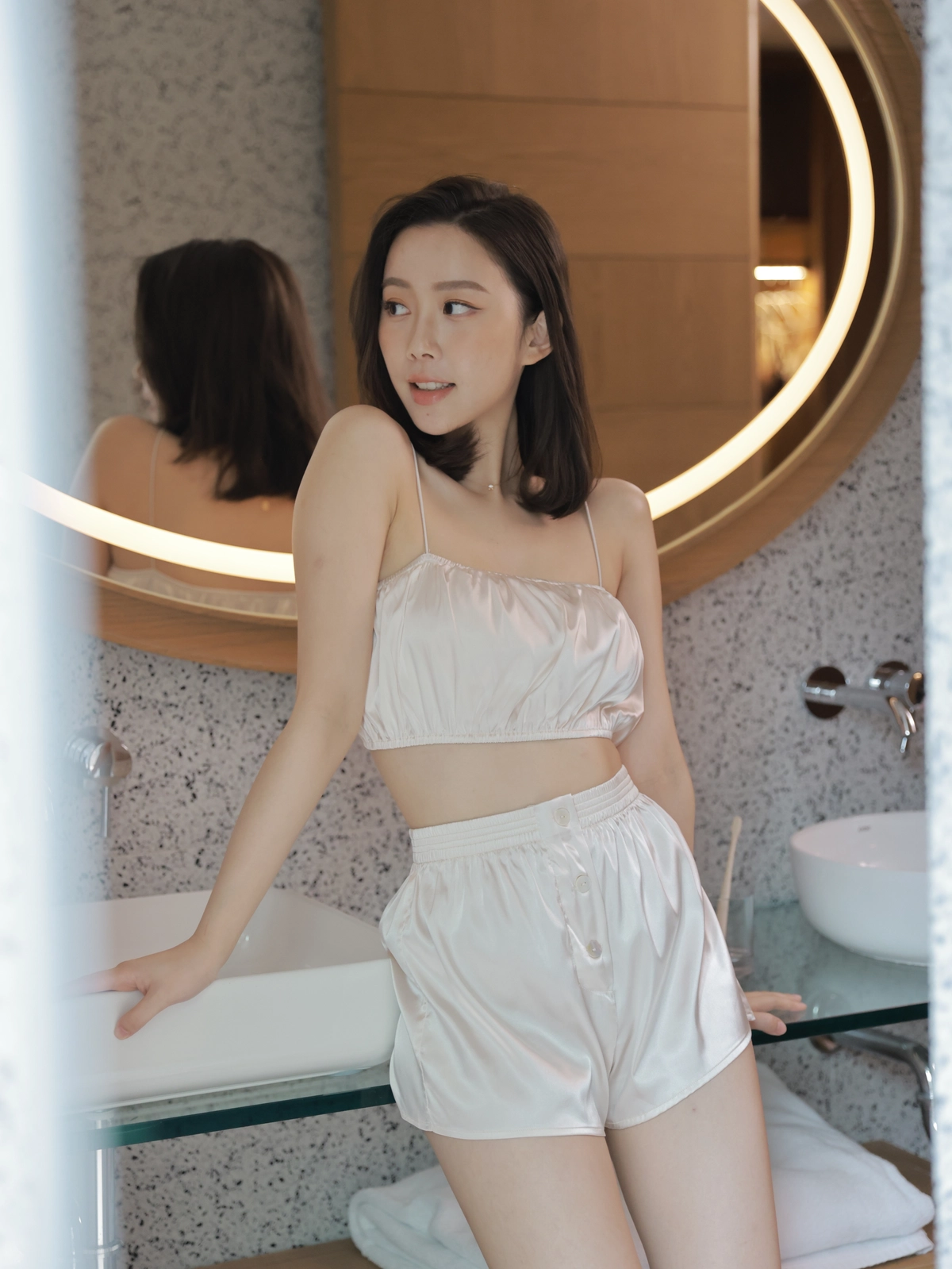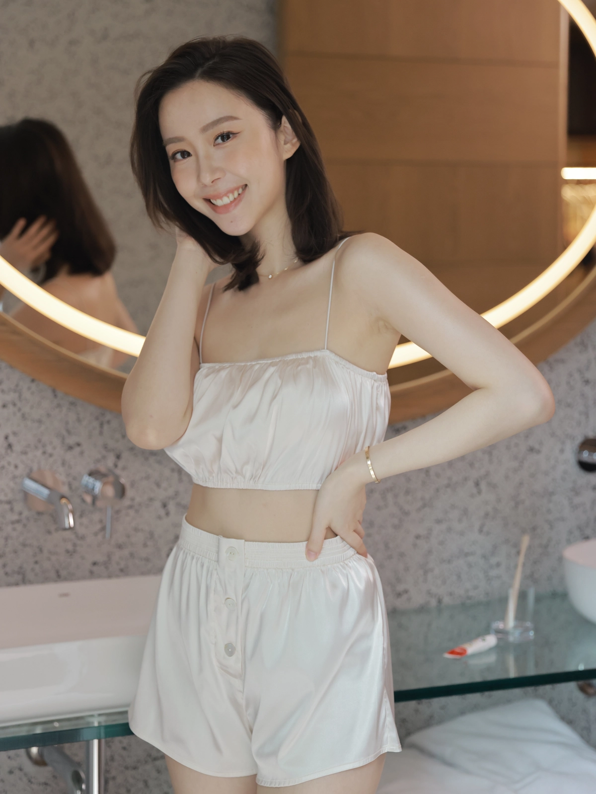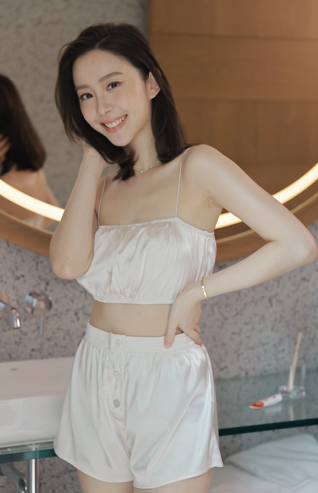 法式優雅平口抓皺Bra Top睡衣組-奶油白