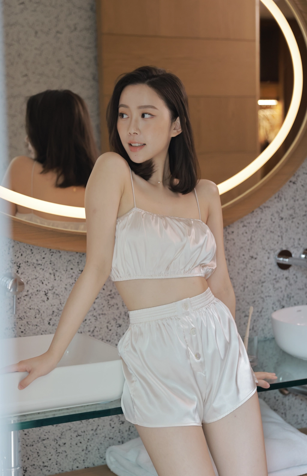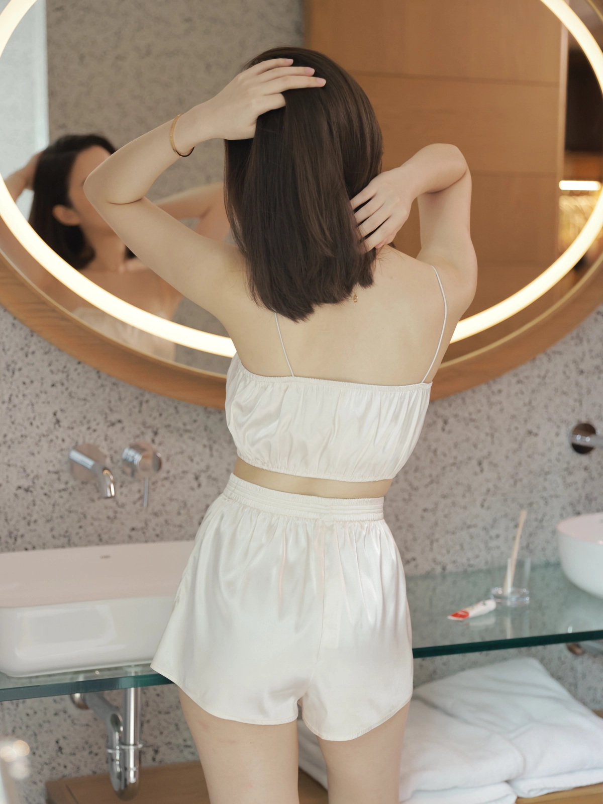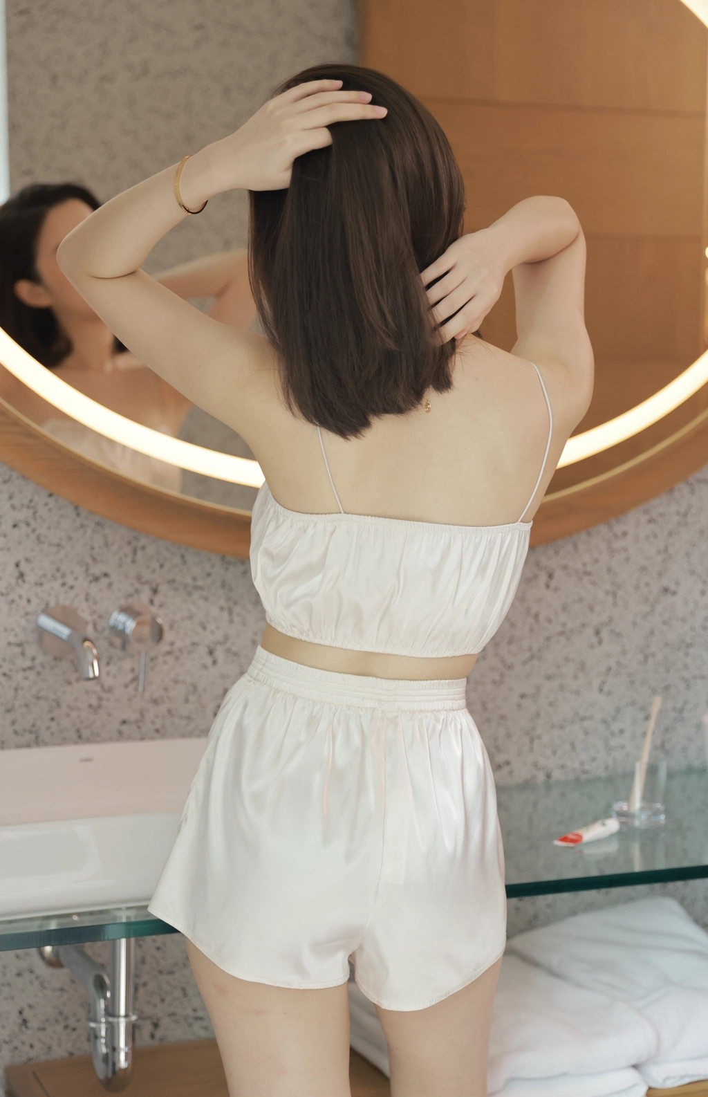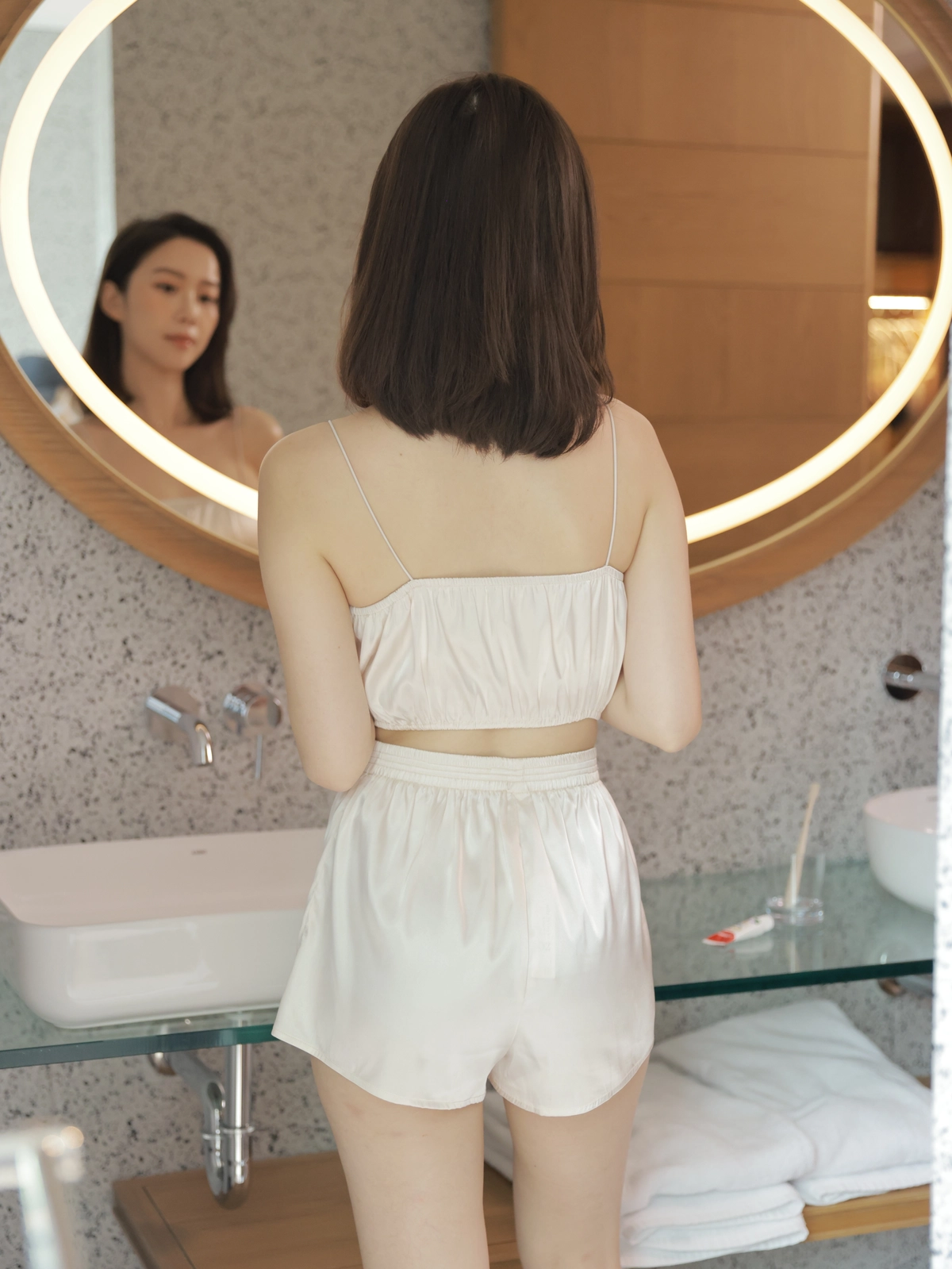 法式優雅平口抓皺Bra Top睡衣組-奶油白