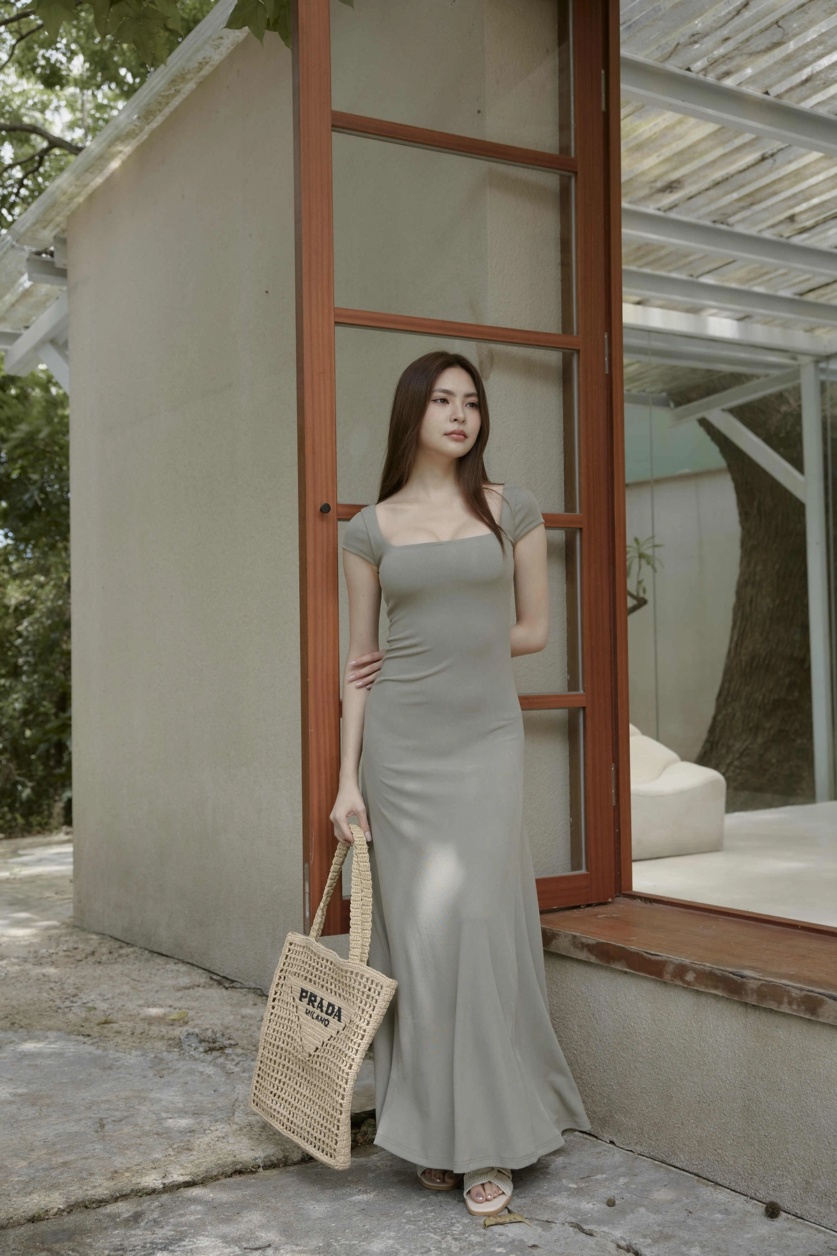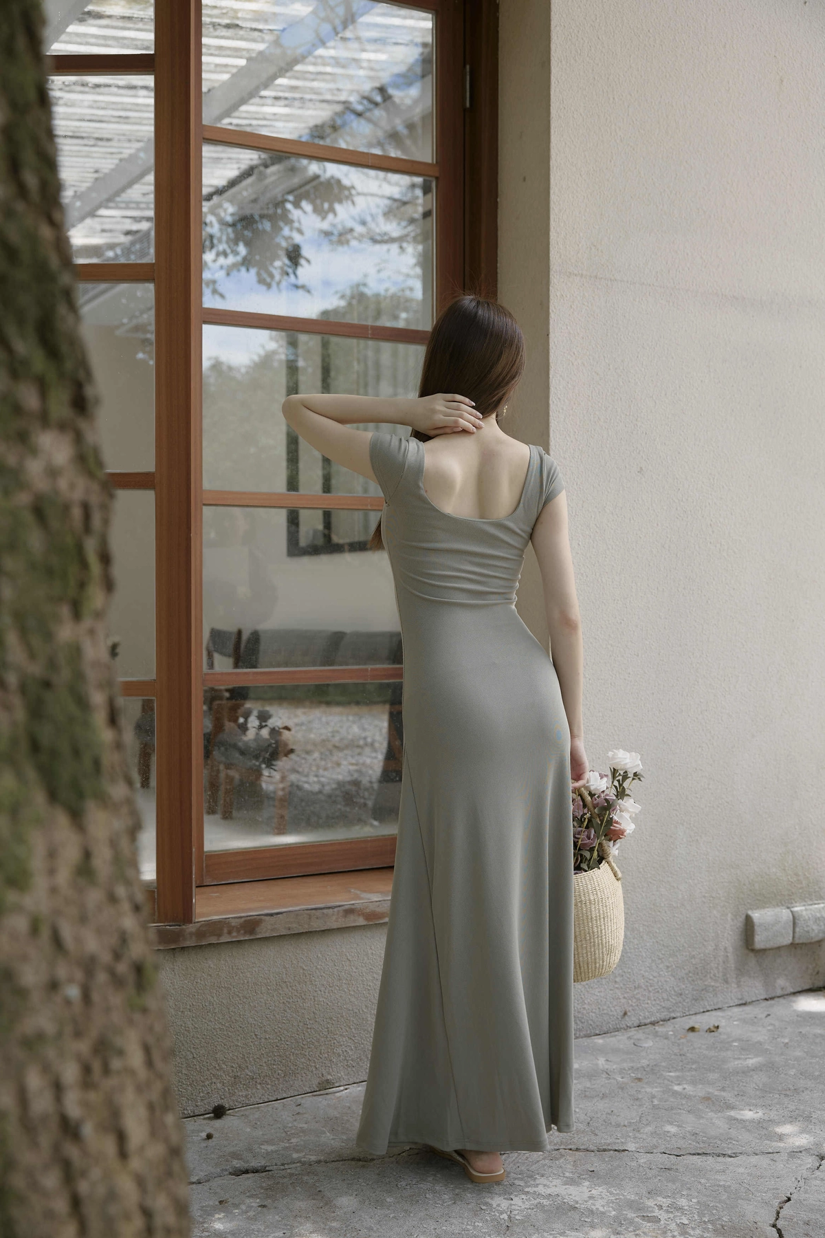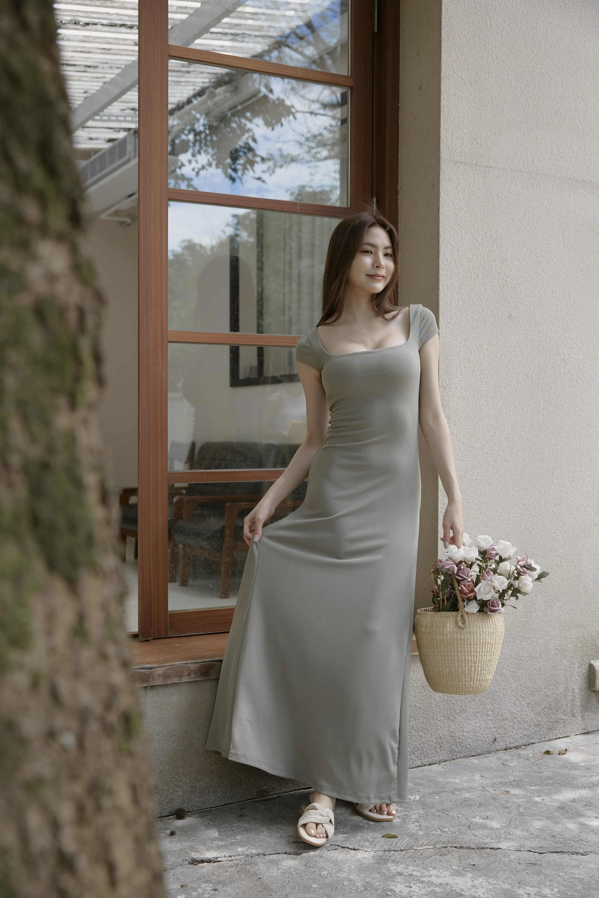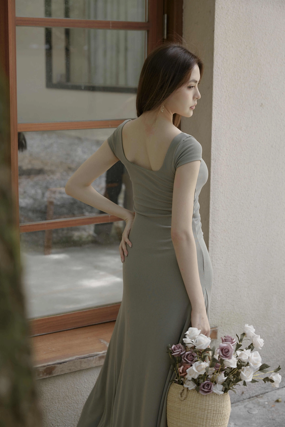 方領短袖收腰傘擺Bra Dress-抹茶綠