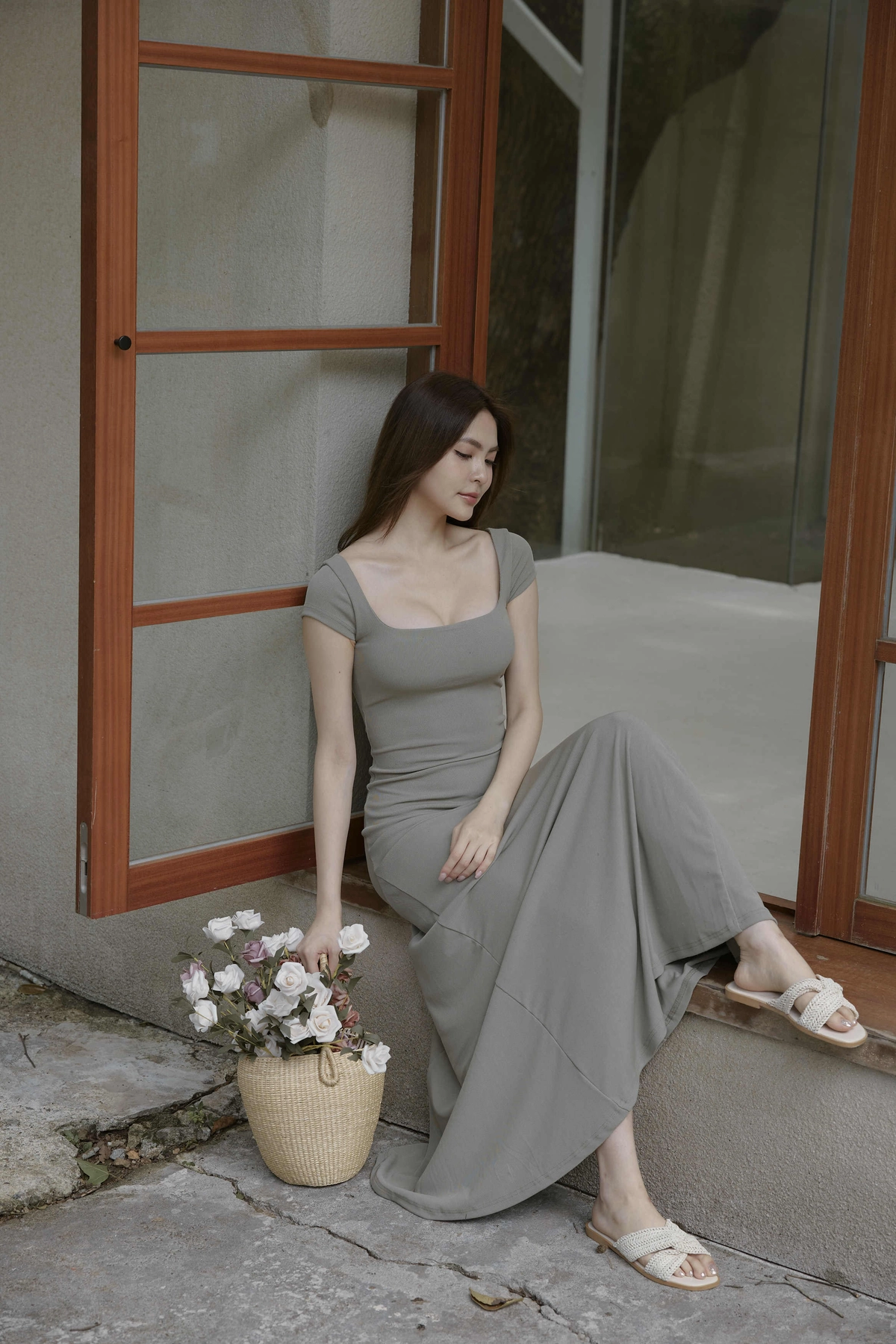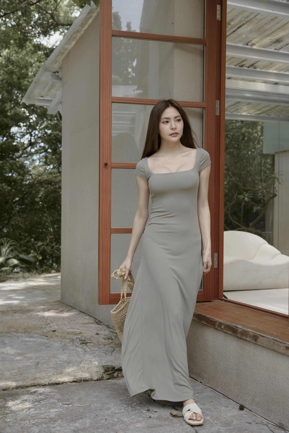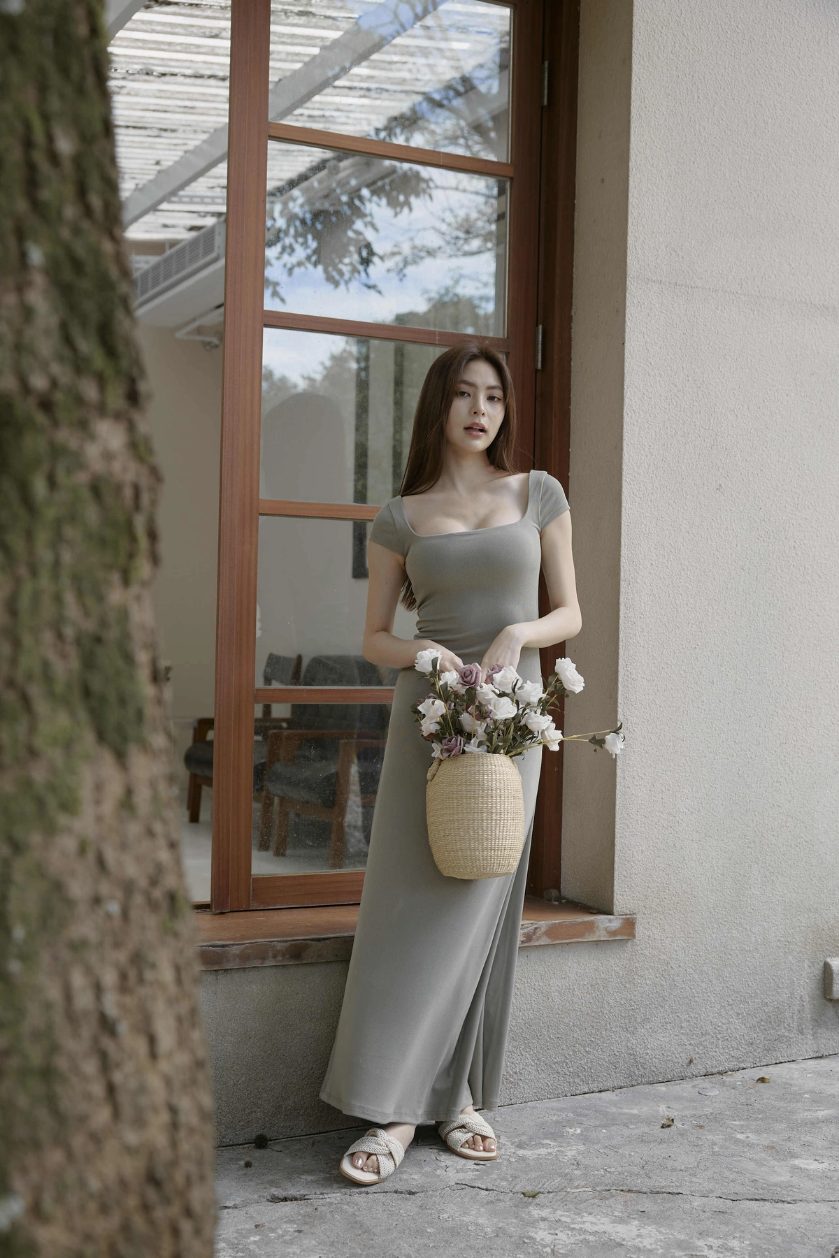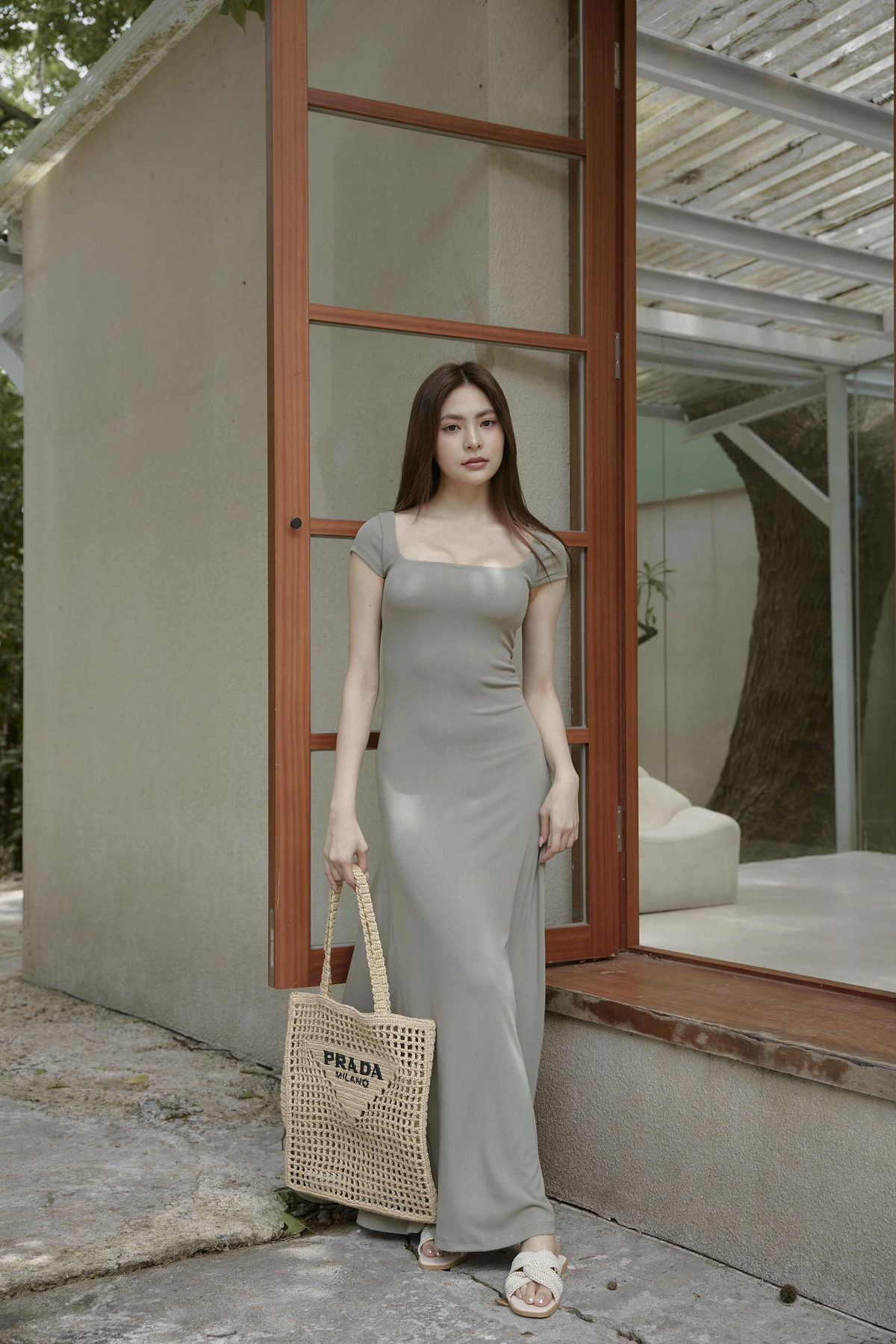 方領短袖收腰傘擺Bra Dress-抹茶綠