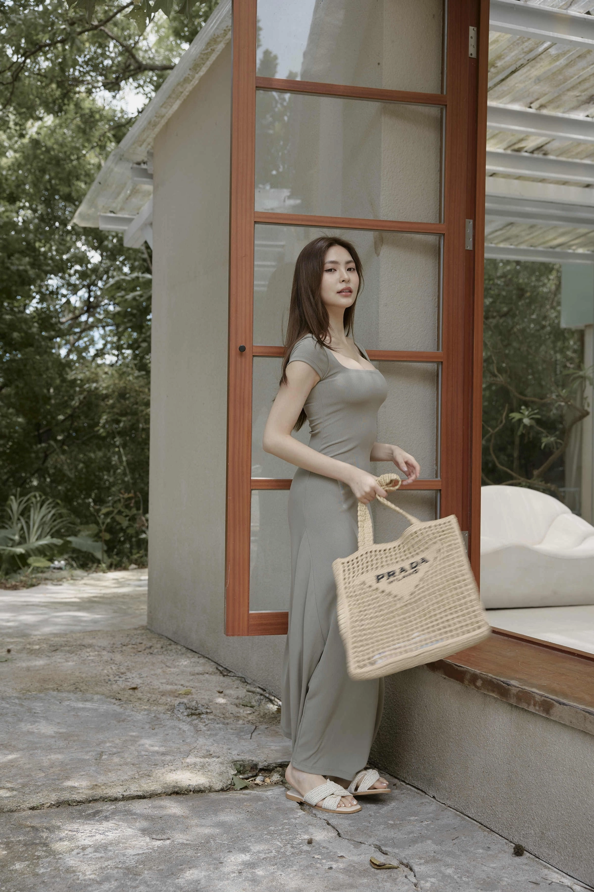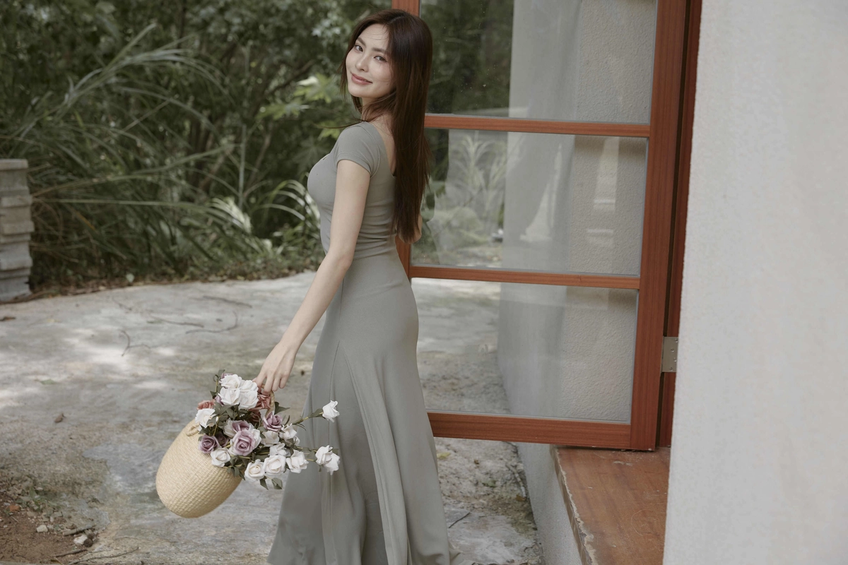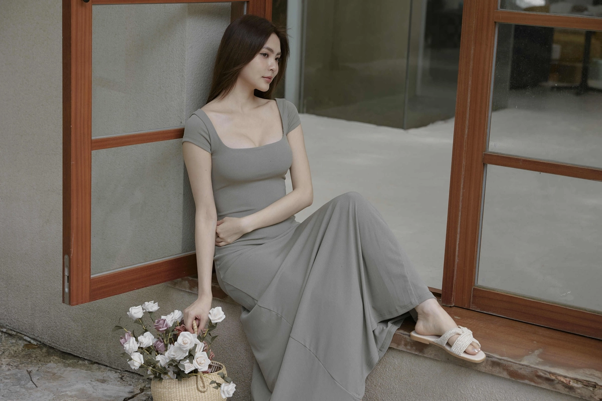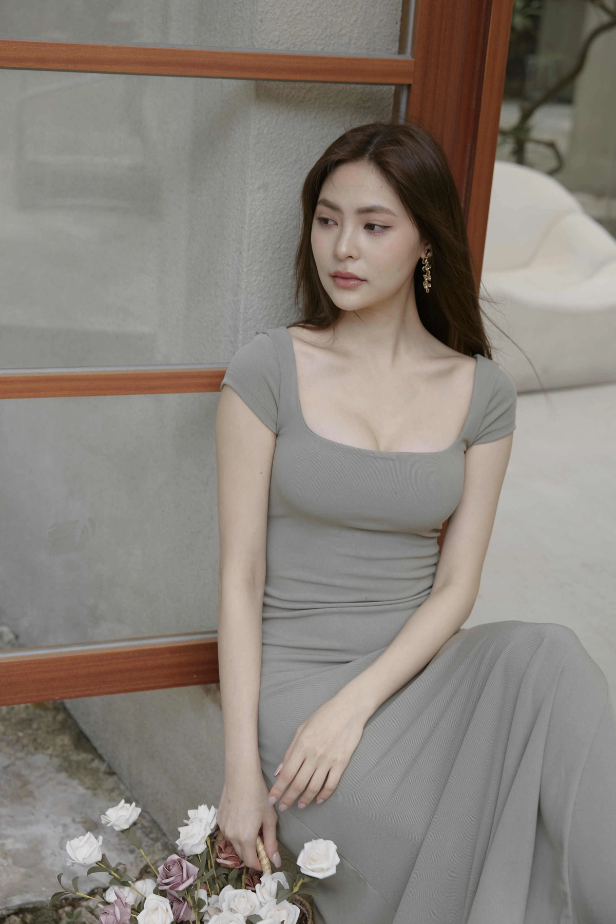 方領短袖收腰傘擺Bra Dress-抹茶綠