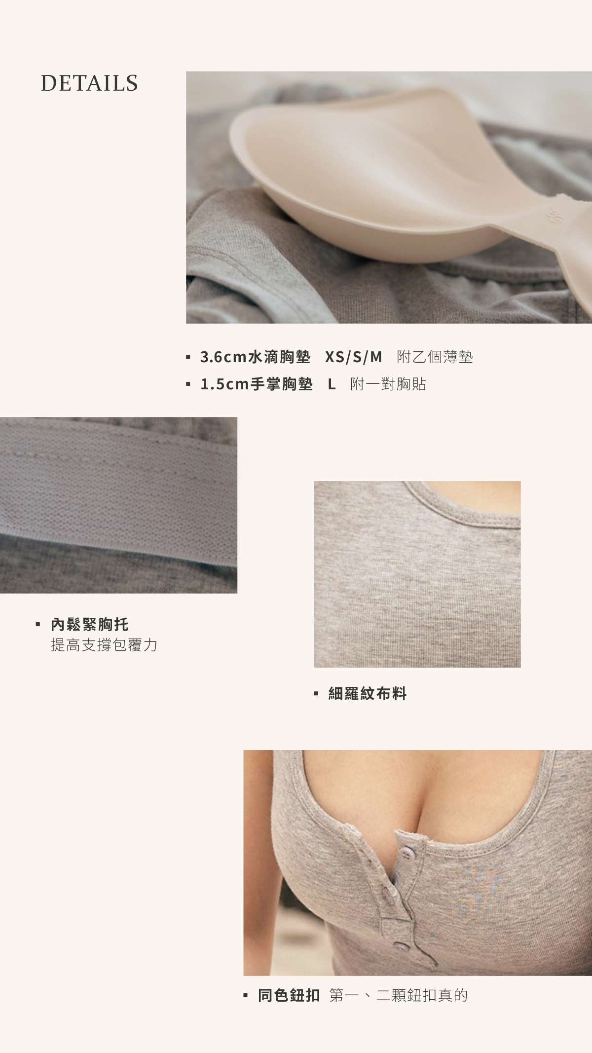 胸托下圍鬆緊設計,胸部/胸墊不易走位、下垂