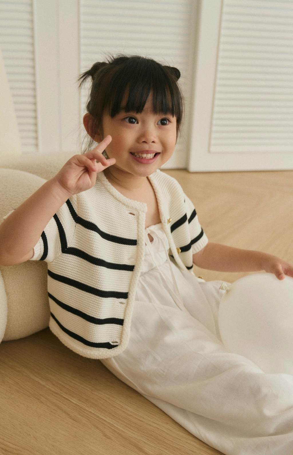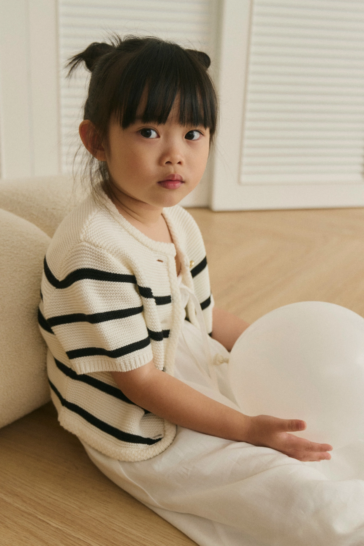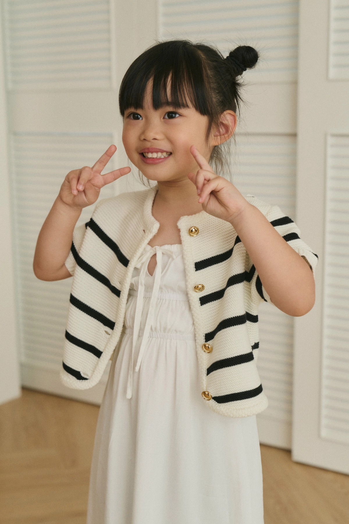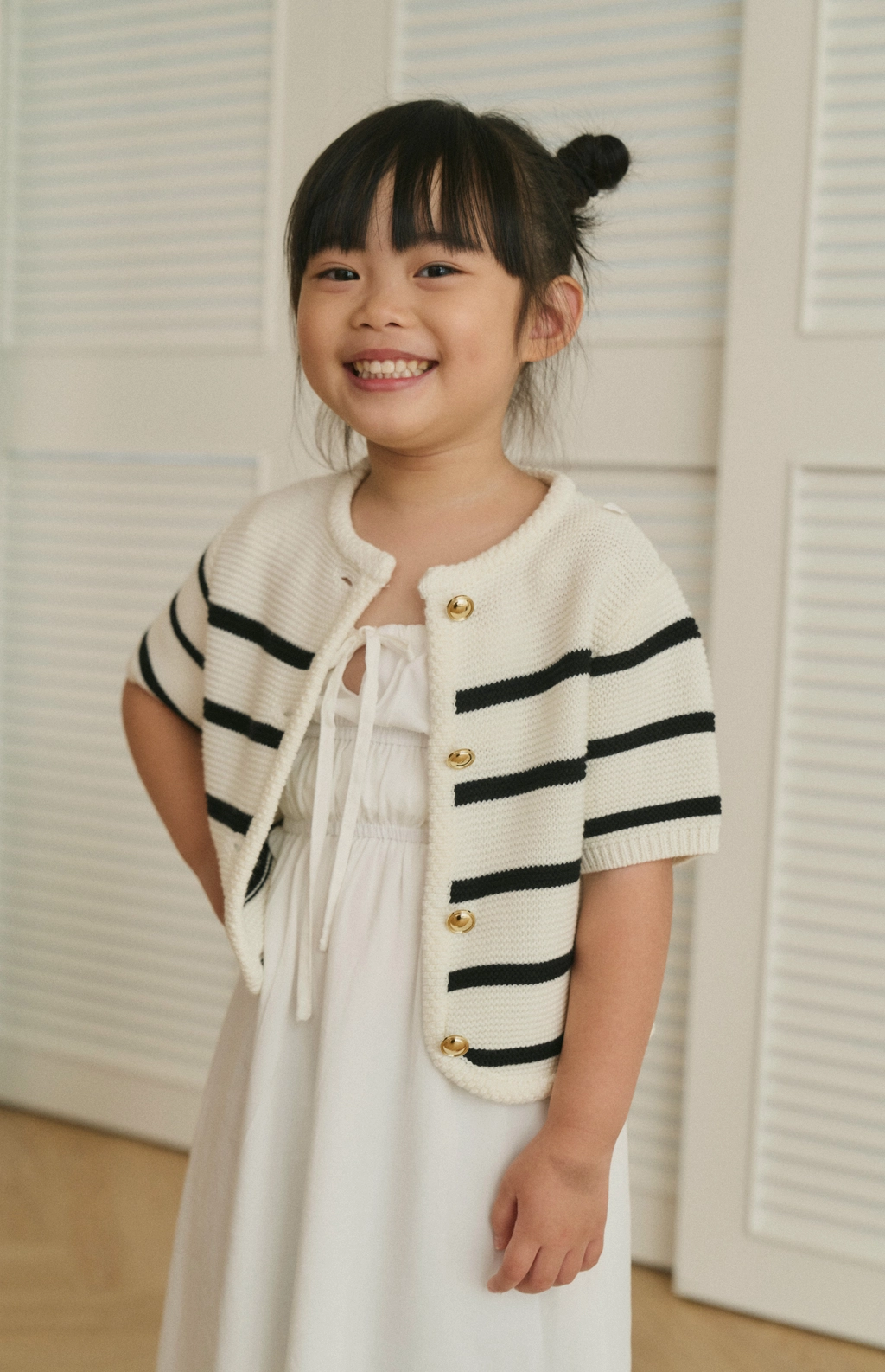 KIDS’法式圓襬包邊針織外套-白底黑條