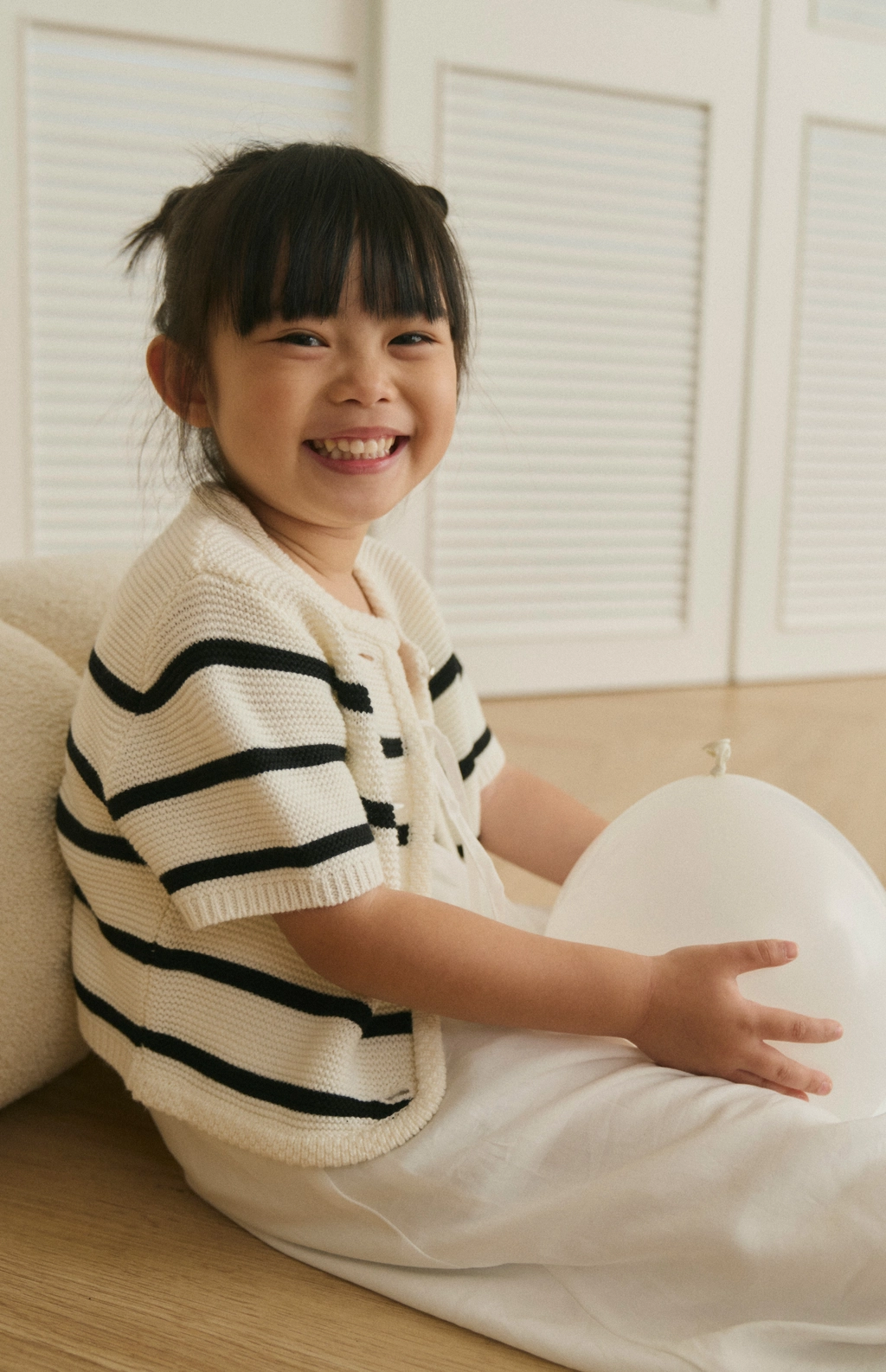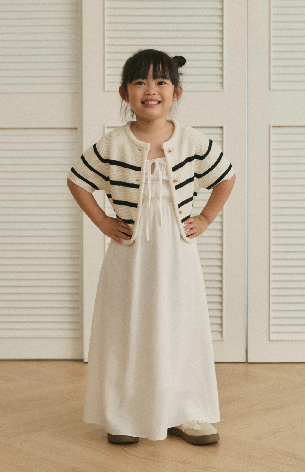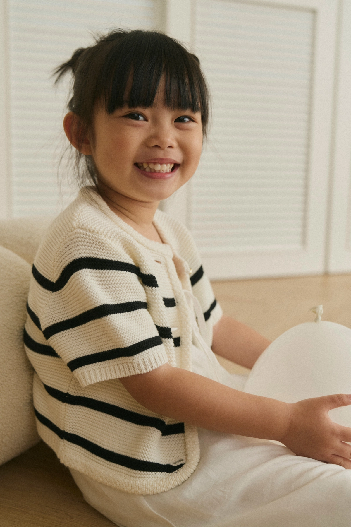 KIDS’法式圓襬包邊針織外套-白底黑條