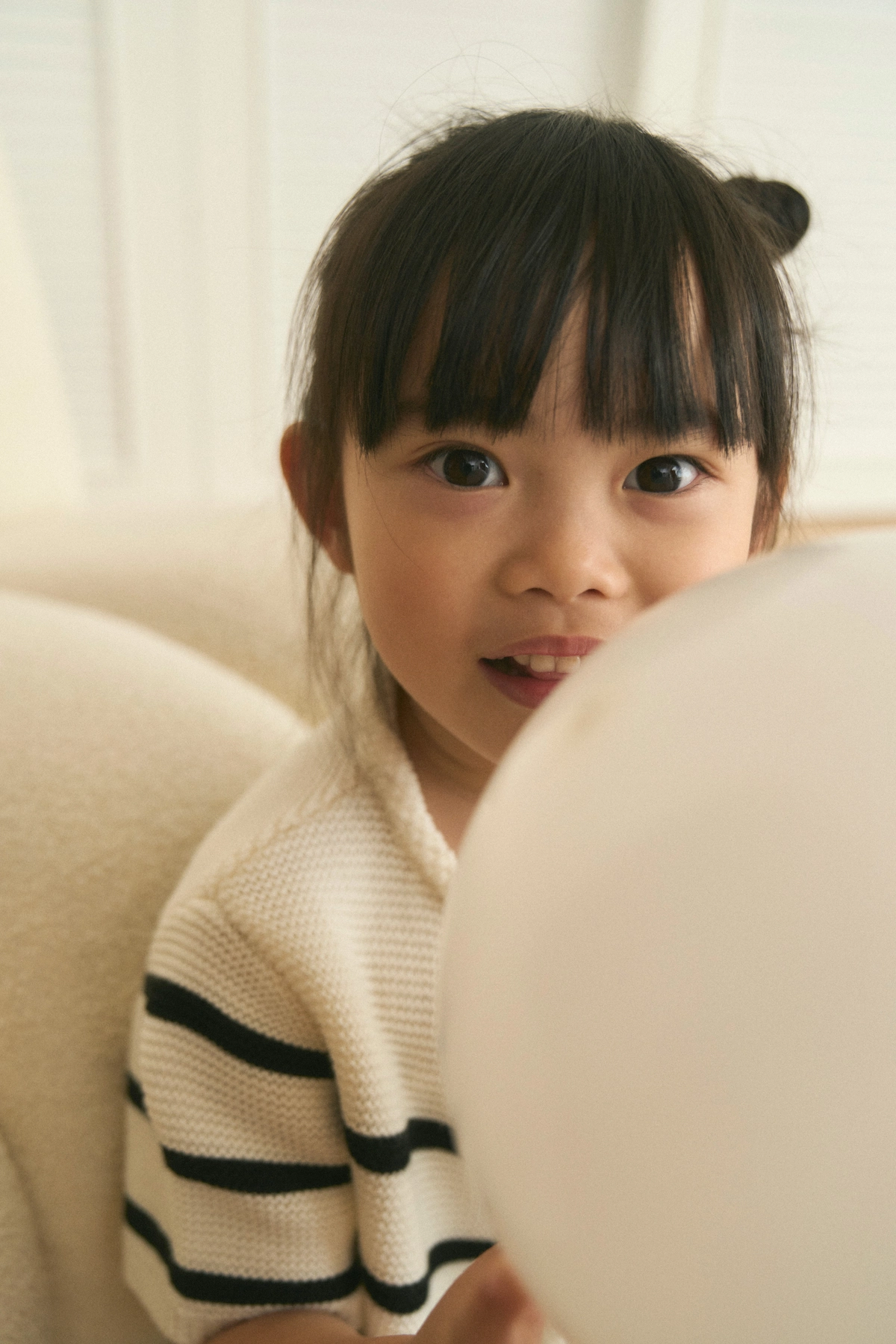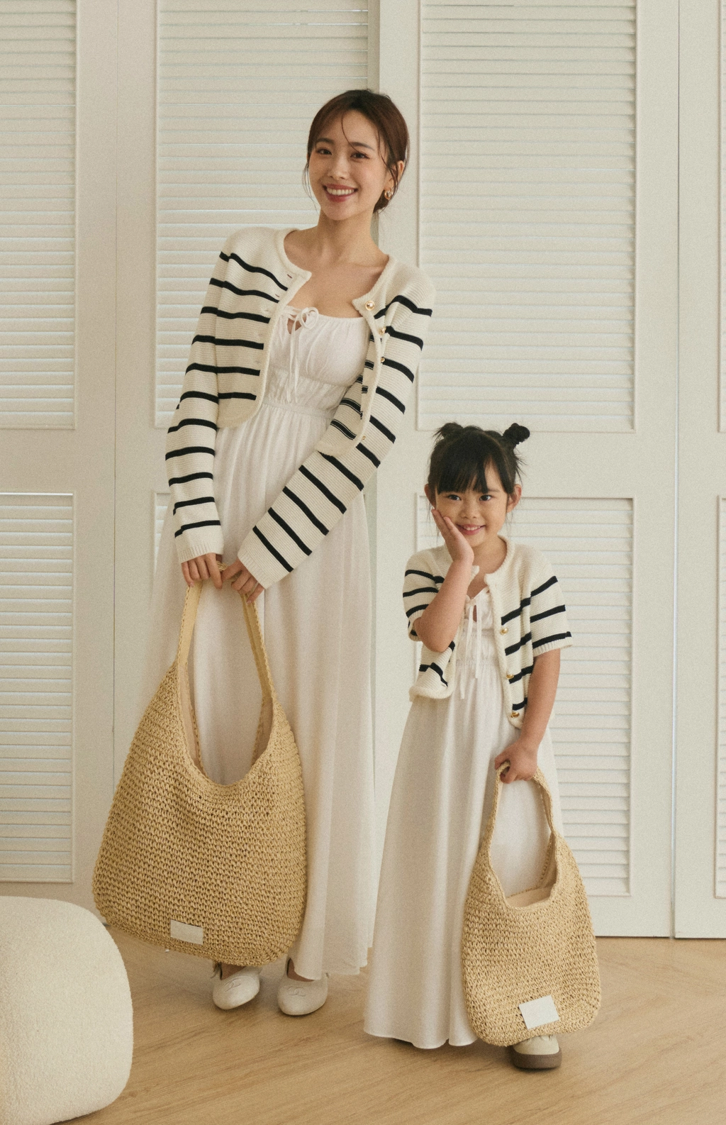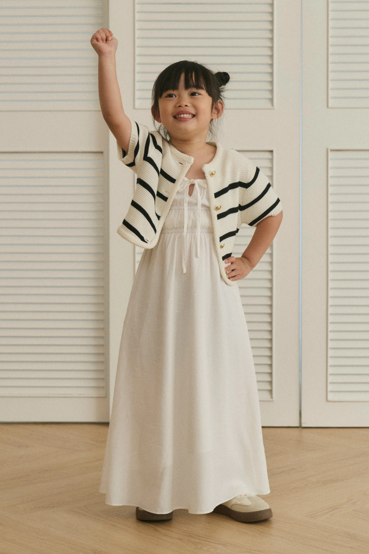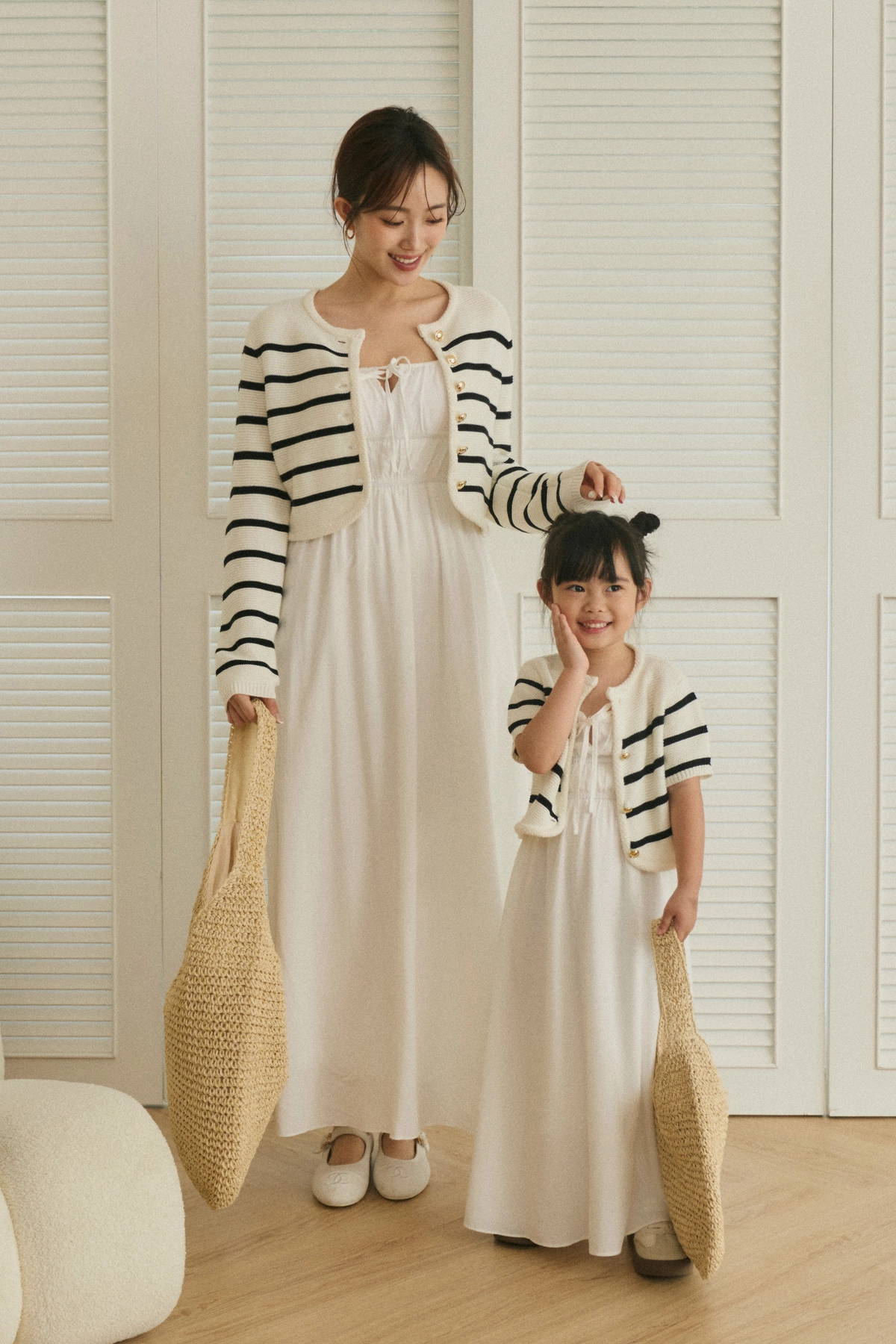KIDS’法式圓襬包邊針織外套-白底黑條