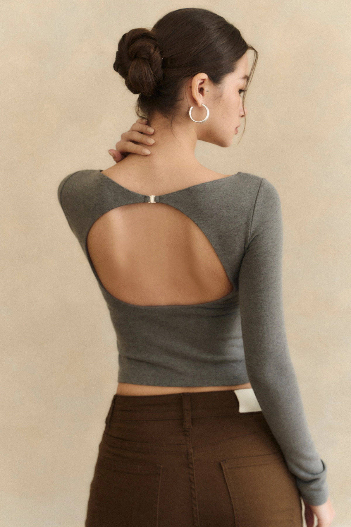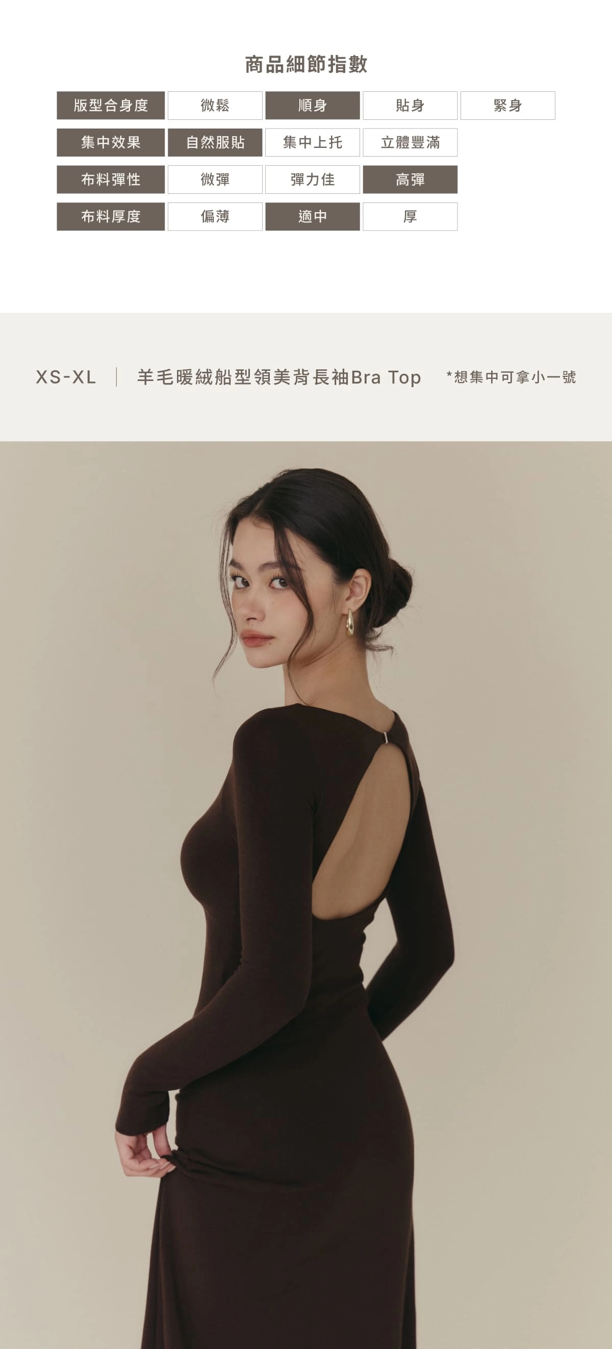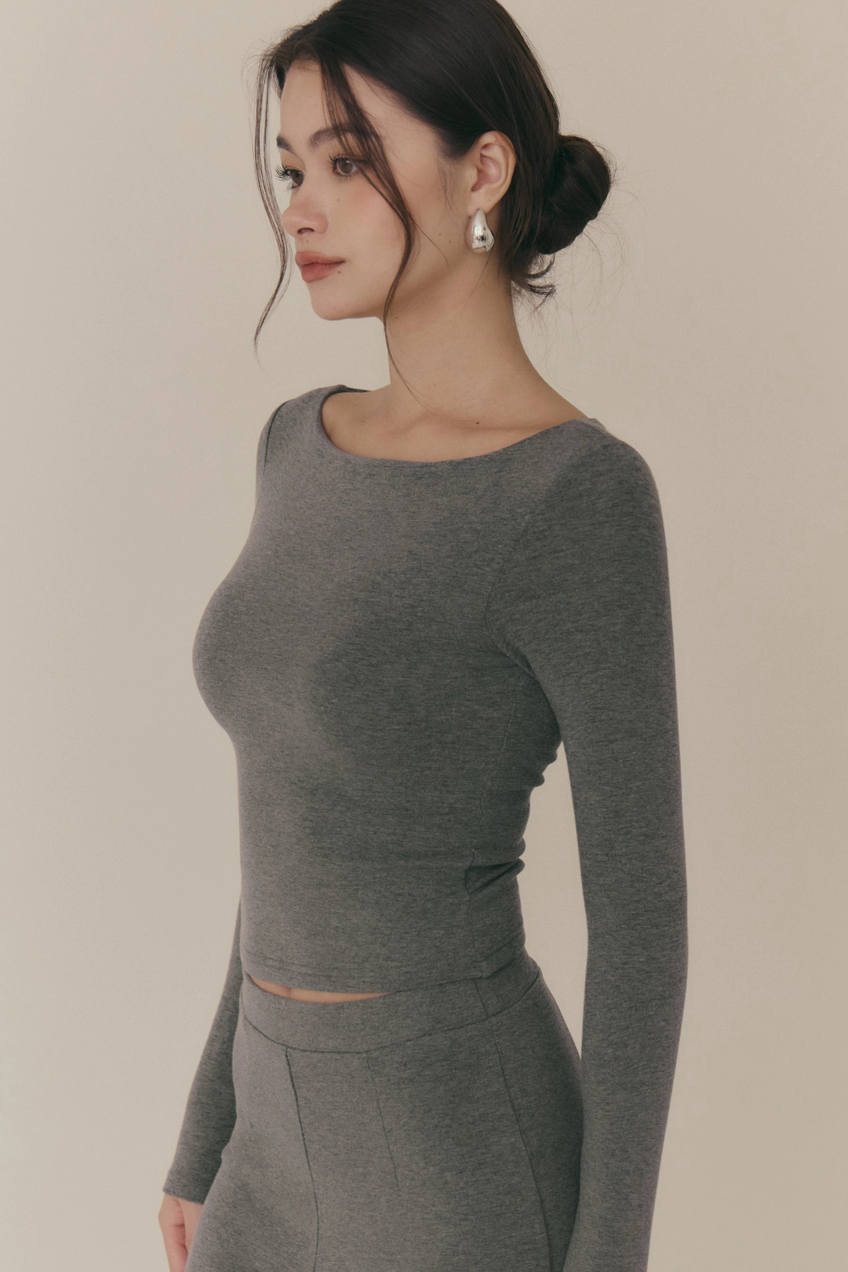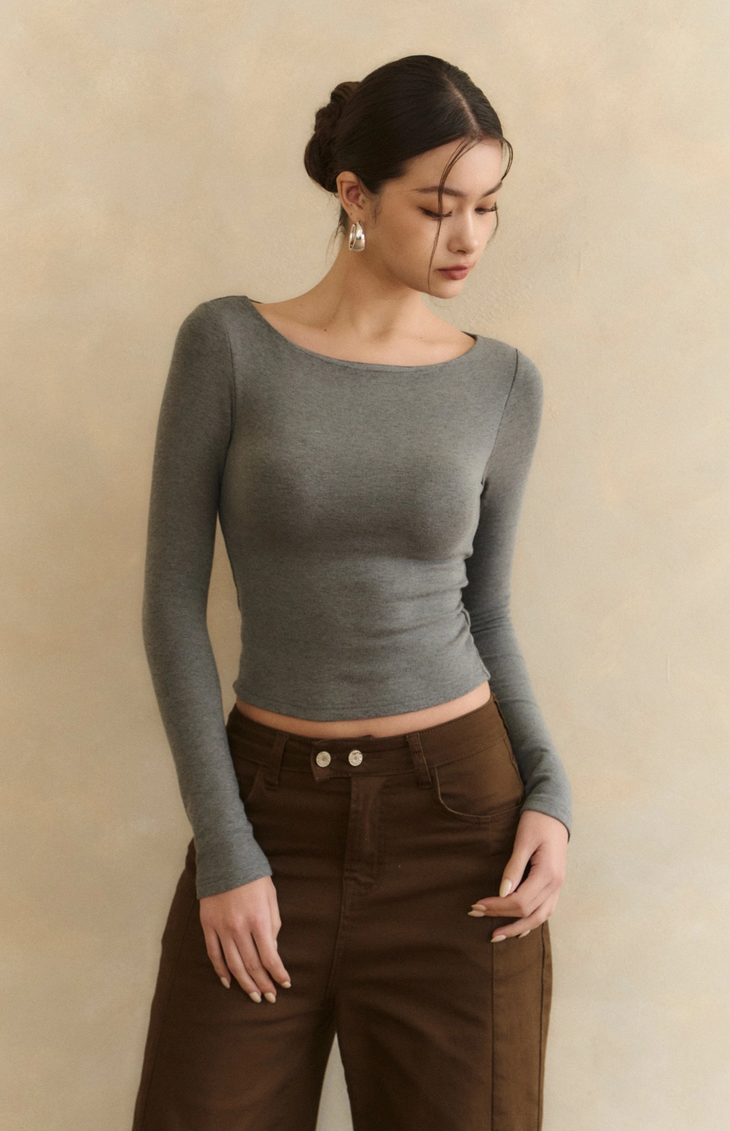 羊毛暖絨船型領美背長袖Bra Top-深花灰
