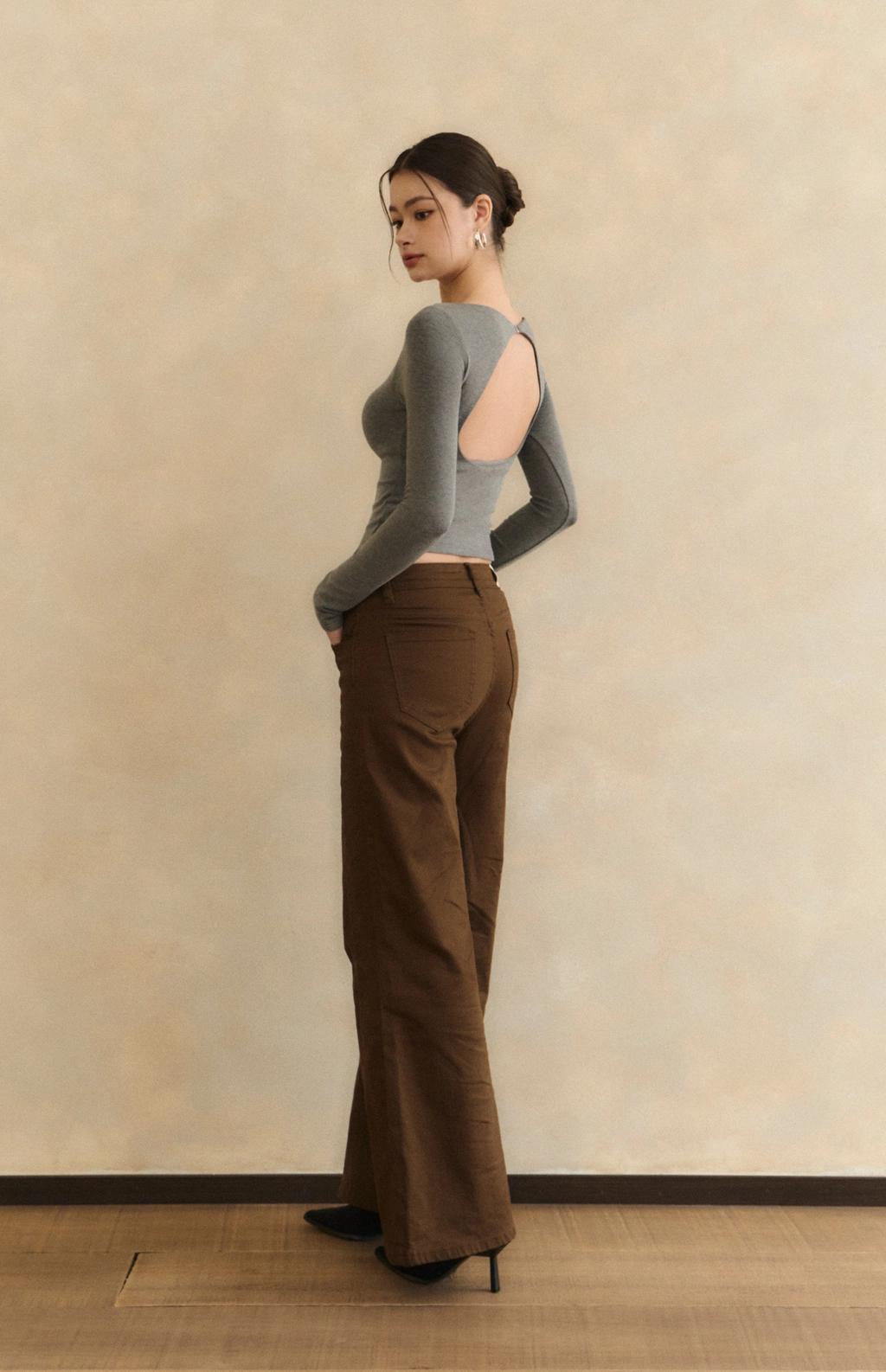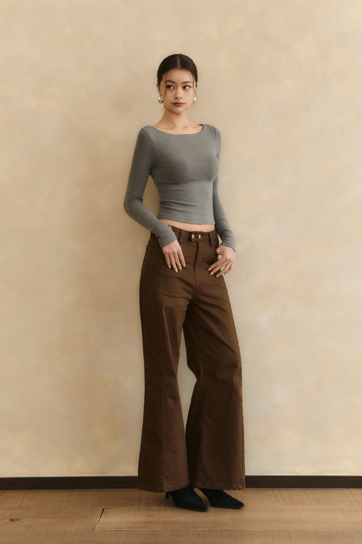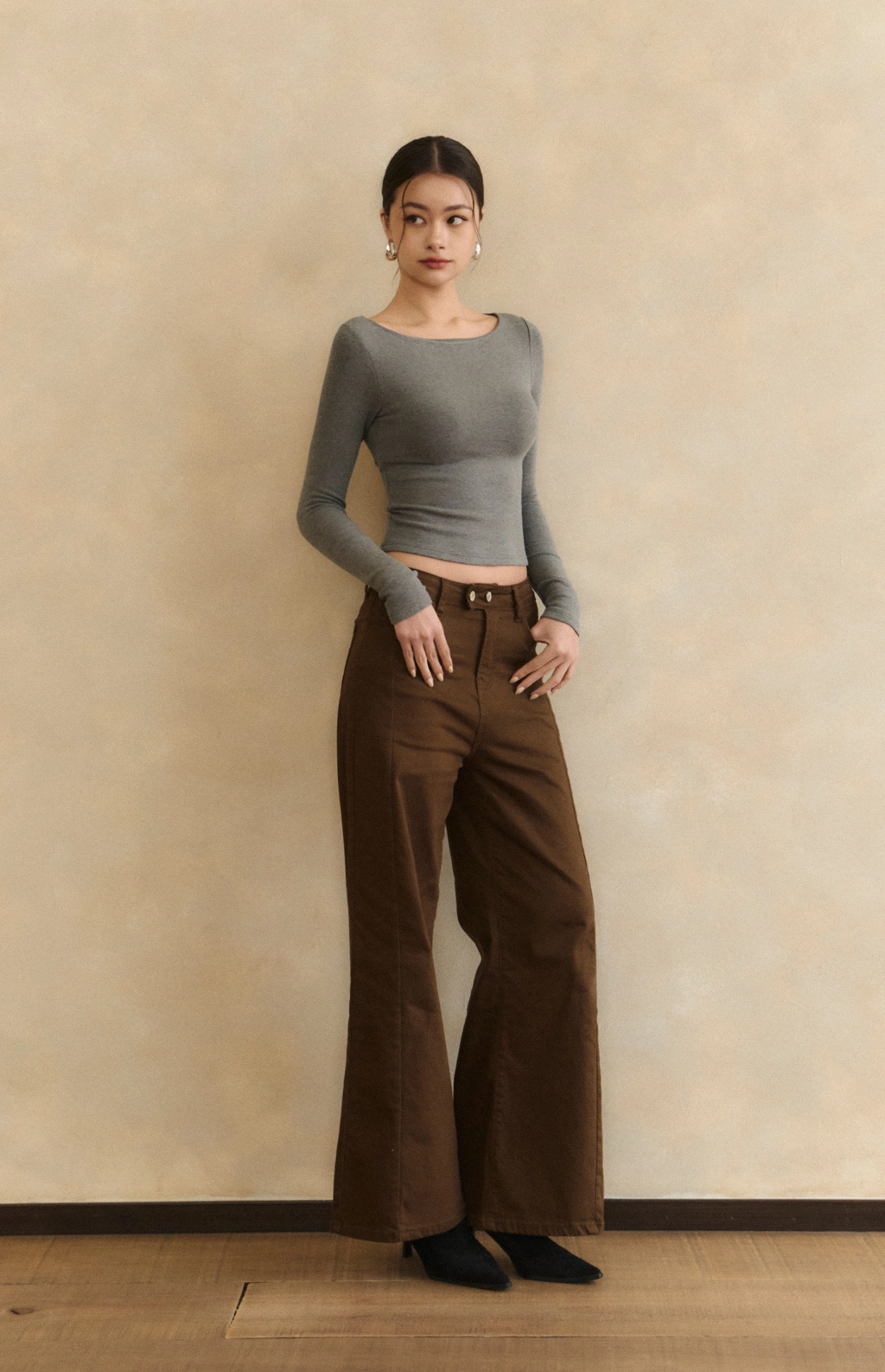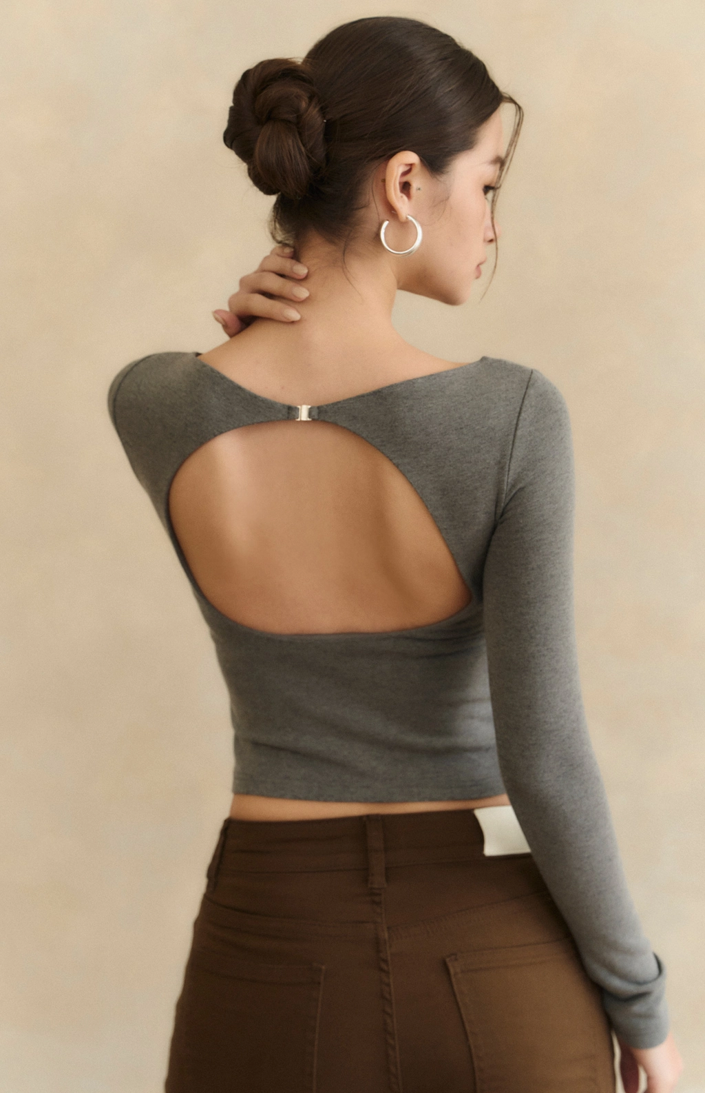 羊毛暖絨船型領美背長袖Bra Top-深花灰