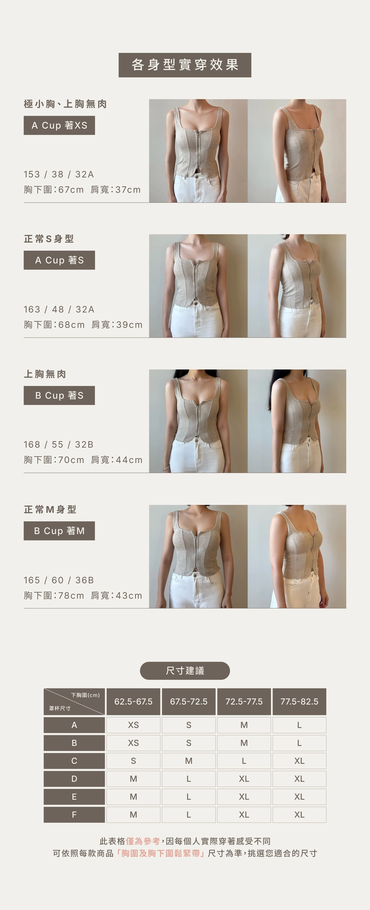 BRA TOP尺寸選購除了要參考罩杯外也需參考身高、體重