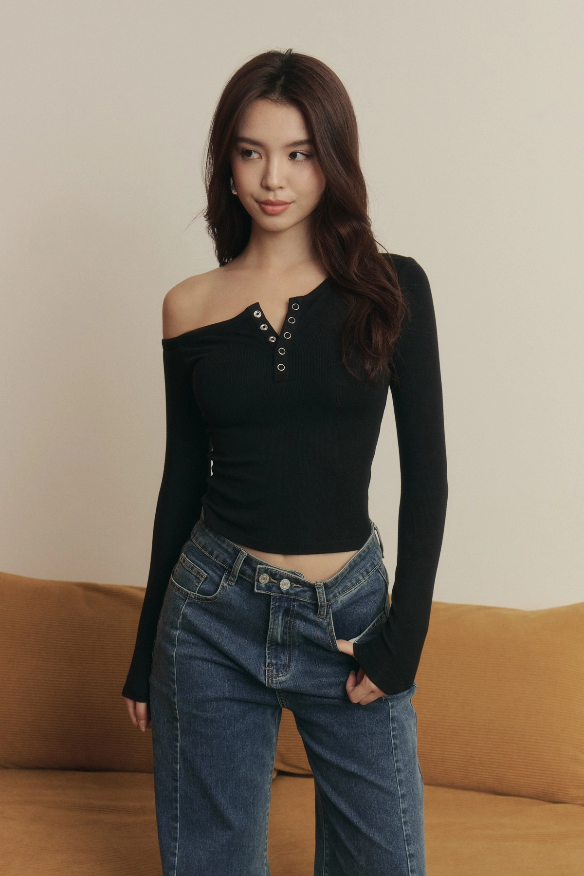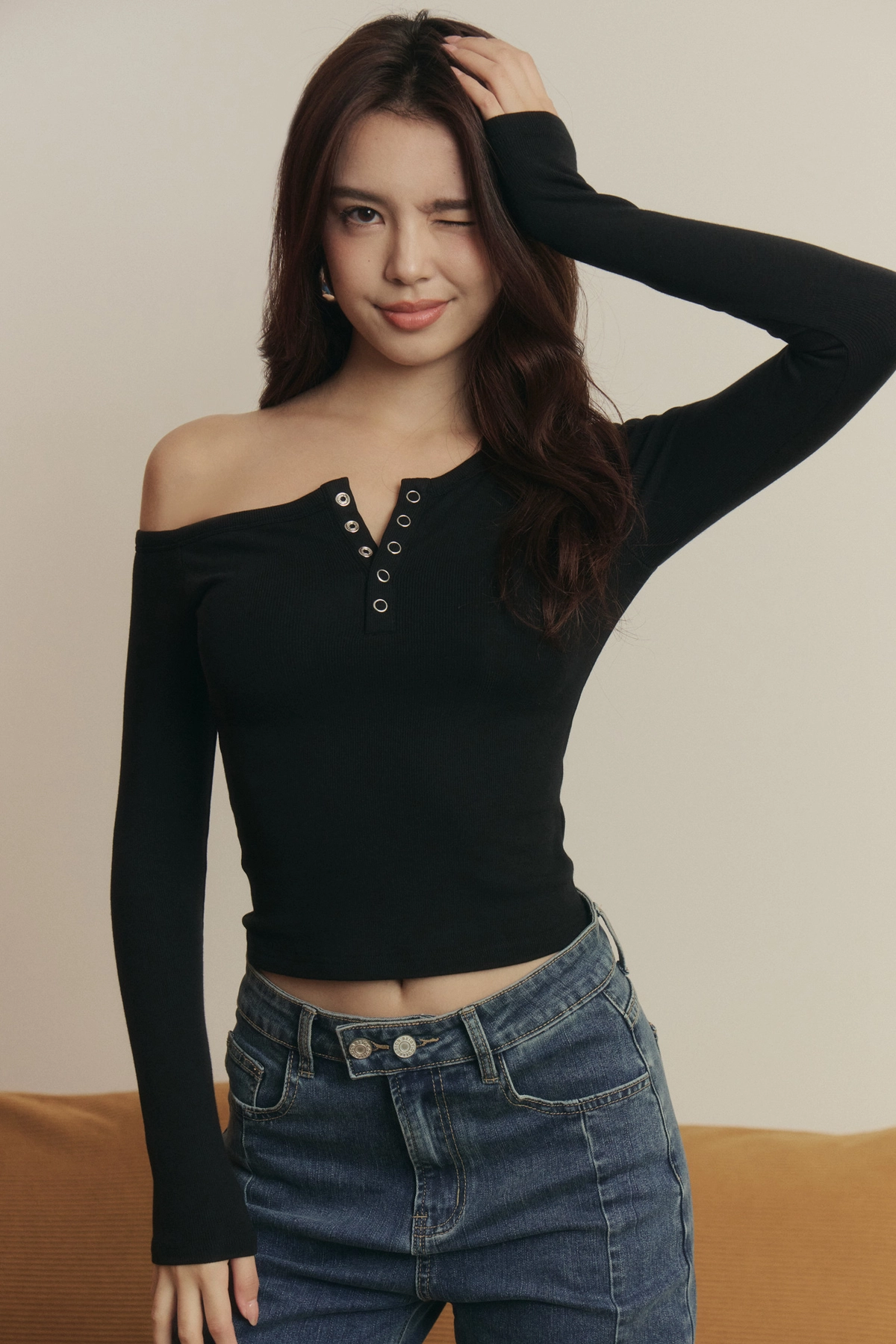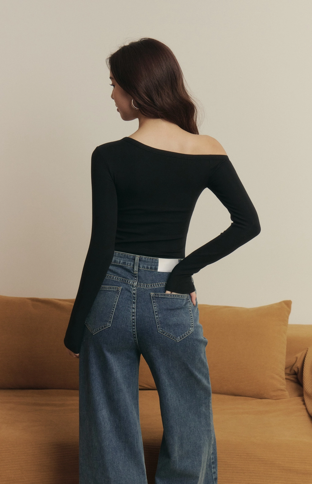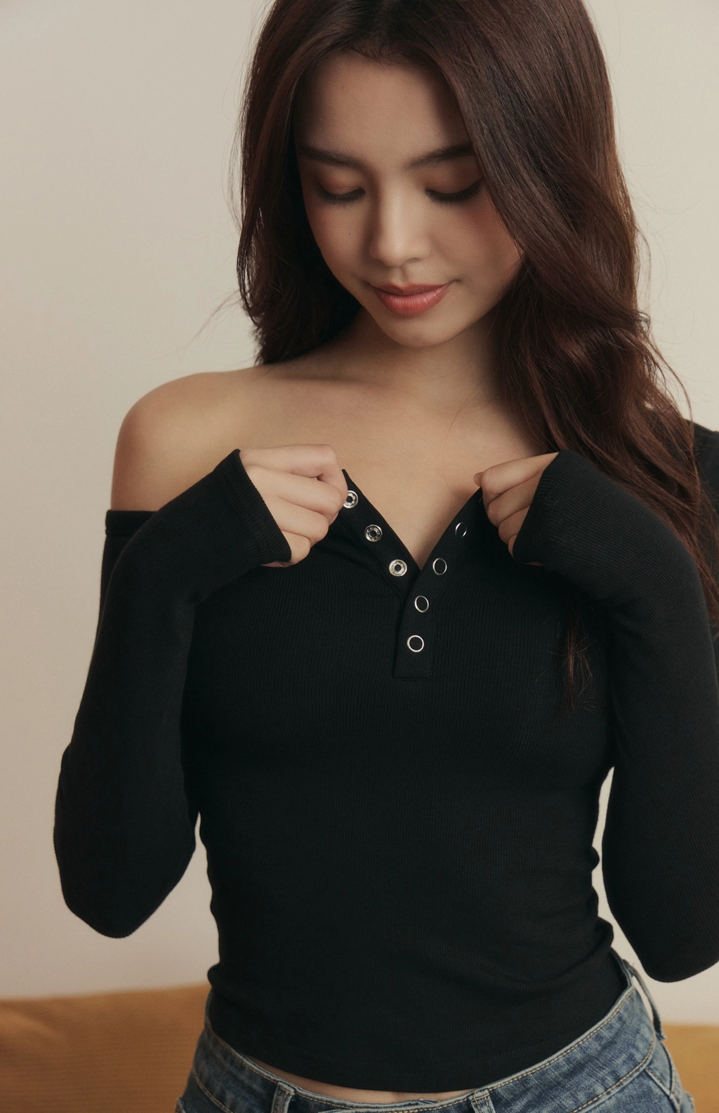 3.斜肩剪裁修飾頸肩線條,展現鎖骨曲線