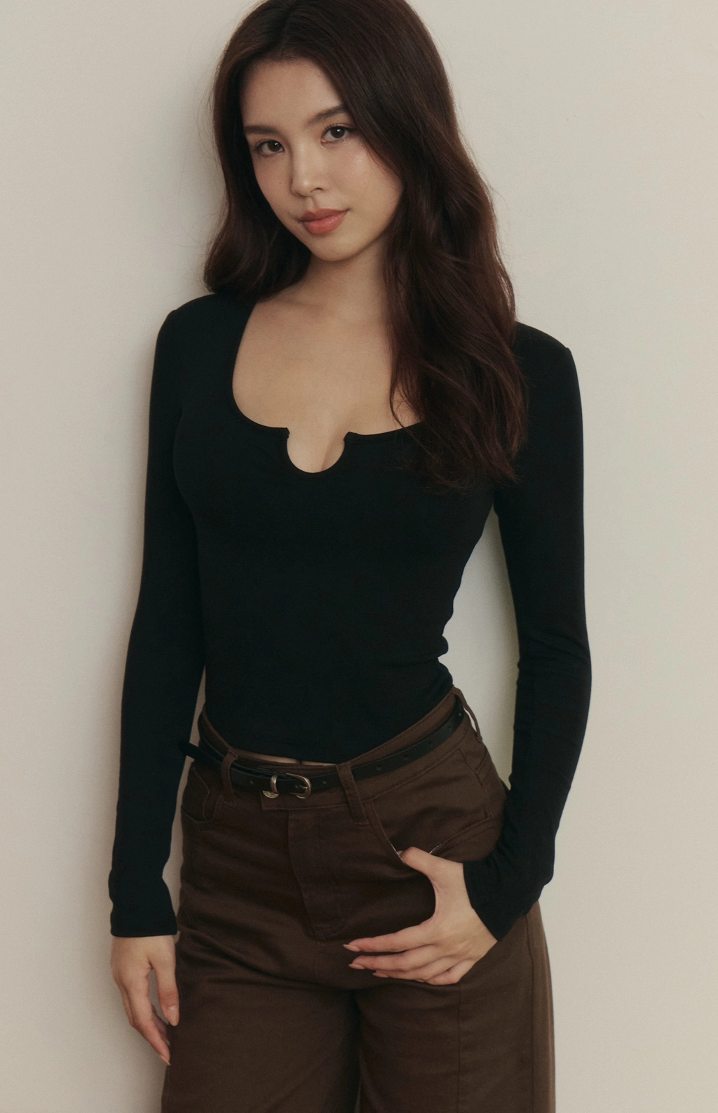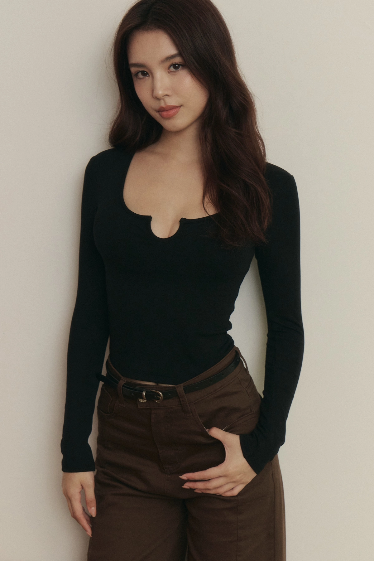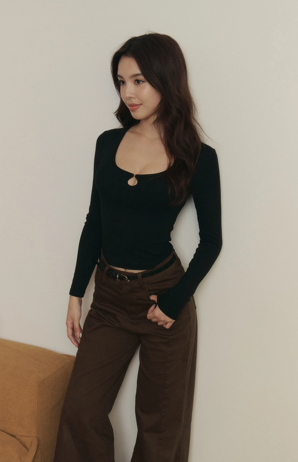 心機開釦鏤空磨毛長袖Bra Top-黑