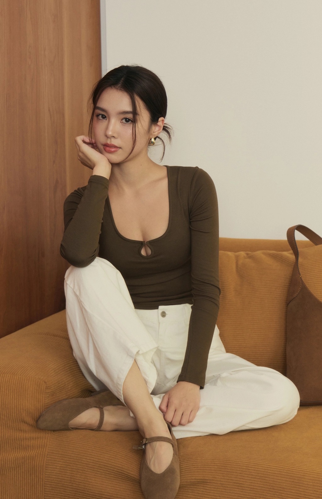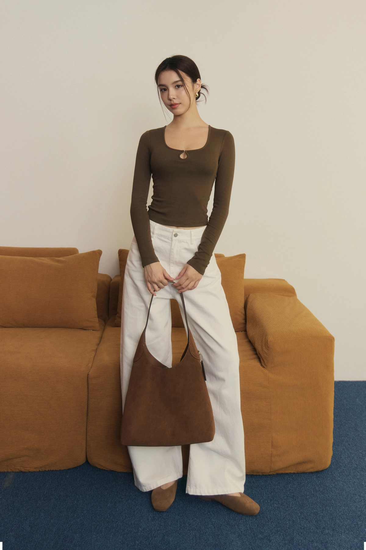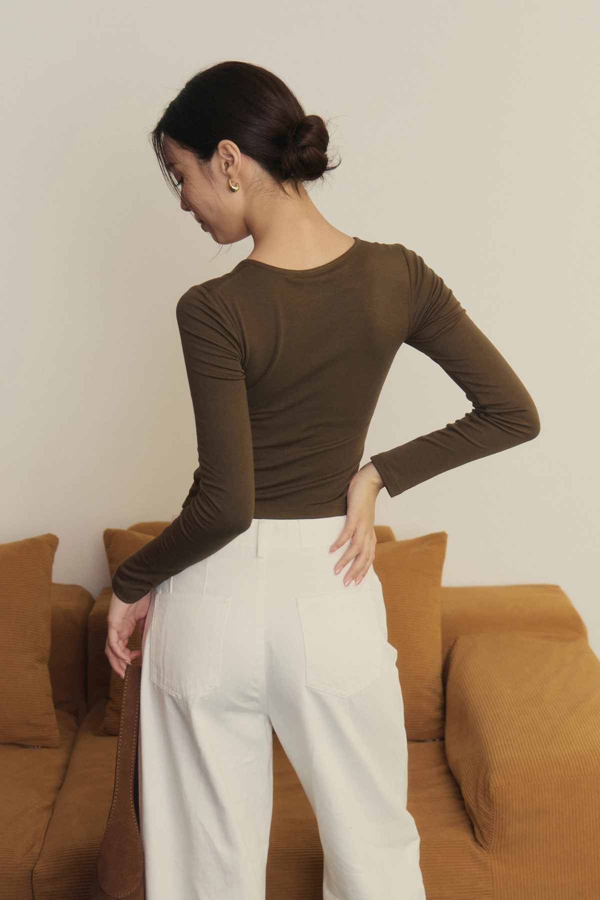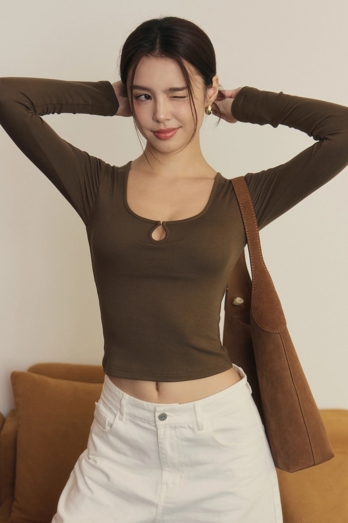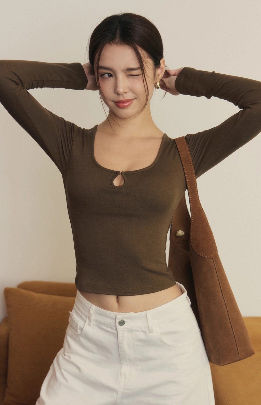 心機開釦鏤空磨毛長袖Bra Top-咖
