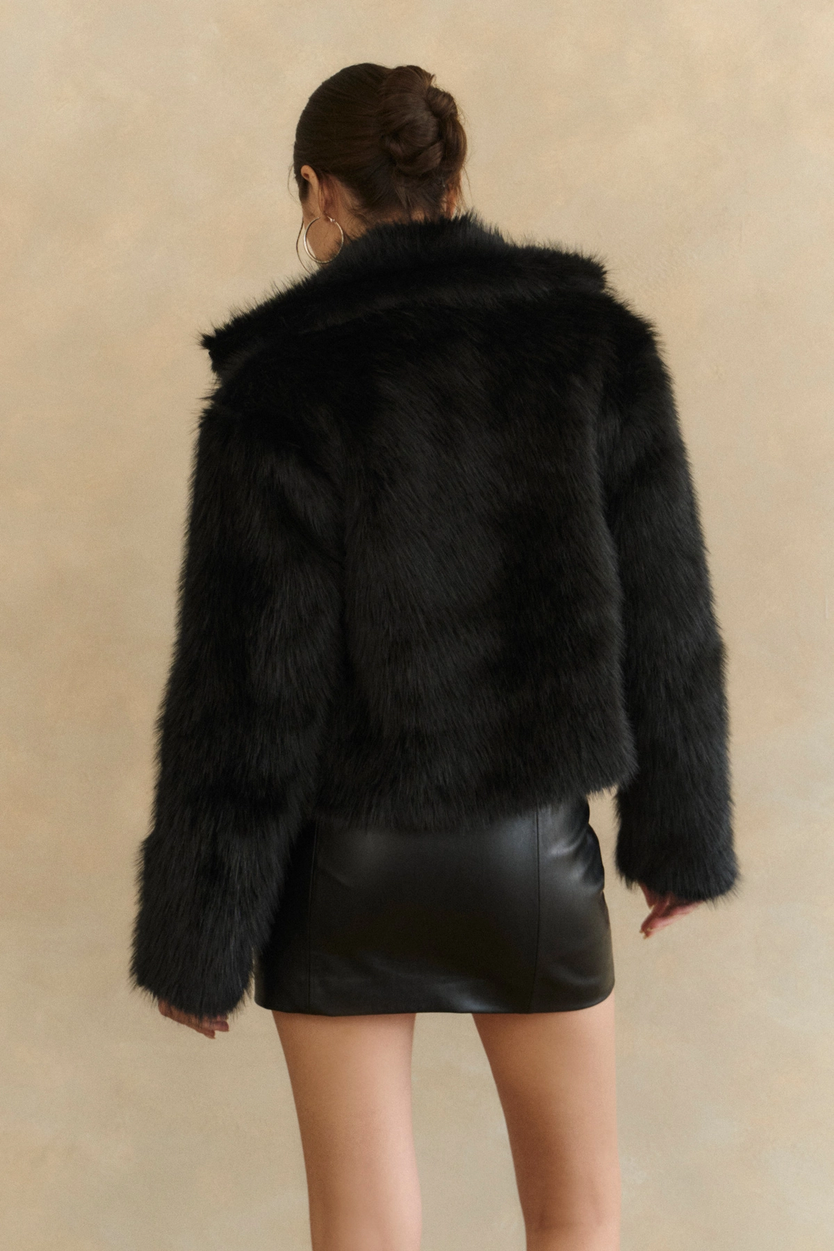 俐落翻領毛毛拉鏈外套-黑