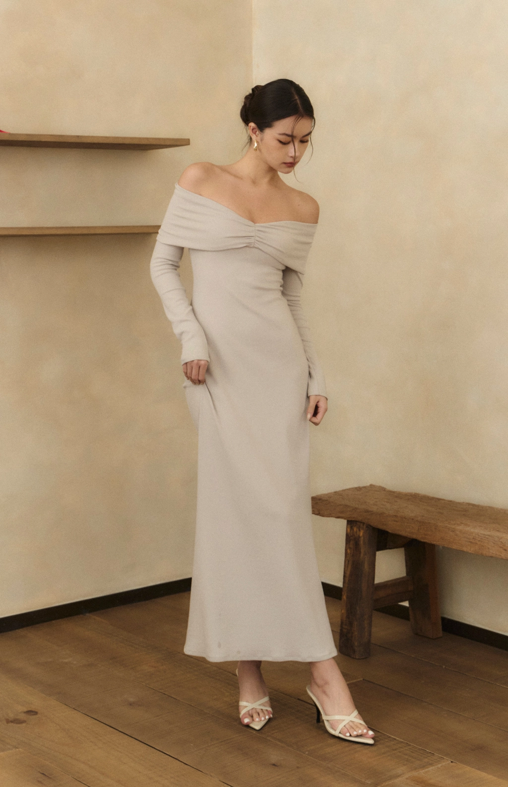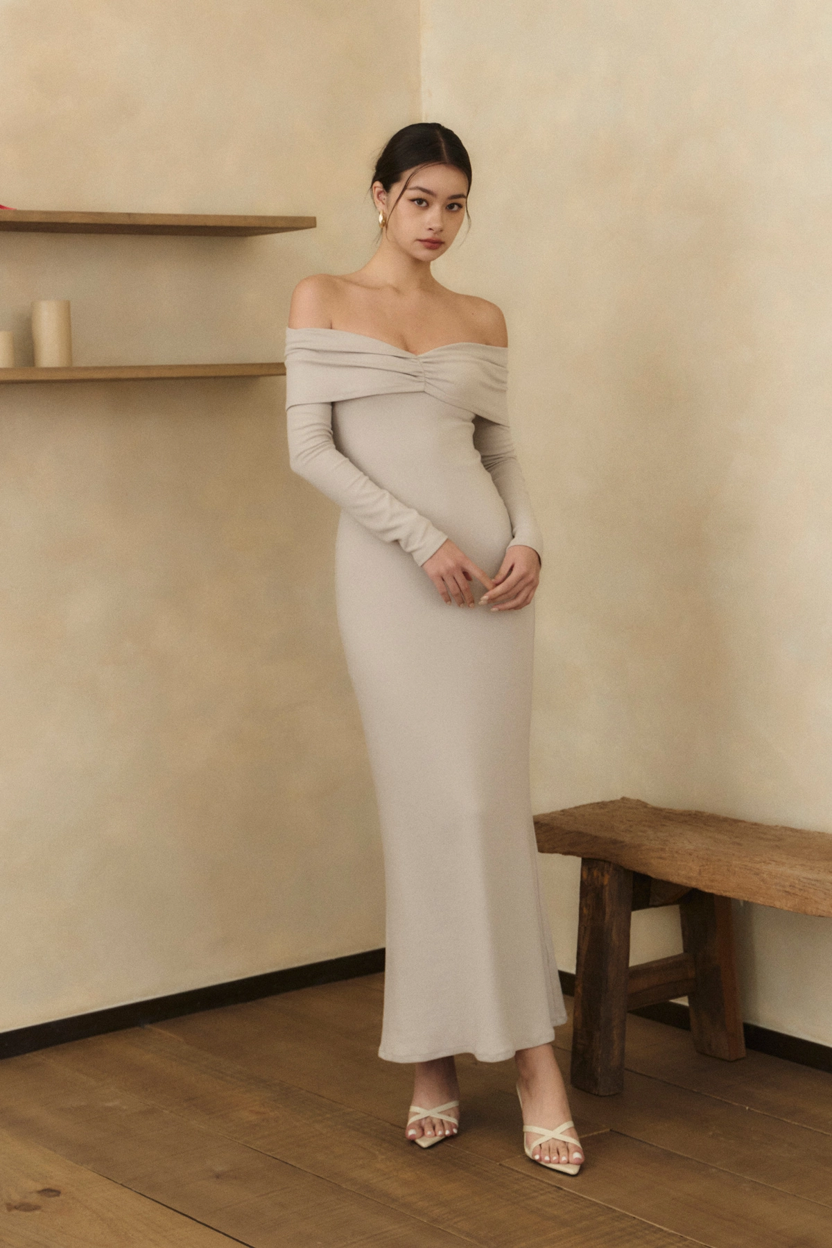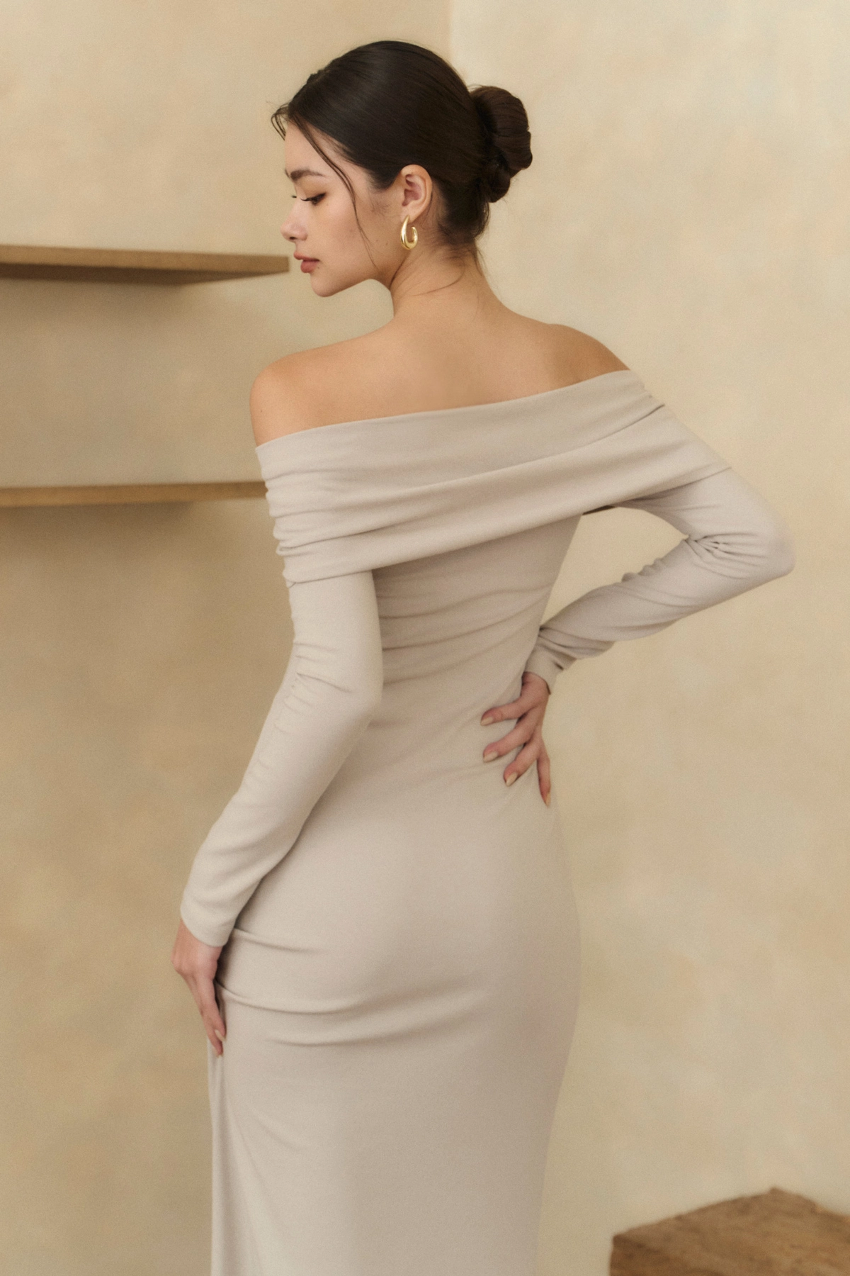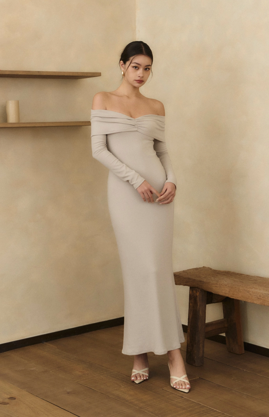 女神裸肩抓皺魚尾Bra Dress-淺灰