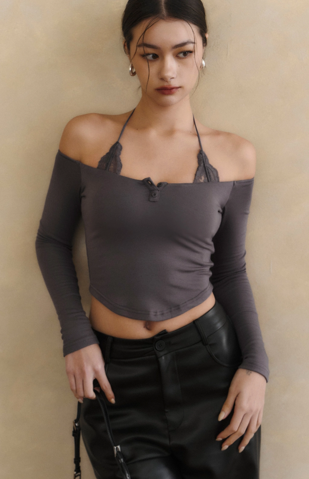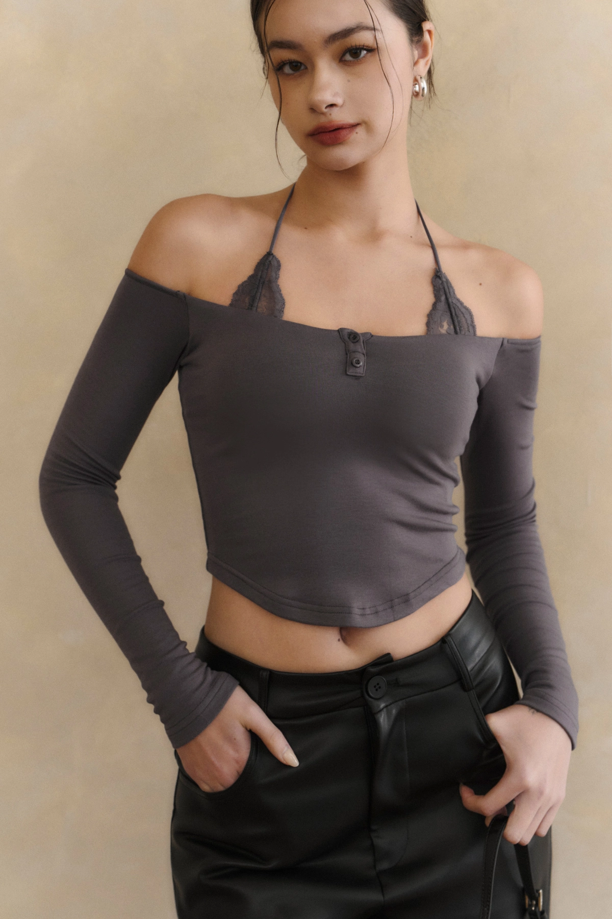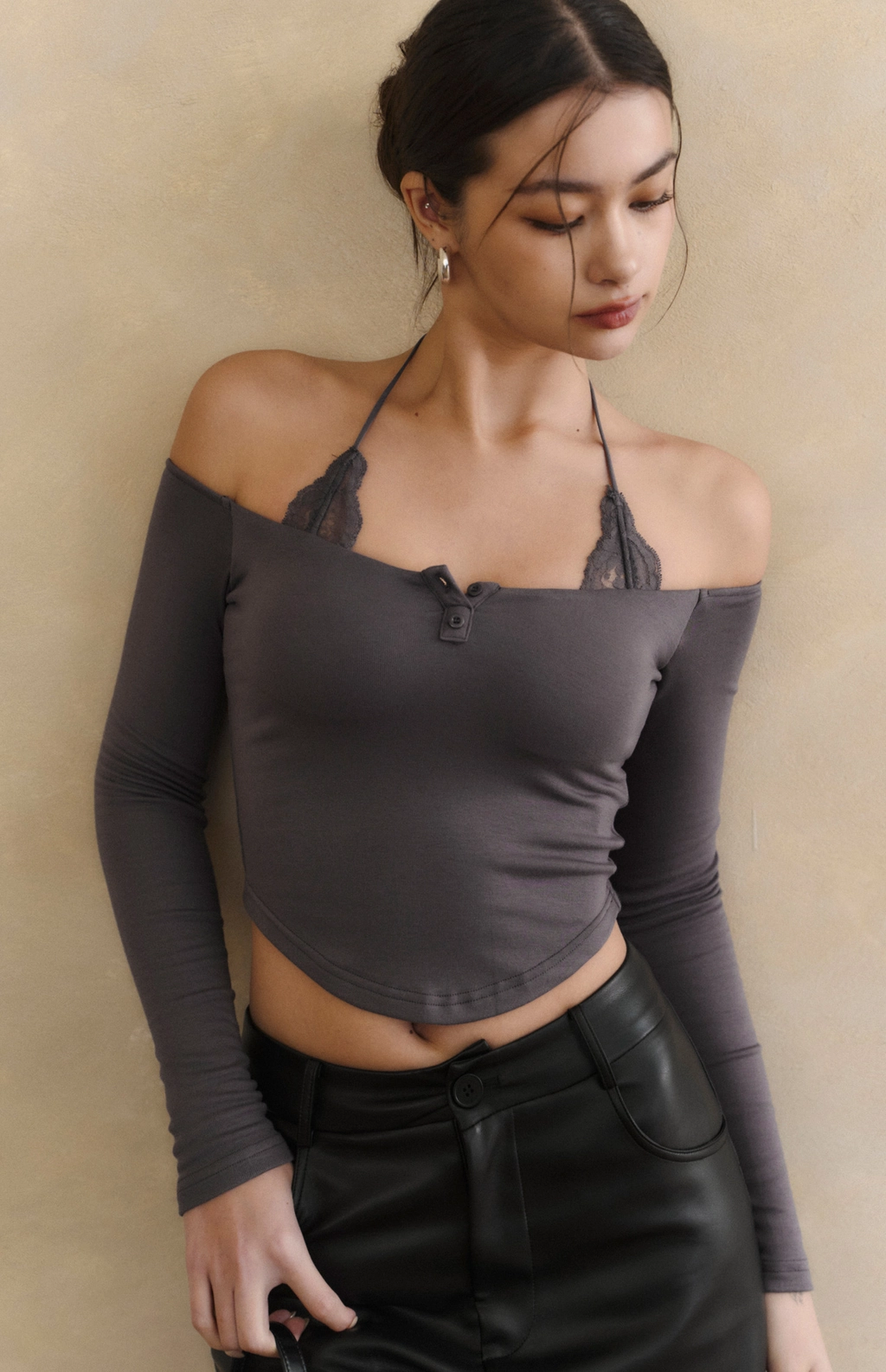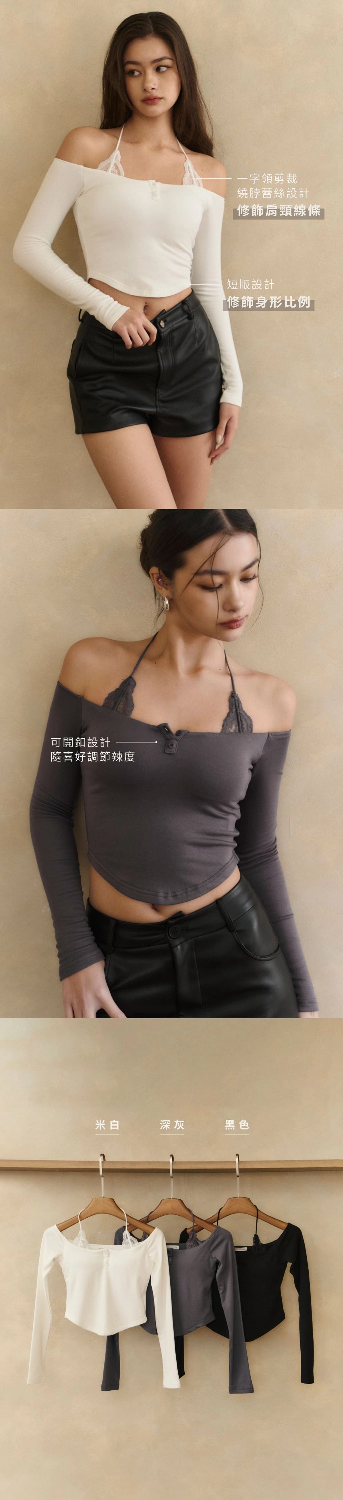 2.一字領剪裁x繞脖蕾絲設計,修飾肩頸線條