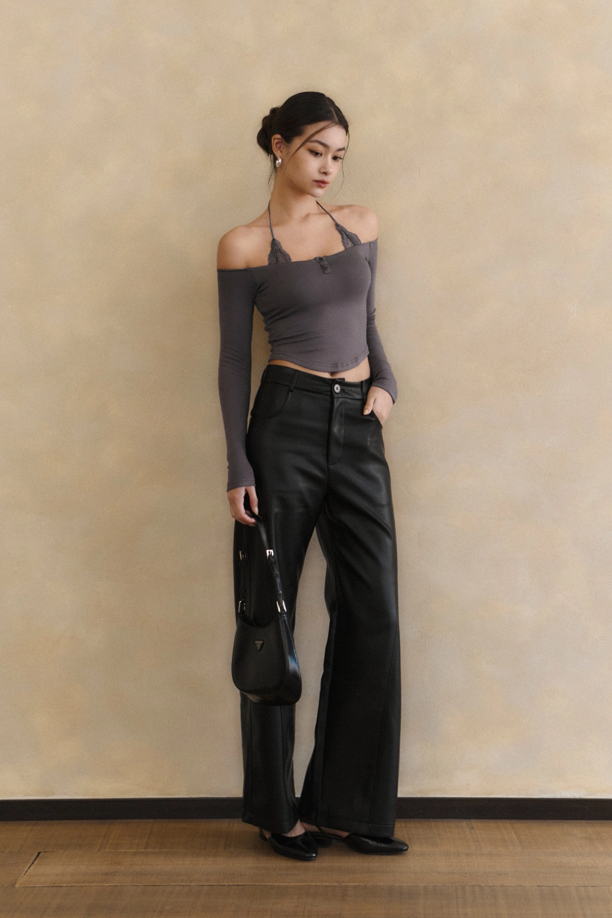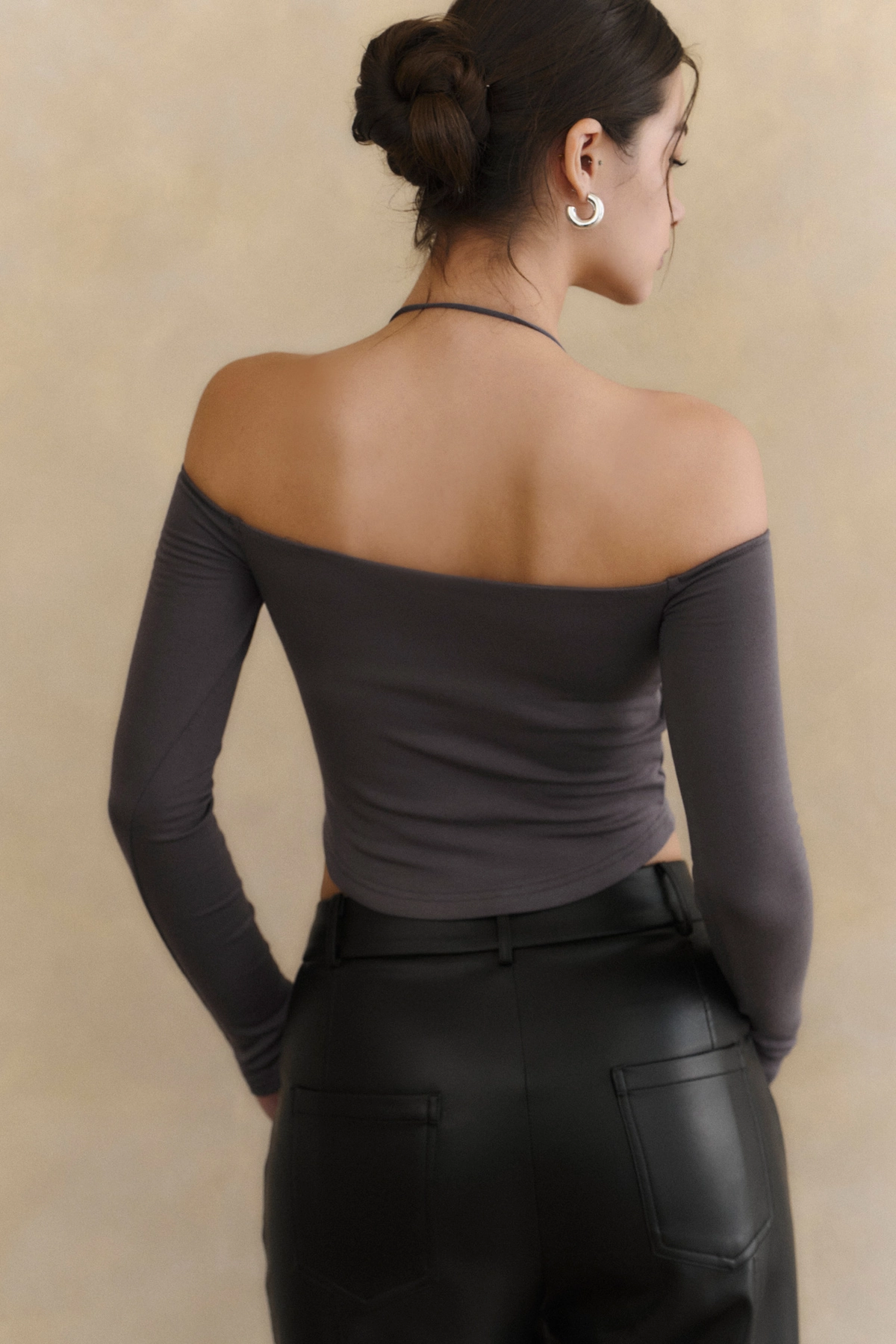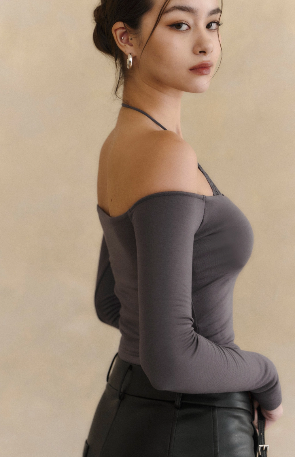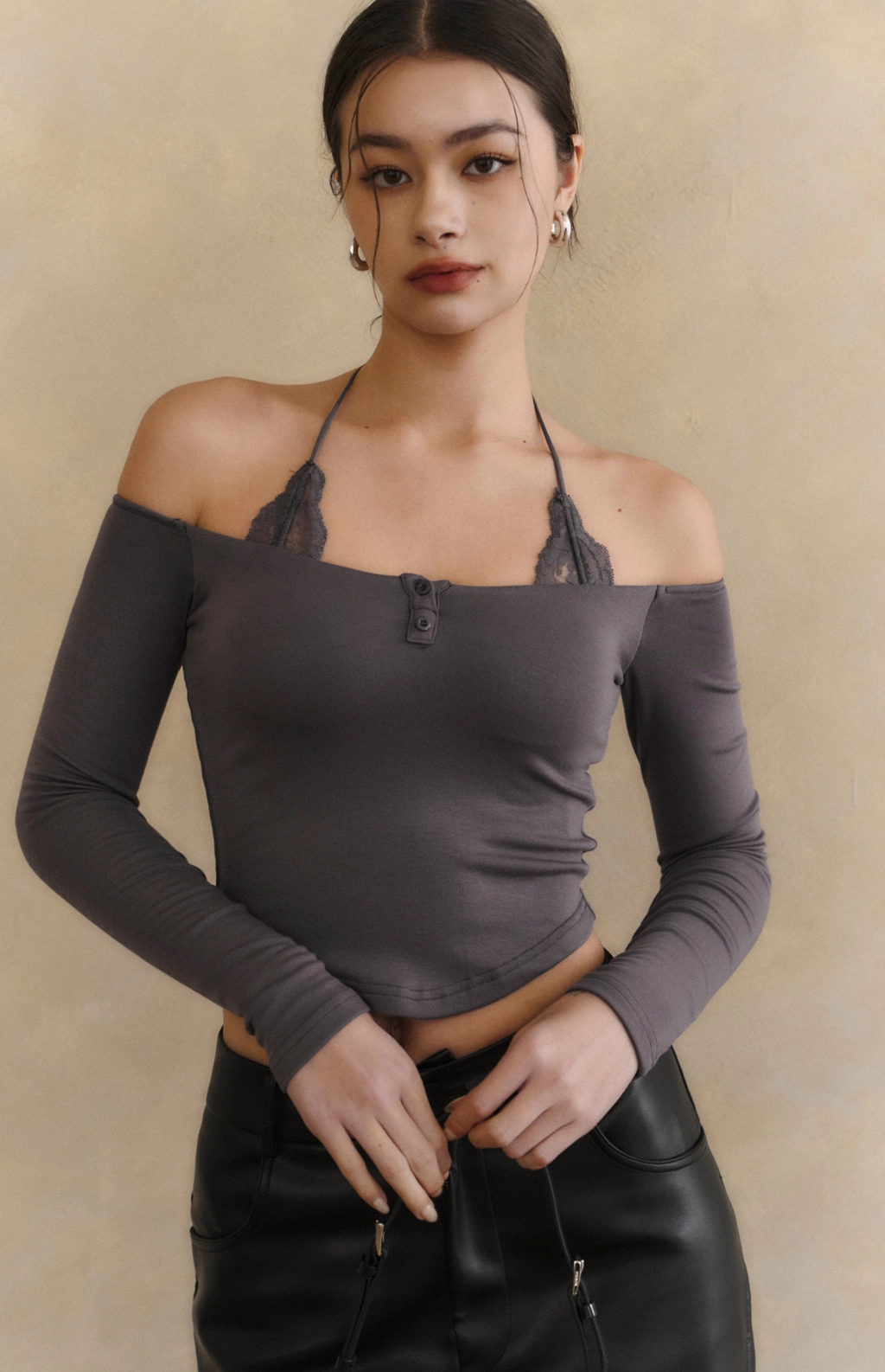 2.一字領剪裁x繞脖蕾絲設計,修飾肩頸線條