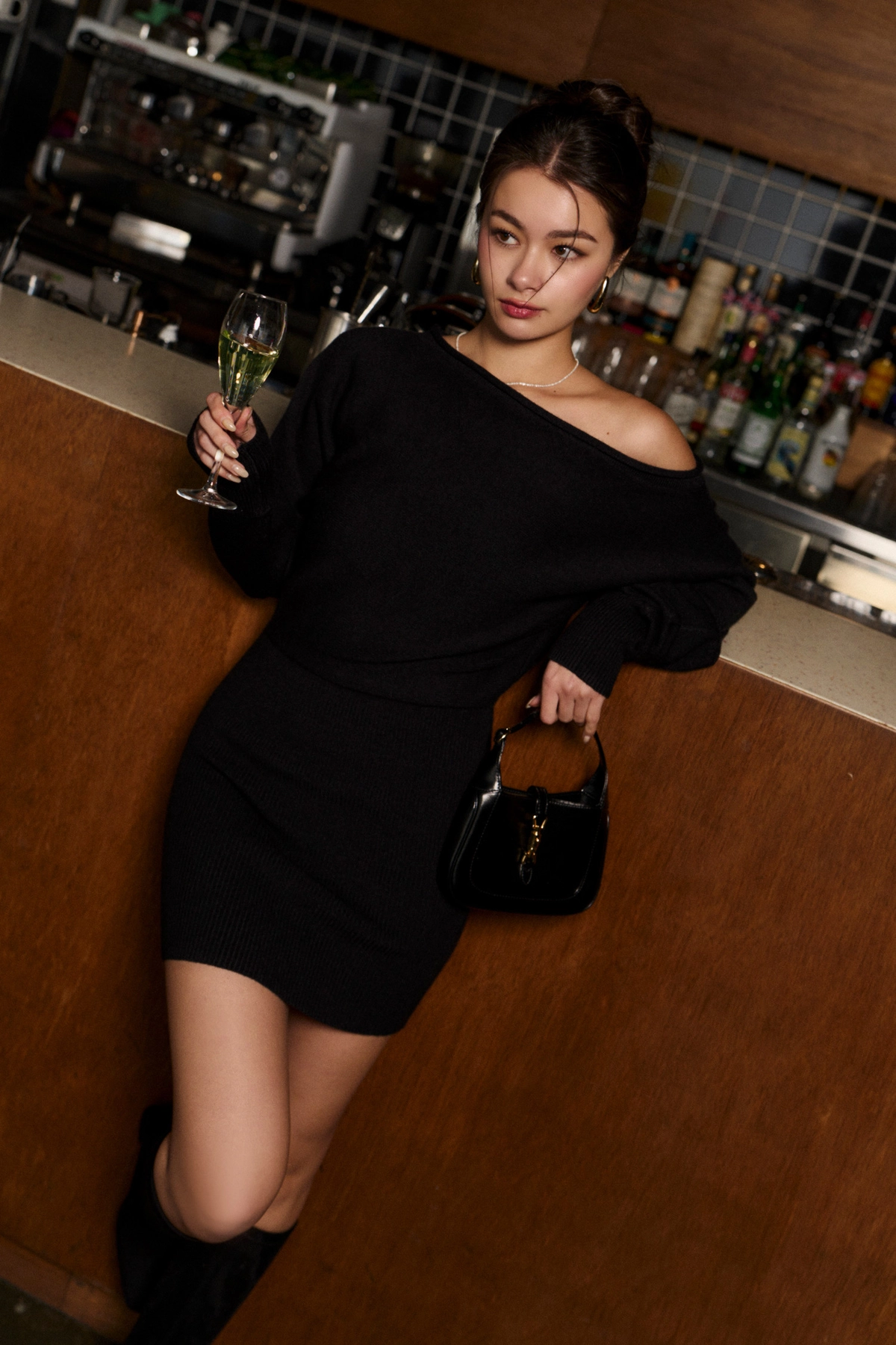 慵懶針織長袖包臀洋裝-黑
