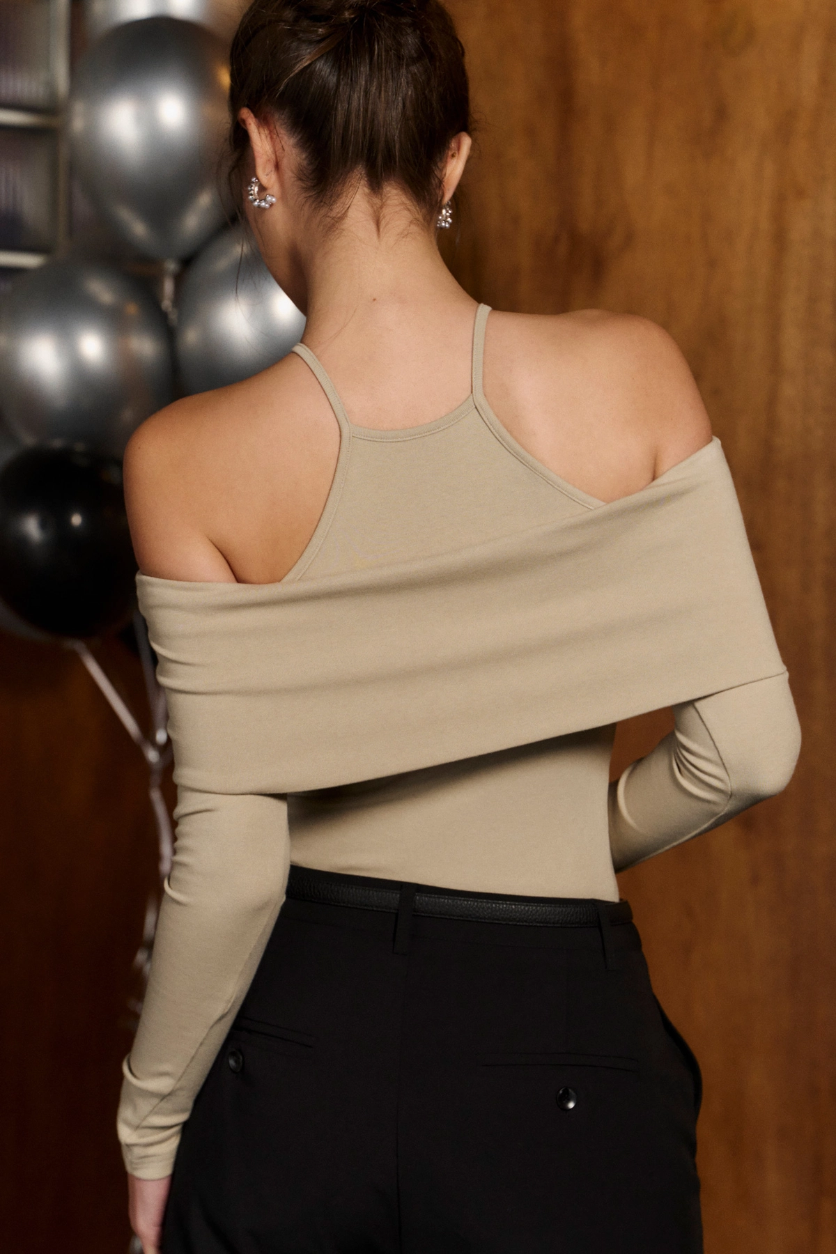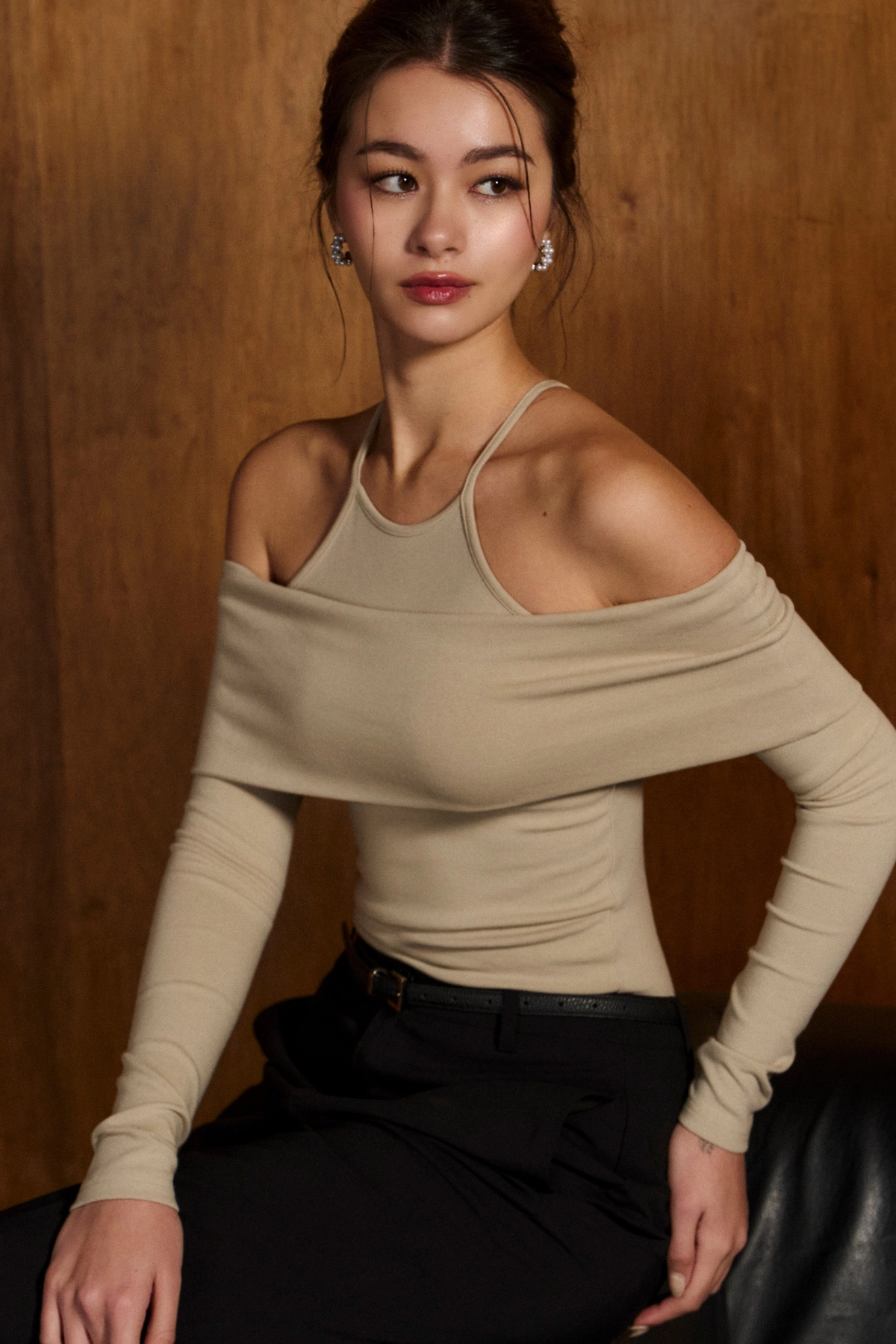 2.結合削肩+落翻領設計,一件完成層次穿搭
