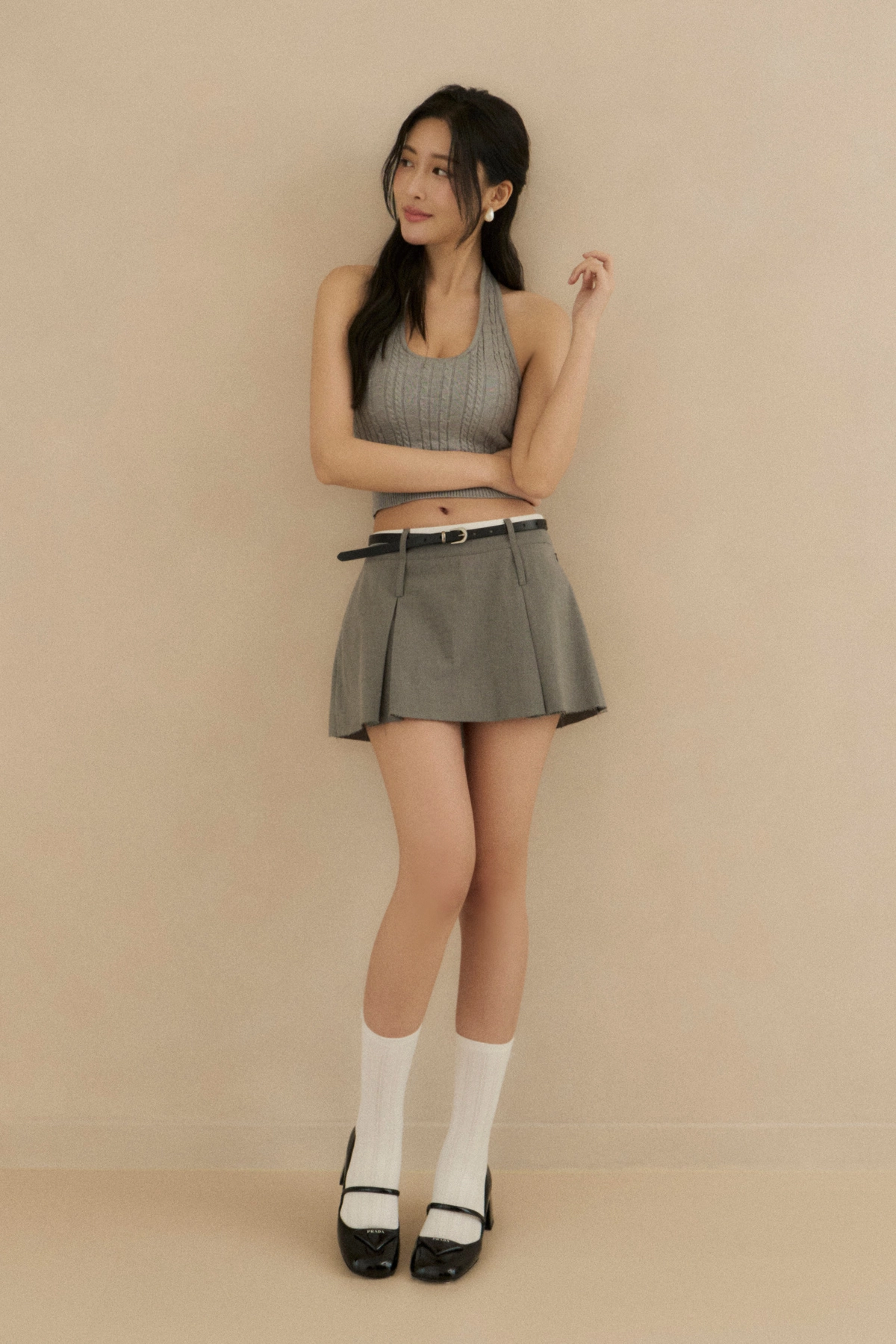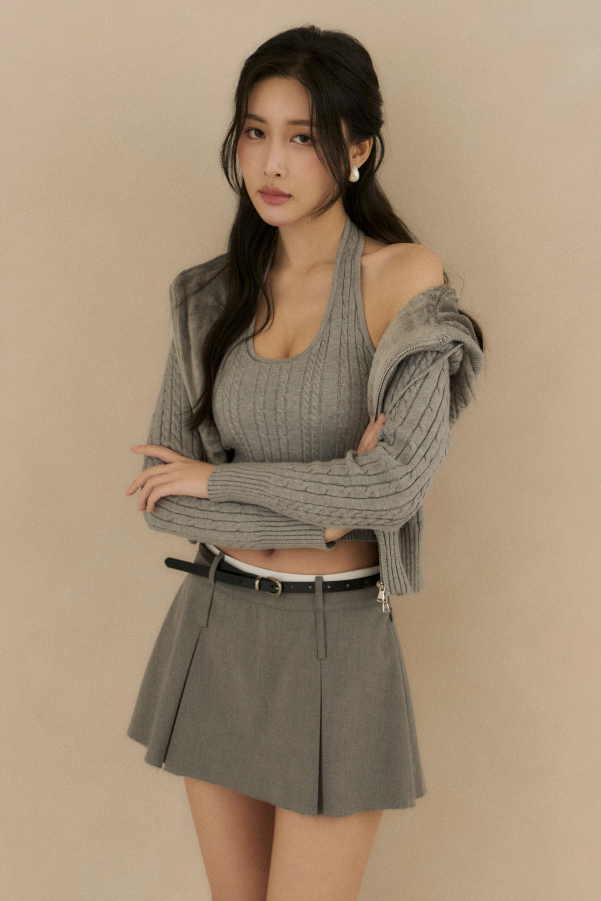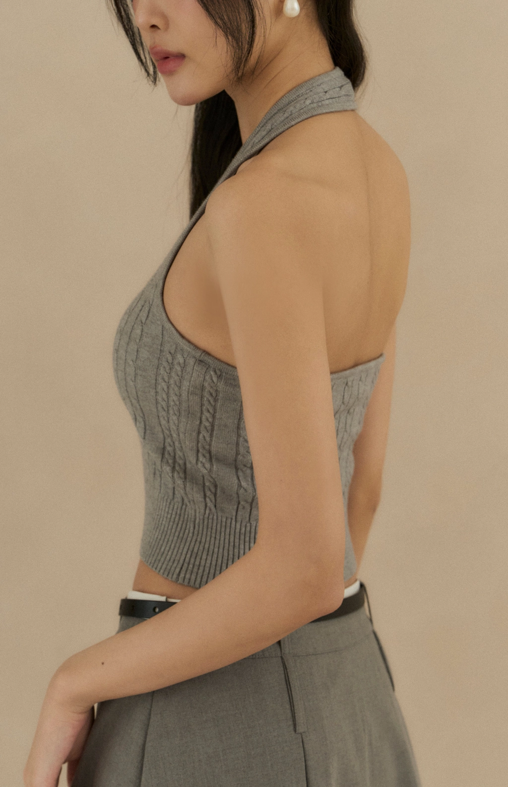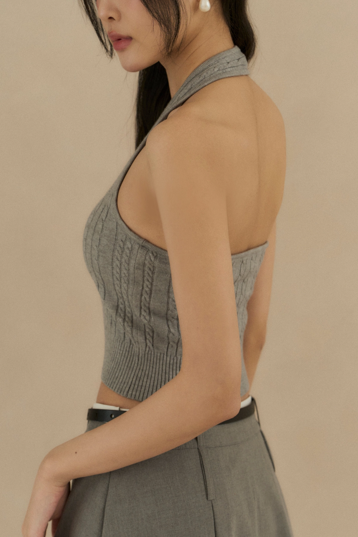 麻花針織繞脖Bra Top-淺花灰