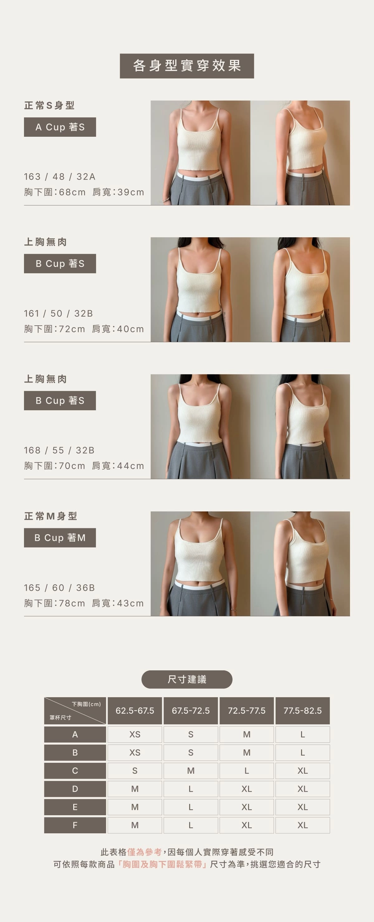 BRA TOP尺寸選購除了要參考罩杯外也需參考身高、體重