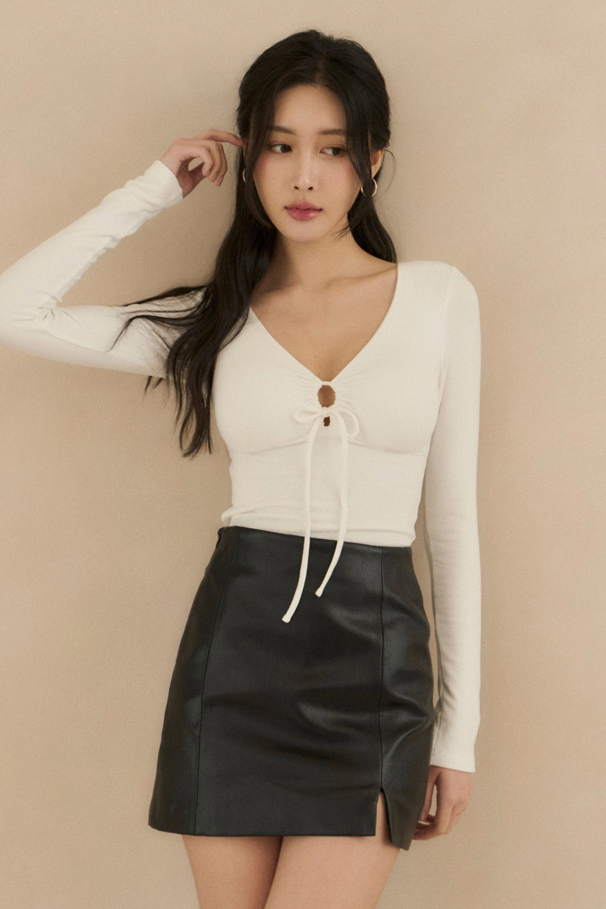 心機抽繩V領長袖Bra Top-白
