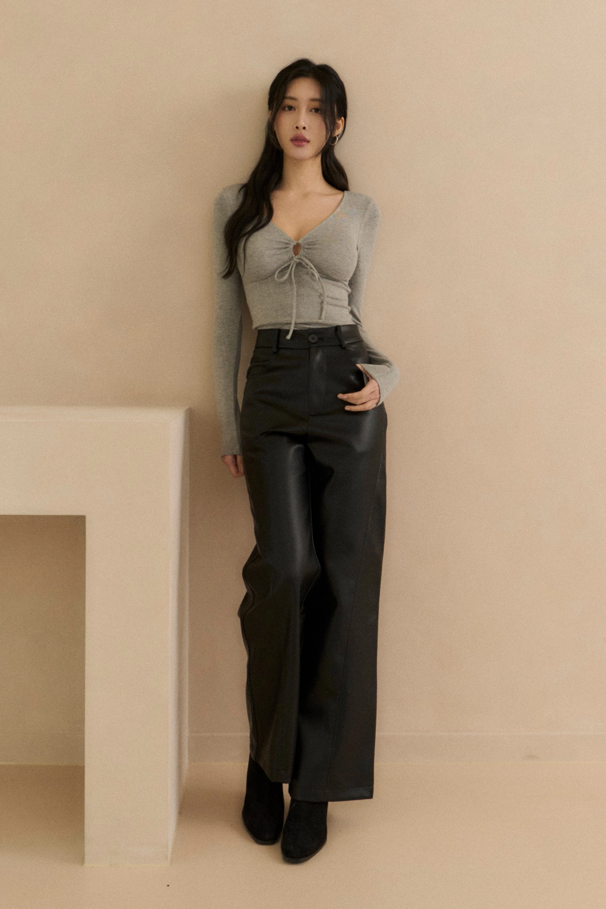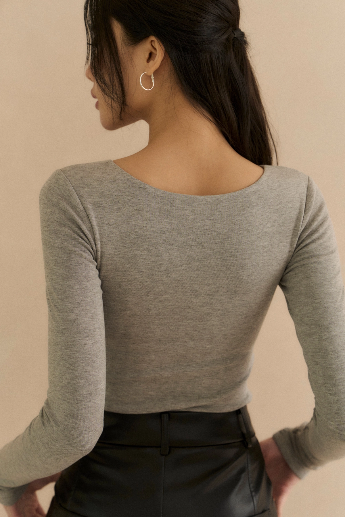 心機抽繩V領長袖Bra Top-淺灰