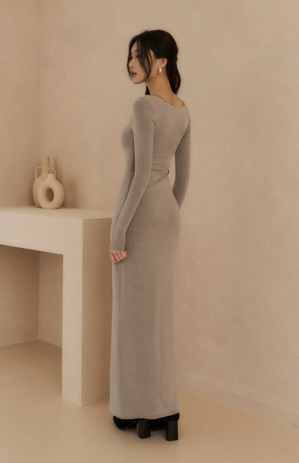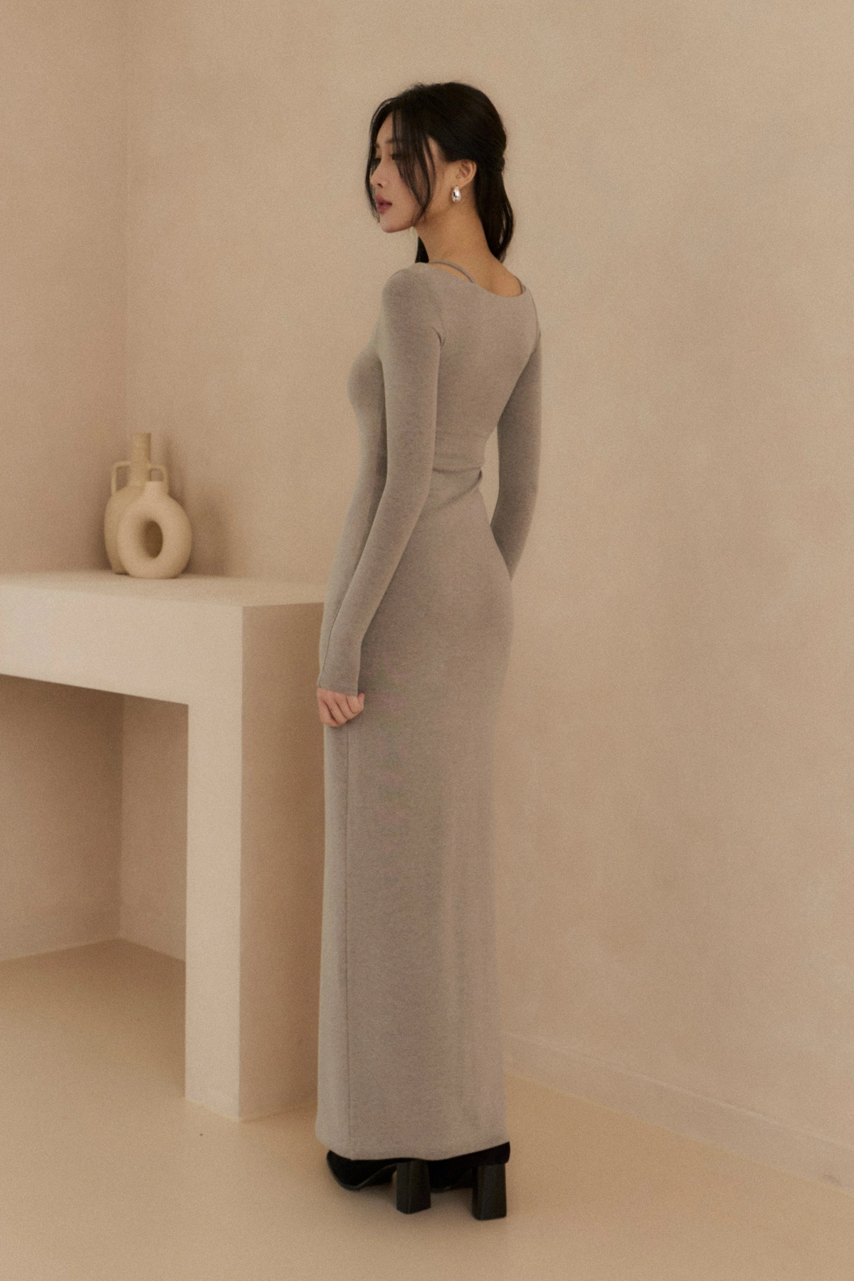 天絲方領假兩件修身Bra Dress-花灰