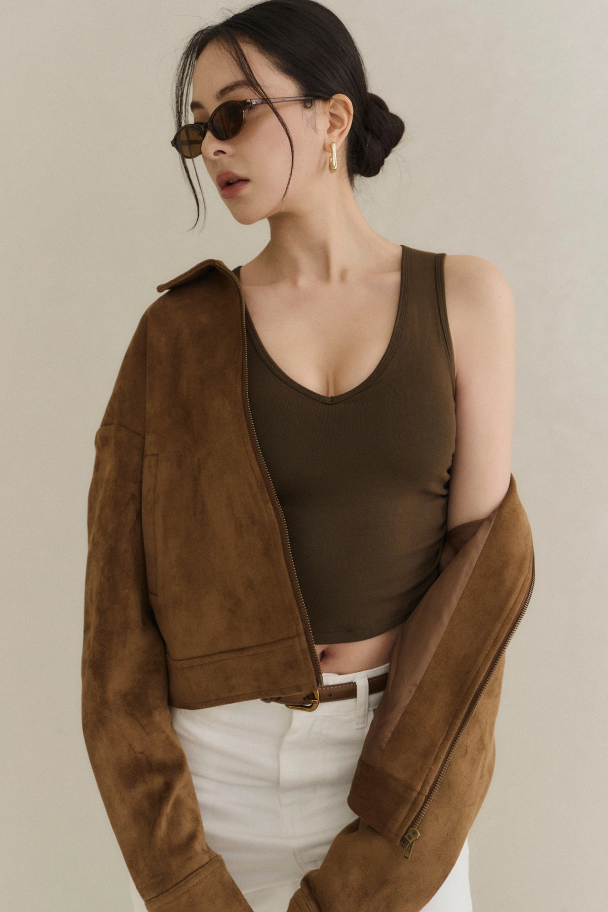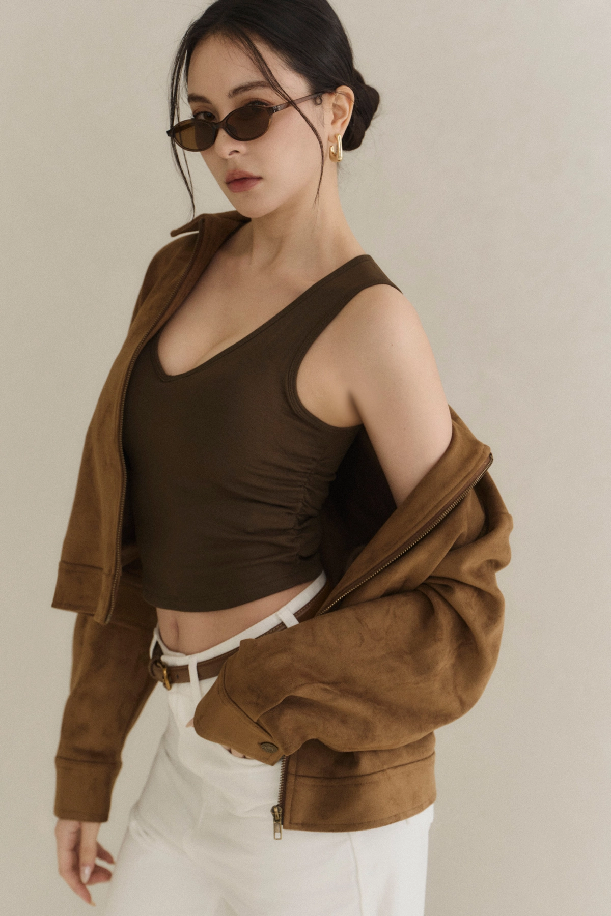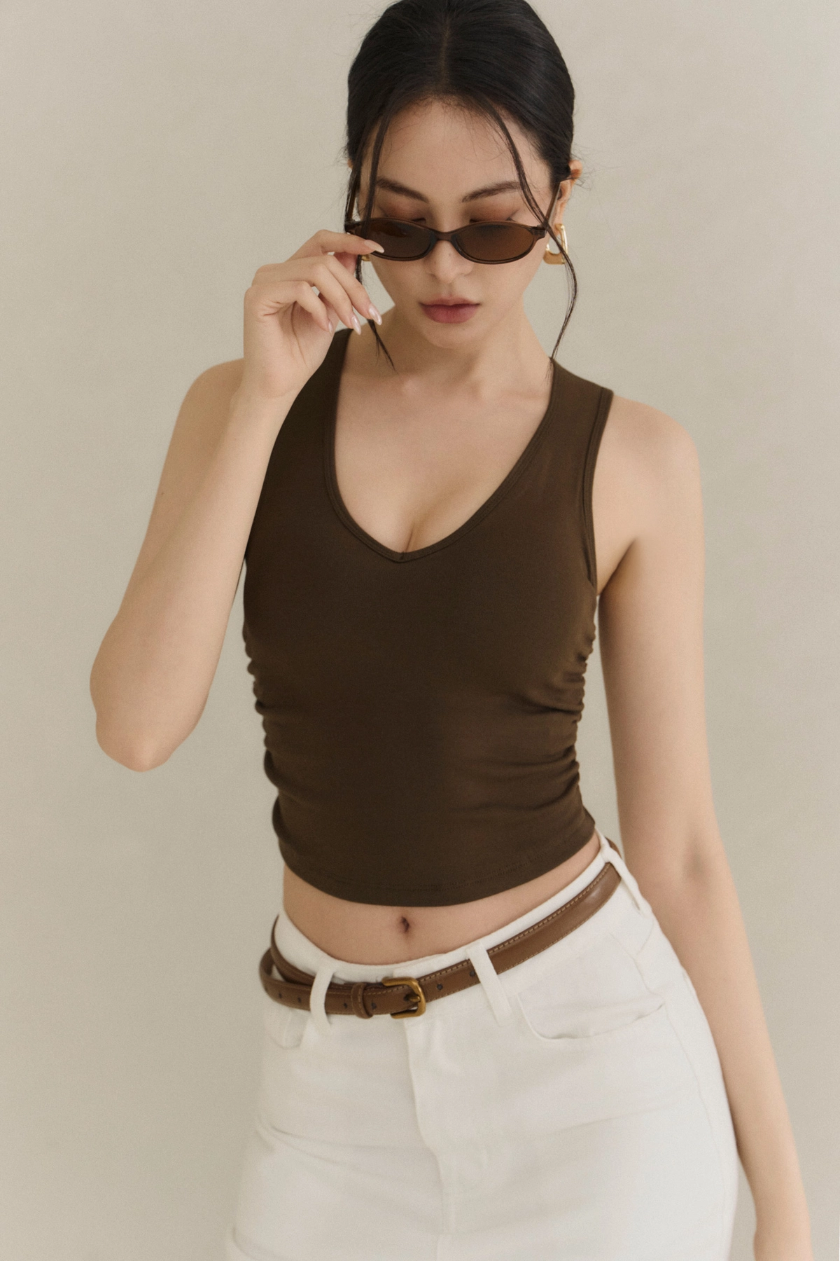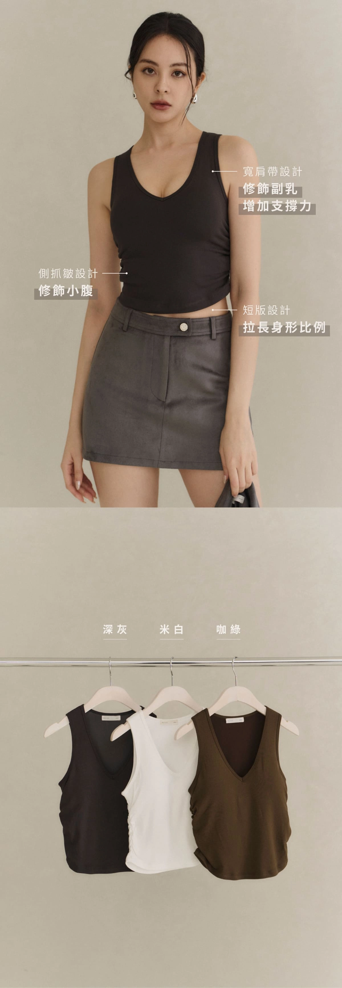 寬肩V領側抓皺磨毛Bra Top-咖綠