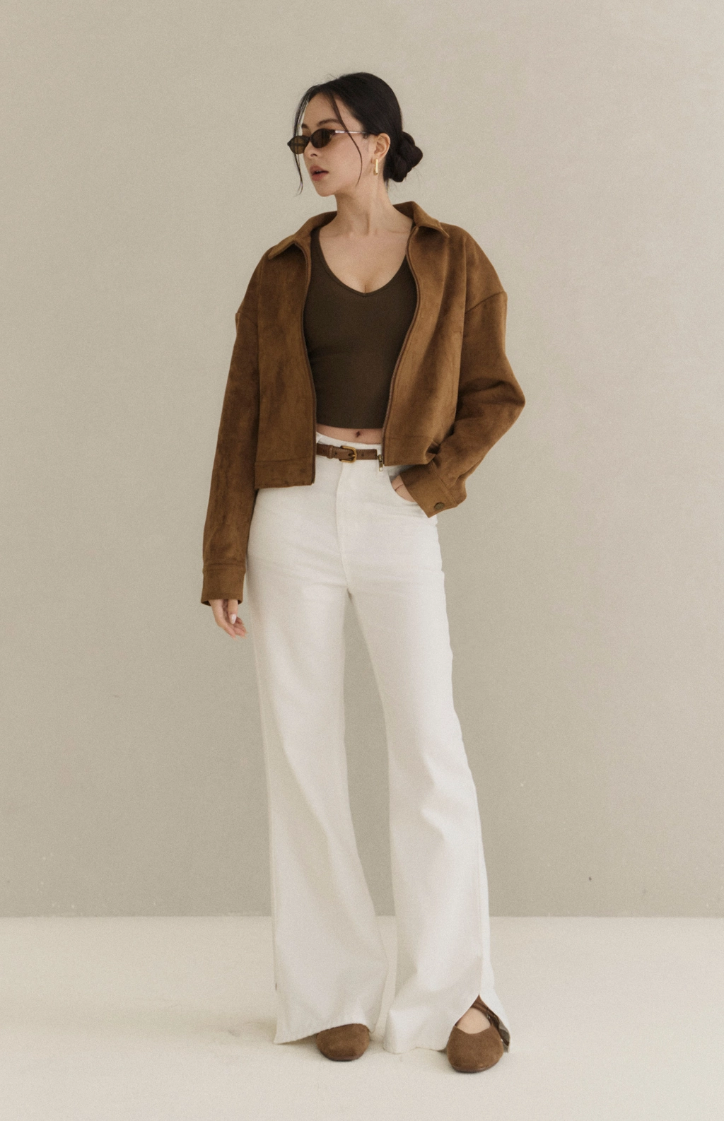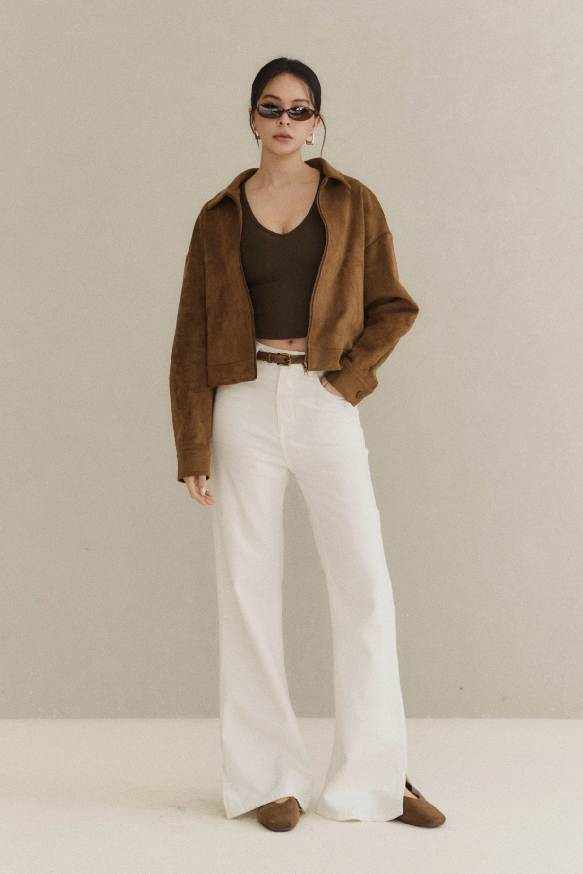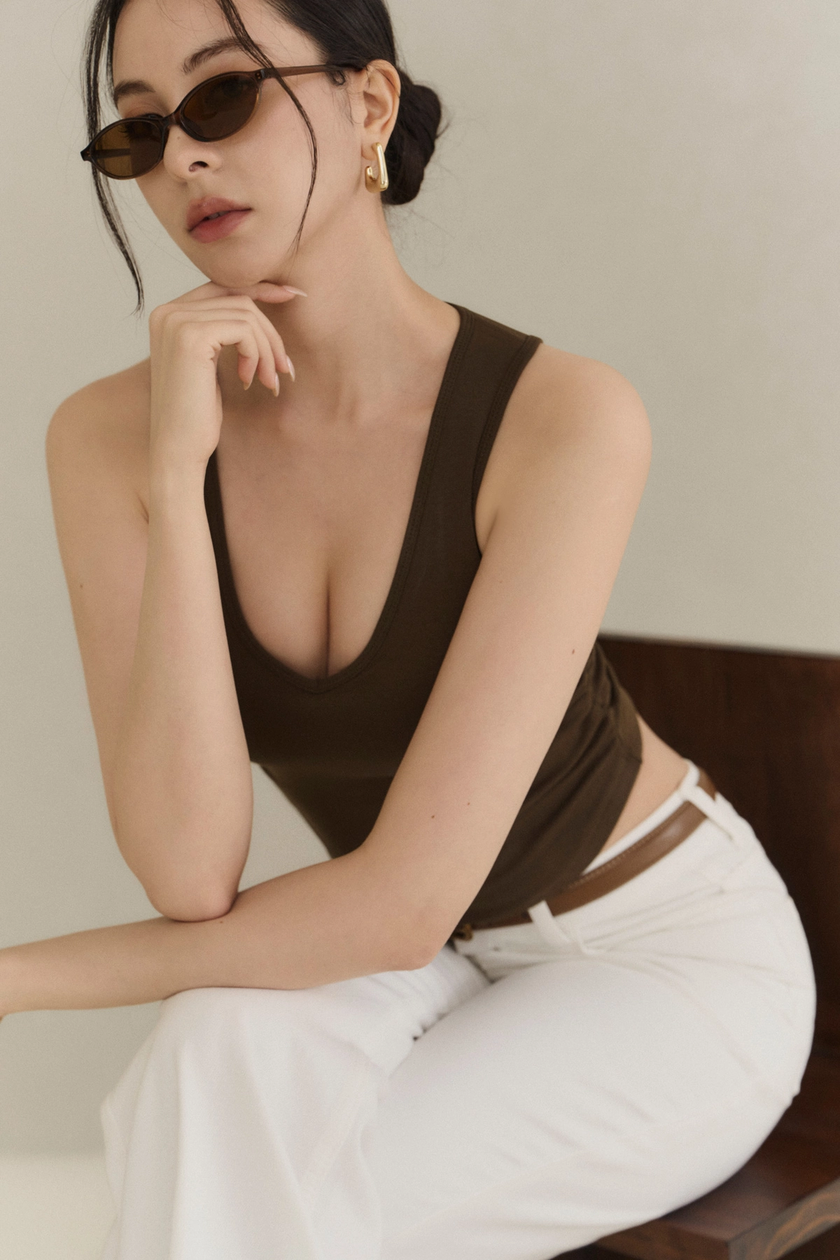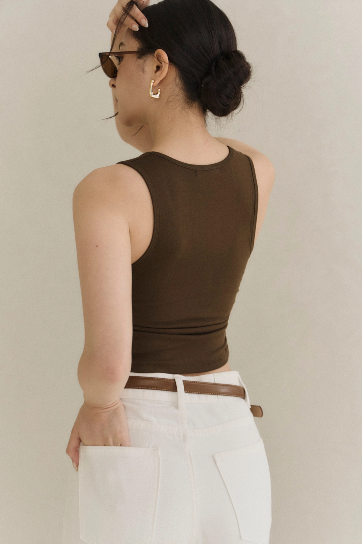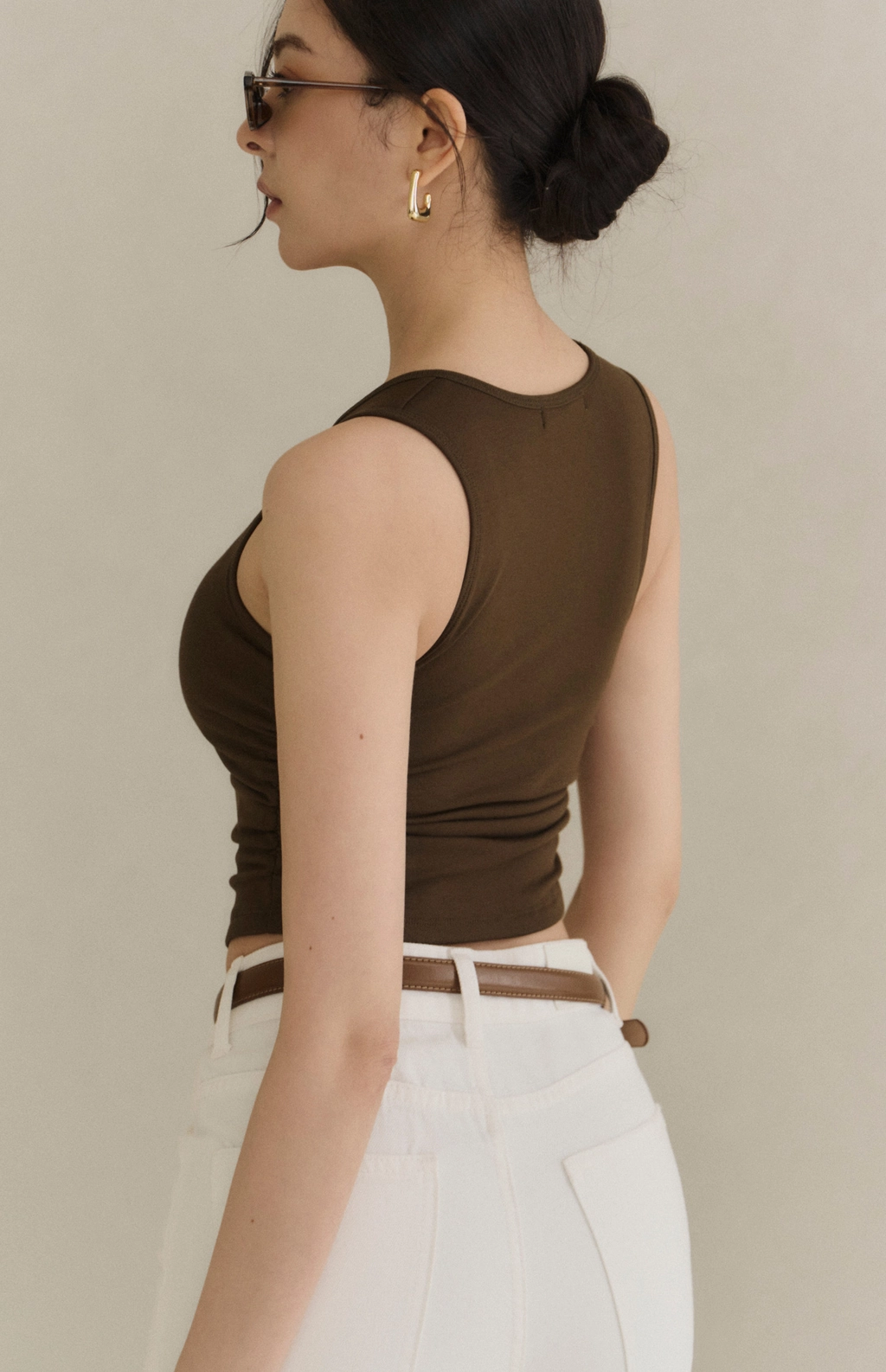 寬肩V領側抓皺磨毛Bra Top-咖綠
