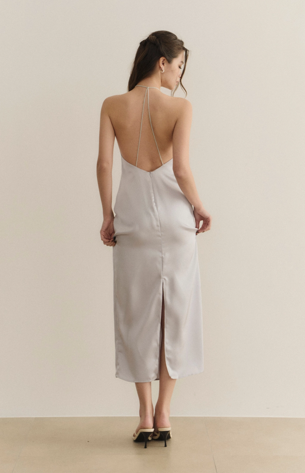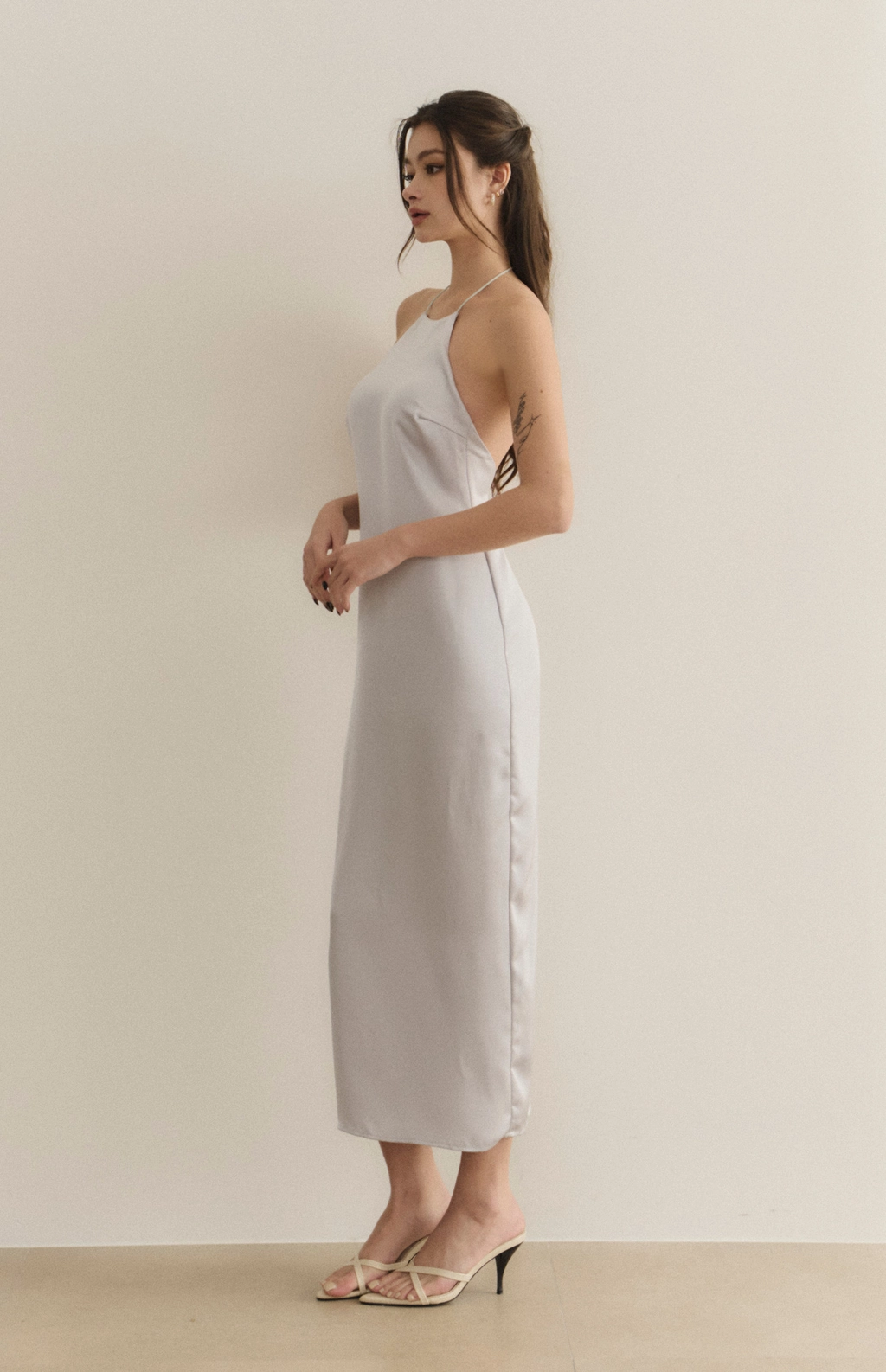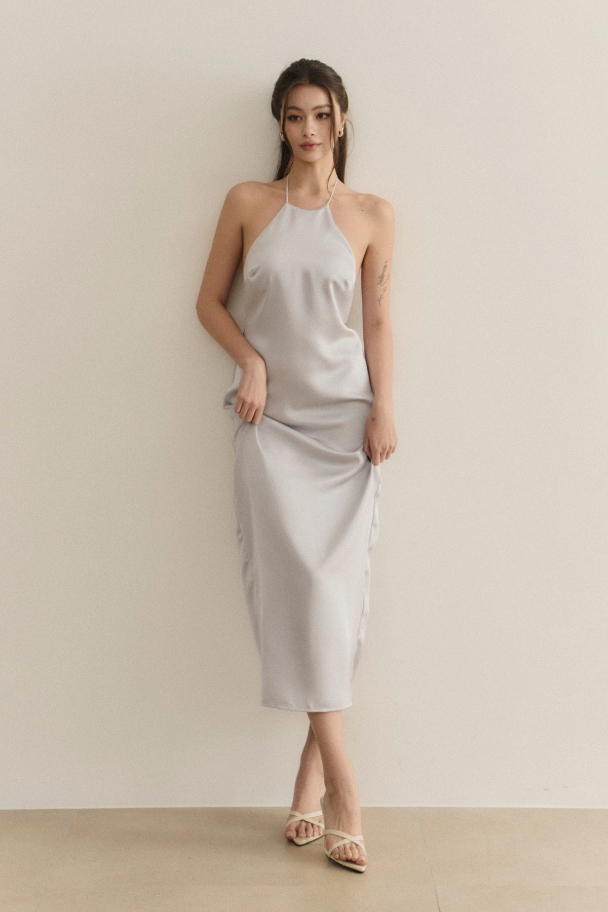 女神緞面削肩美背Bra Dress-冰川藍