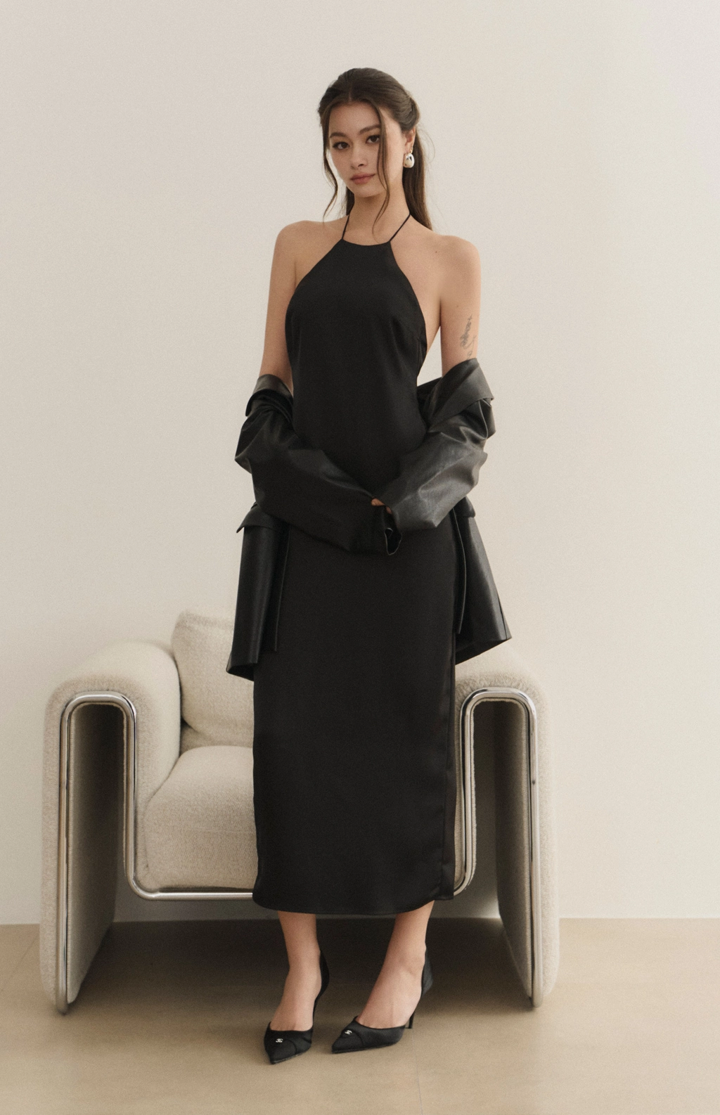 女神緞面削肩美背Bra Dress-黑