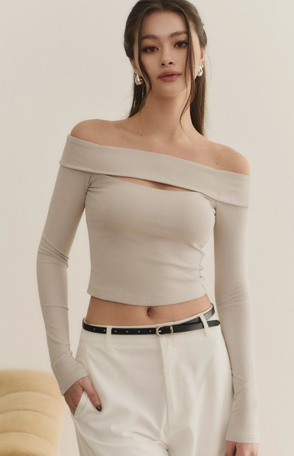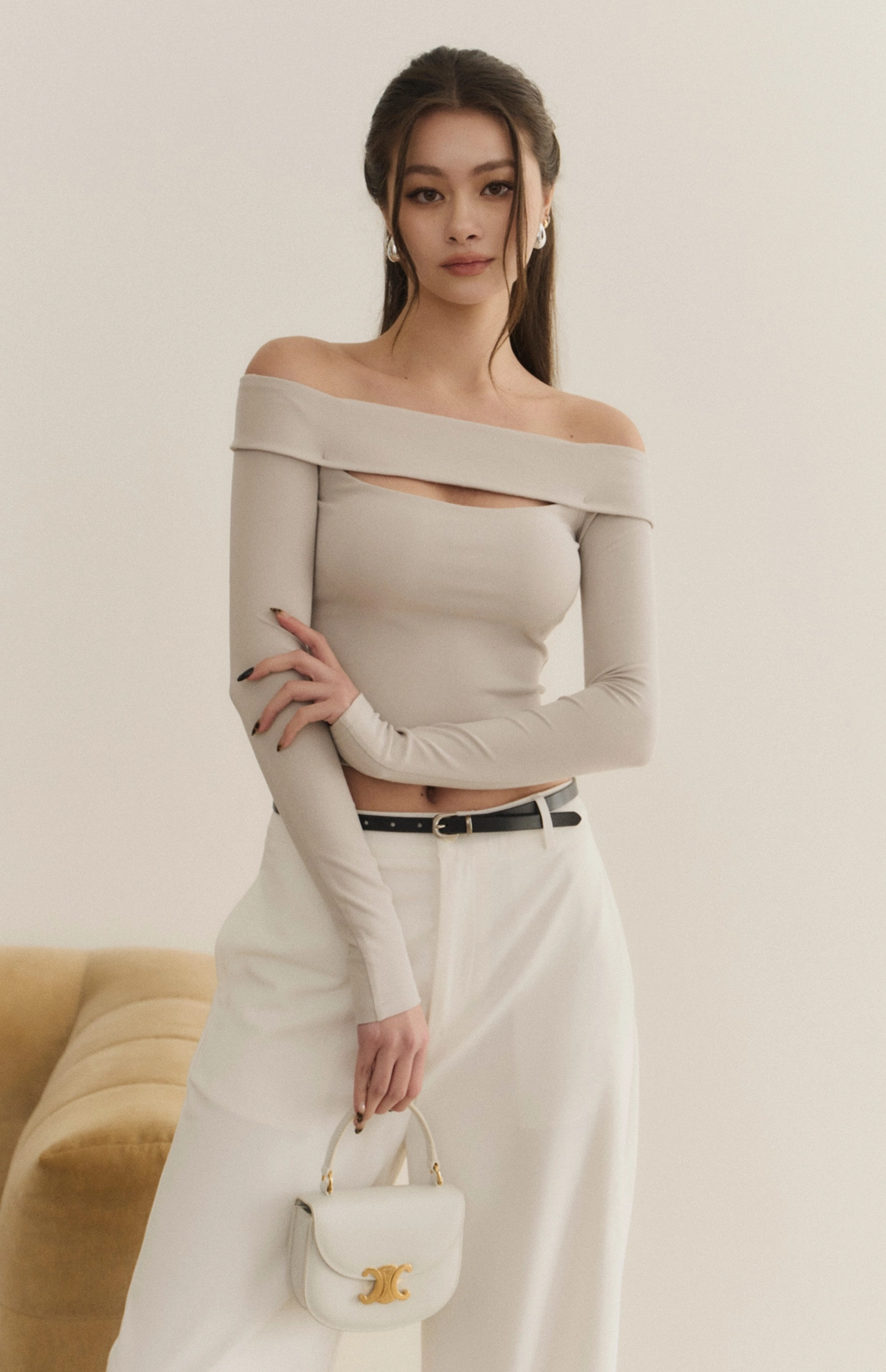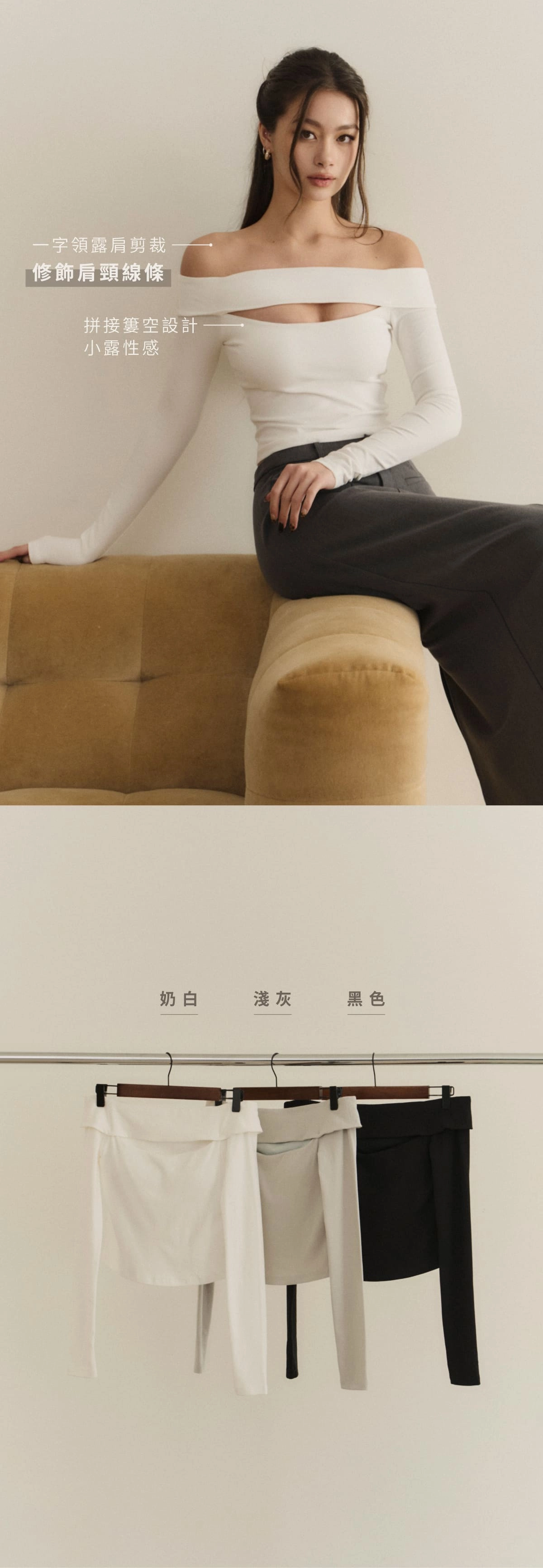 2.一字領露肩剪裁,修飾上身比例、展現肩頸線條