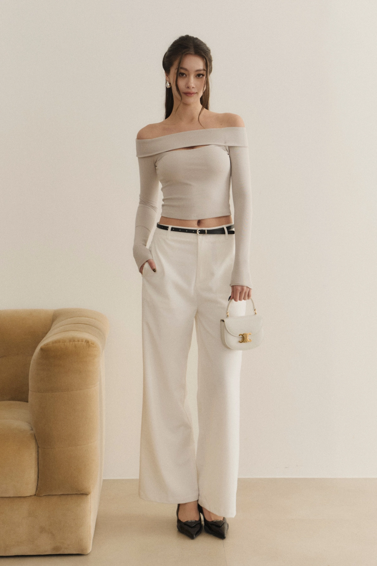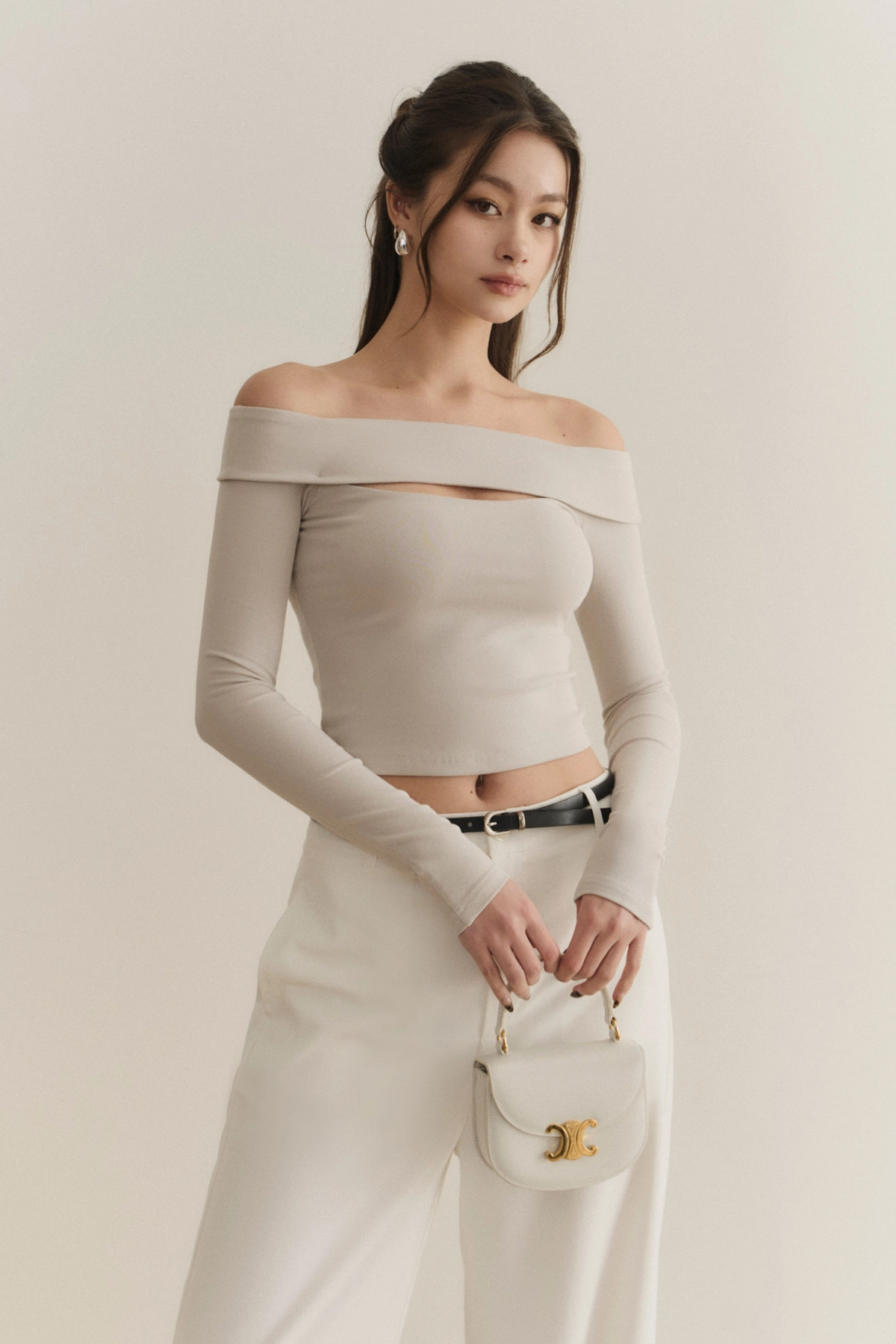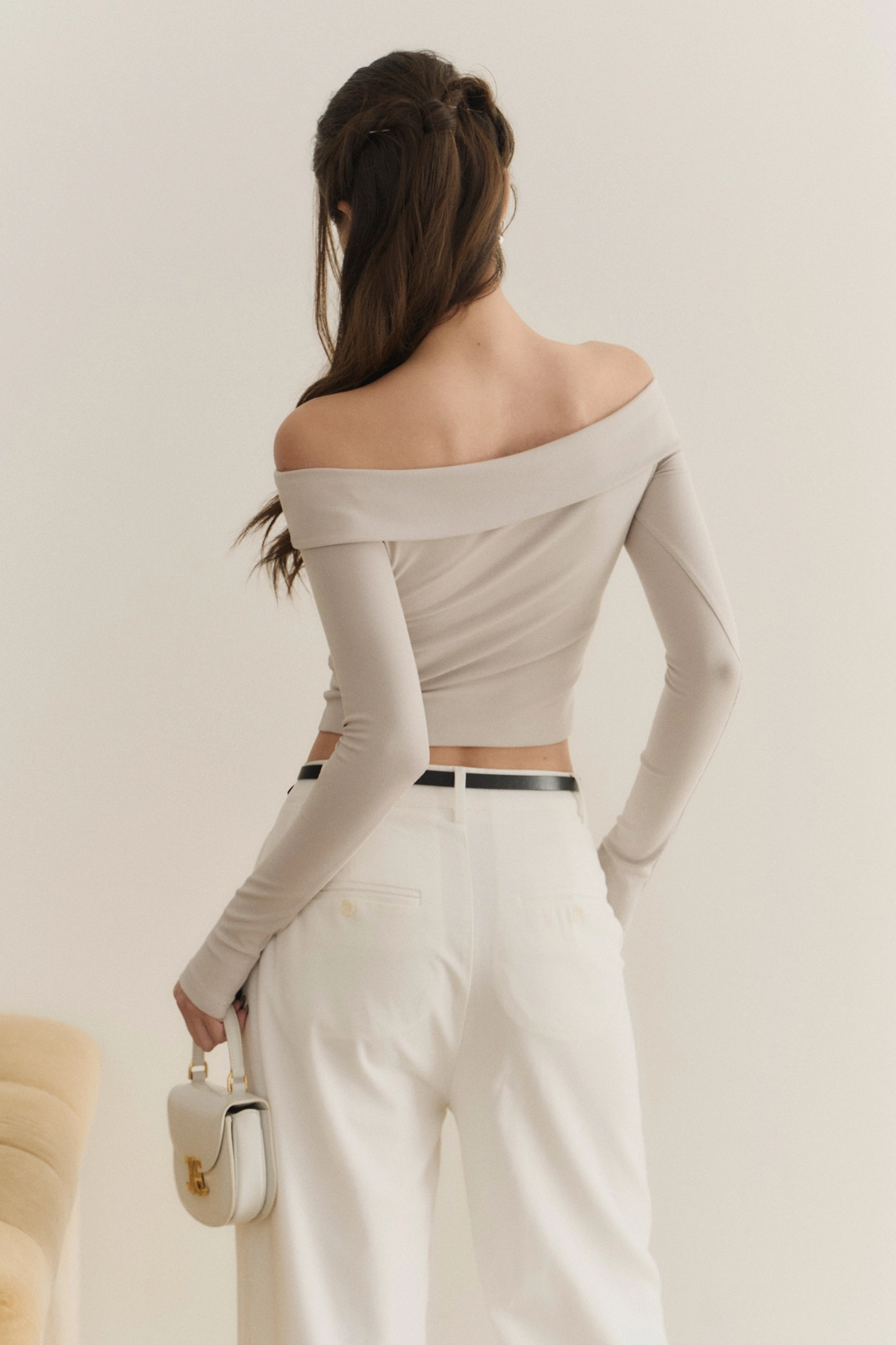 2.一字領露肩剪裁,修飾上身比例、展現肩頸線條